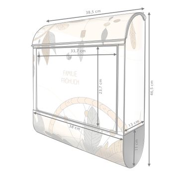DESIGN: Der Postkasten mit Motiv Motiv Boho Traumfänger hat ein sehr ansprechendes und ausgefallenes Design, damit entlocken Sie Ihren Nachbarn und dem Postboten ein Lächeln. Heben Sie Sich von der tristen grauen Masse ab, ohne auf Funktionalität zu verzichten. DETAILS: Der Postkasten besteht aus pulverbeschichtetem Stahl. Er ist 38x46x12,5cm groß. Das Motiv besteht aus einer wetter- und UV-resistenten Folie, die mit einem Schutzlaminat überzogen ist, sodass der Briefkasten zusätzlich vor Kratzern geschützt ist. Der Briefkasten wird mit Montagematerial, zusätzlich zwei Schlüssel sowie einer Bohrschablone geliefert. NUTZEN: Sie können diesen Briefkasten sowohl als Wandbriefkasten montieren oder einen passenden Ständer kaufen und als Standbriefkasten einbetonieren. Die Größe bietet genügend Platz für Sendungen aller Art, der Einwurf fasst auch größere A4 Sendungen. BANJADO: Ihr Briefkasten wird in Sachsen in einer kleinen Manufaktur von Hand veredelt. Die Motivfolie ist lösungsmittelfrei und schutzlaminiert für einen langen Halt. Wir legen großen Wert auf die Verbindung von Funktionalität und Design. Sie erhalten Handarbeit aus Sachsen.