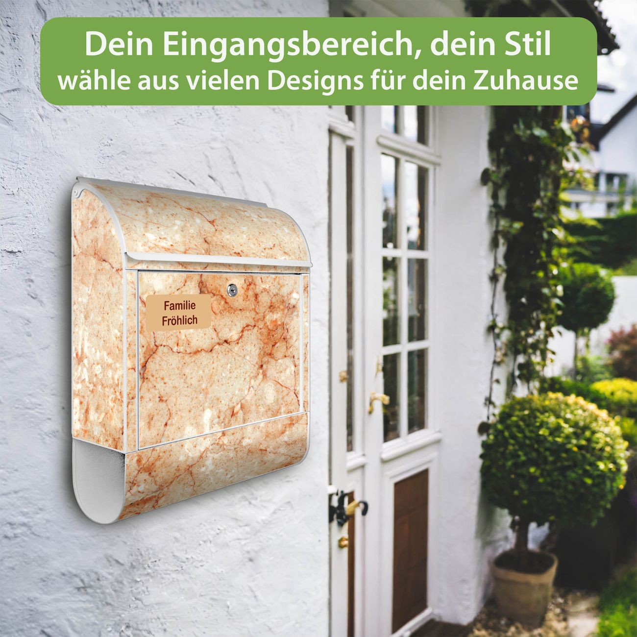 DESIGN: Der Postkasten mit Motiv Motiv Brauner Marmor Struktur hat ein sehr ansprechendes und ausgefallenes Design, damit entlocken Sie Ihren Nachbarn und dem Postboten ein Lächeln. Heben Sie Sich von der tristen grauen Masse ab, ohne auf Funktionalität zu verzichten. DETAILS: Der Postkasten besteht aus pulverbeschichtetem Stahl. Er ist 38x46x12,5cm groß. Das Motiv besteht aus einer wetter- und UV-resistenten Folie, die mit einem Schutzlaminat überzogen ist, sodass der Briefkasten zusätzlich vor Kratzern geschützt ist. Der Briefkasten wird mit Montagematerial, zusätzlich zwei Schlüssel sowie einer Bohrschablone geliefert. NUTZEN: Sie können diesen Briefkasten sowohl als Wandbriefkasten montieren oder einen passenden Ständer kaufen und als Standbriefkasten einbetonieren. Die Größe bietet genügend Platz für Sendungen aller Art, der Einwurf fasst auch größere A4 Sendungen. BANJADO: Ihr Briefkasten wird in Sachsen in einer kleinen Manufaktur von Hand veredelt. Die Motivfolie ist lösungsmittelfrei und schutzlaminiert für einen langen Halt. Wir legen großen Wert auf die Verbindung von Funktionalität und Design. Sie erhalten Handarbeit aus Sachsen.