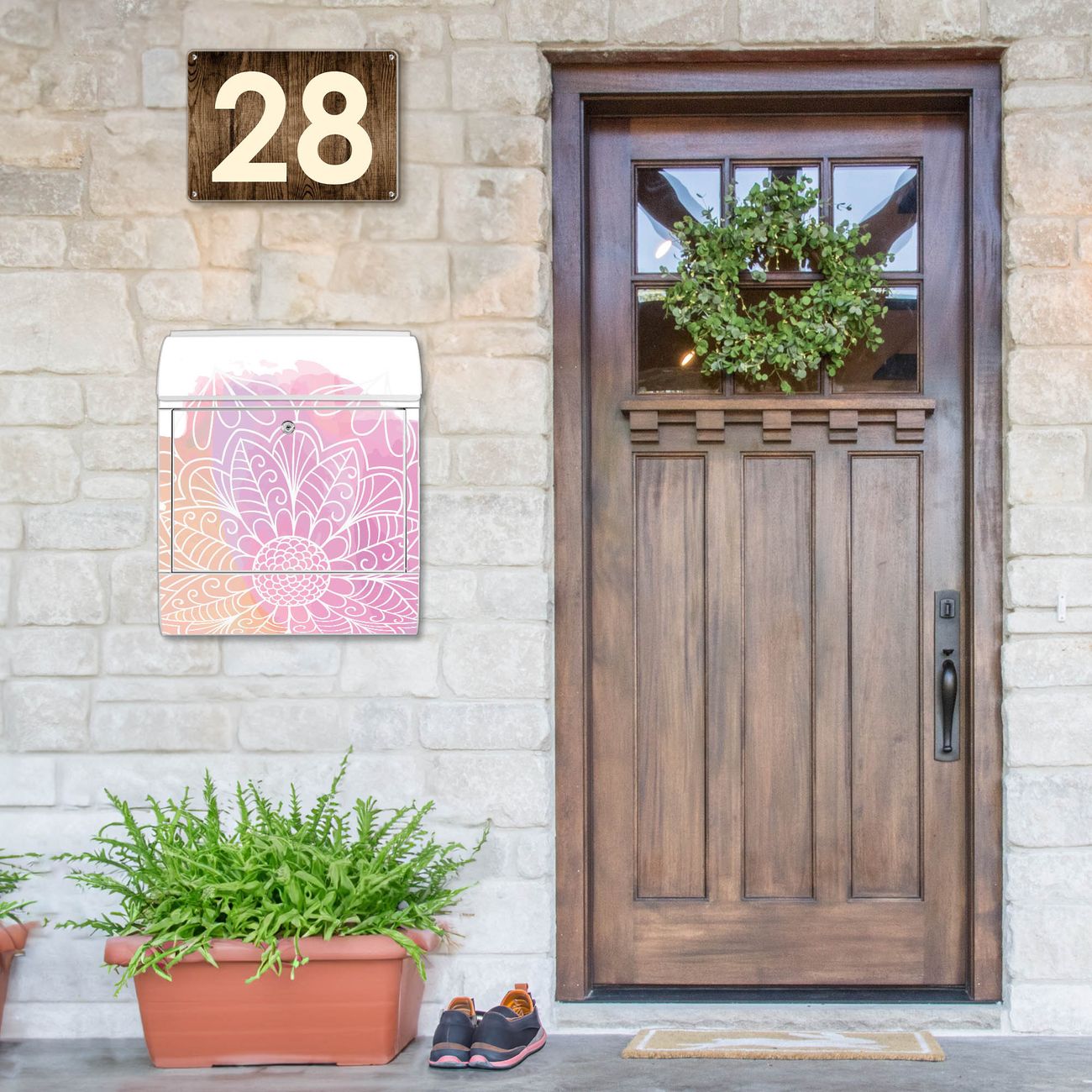 DESIGN: Der Postkasten mit Motiv Motiv Buntes Mandala hat ein sehr ansprechendes und ausgefallenes Design, damit entlocken Sie Ihren Nachbarn und dem Postboten ein Lächeln. Heben Sie Sich von der tristen grauen Masse ab, ohne auf Funktionalität zu verzichten. DETAILS: Der Postkasten besteht aus pulverbeschichtetem Stahl. Er ist 38x46x12,5cm groß. Das Motiv besteht aus einer wetter- und UV-resistenten Folie, die mit einem Schutzlaminat überzogen ist, sodass der Briefkasten zusätzlich vor Kratzern geschützt ist. Der Briefkasten wird mit Montagematerial, zusätzlich zwei Schlüssel sowie einer Bohrschablone geliefert. NUTZEN: Sie können diesen Briefkasten sowohl als Wandbriefkasten montieren oder einen passenden Ständer kaufen und als Standbriefkasten einbetonieren. Die Größe bietet genügend Platz für Sendungen aller Art, der Einwurf fasst auch größere A4 Sendungen. BANJADO: Ihr Briefkasten wird in Sachsen in einer kleinen Manufaktur von Hand veredelt. Die Motivfolie ist lösungsmittelfrei und schutzlaminiert für einen langen Halt. Wir legen großen Wert auf die Verbindung von Funktionalität und Design. Sie erhalten Handarbeit aus Sachsen.