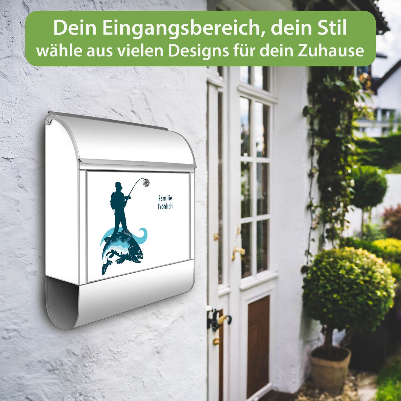 DESIGN: Der Postkasten mit Motiv Motiv Der Angler hat ein sehr ansprechendes und ausgefallenes Design, damit entlocken Sie Ihren Nachbarn und dem Postboten ein Lächeln. Heben Sie Sich von der tristen grauen Masse ab, ohne auf Funktionalität zu verzichten. DETAILS: Der Postkasten besteht aus pulverbeschichtetem Stahl. Er ist 38x46x12,5cm groß. Das Motiv besteht aus einer wetter- und UV-resistenten Folie, die mit einem Schutzlaminat überzogen ist, sodass der Briefkasten zusätzlich vor Kratzern geschützt ist. Der Briefkasten wird mit Montagematerial, zusätzlich zwei Schlüssel sowie einer Bohrschablone geliefert. NUTZEN: Sie können diesen Briefkasten sowohl als Wandbriefkasten montieren oder einen passenden Ständer kaufen und als Standbriefkasten einbetonieren. Die Größe bietet genügend Platz für Sendungen aller Art, der Einwurf fasst auch größere A4 Sendungen. BANJADO: Ihr Briefkasten wird in Sachsen in einer kleinen Manufaktur von Hand veredelt. Die Motivfolie ist lösungsmittelfrei und schutzlaminiert für einen langen Halt. Wir legen großen Wert auf die Verbindung von Funktionalität und Design. Sie erhalten Handarbeit aus Sachsen.