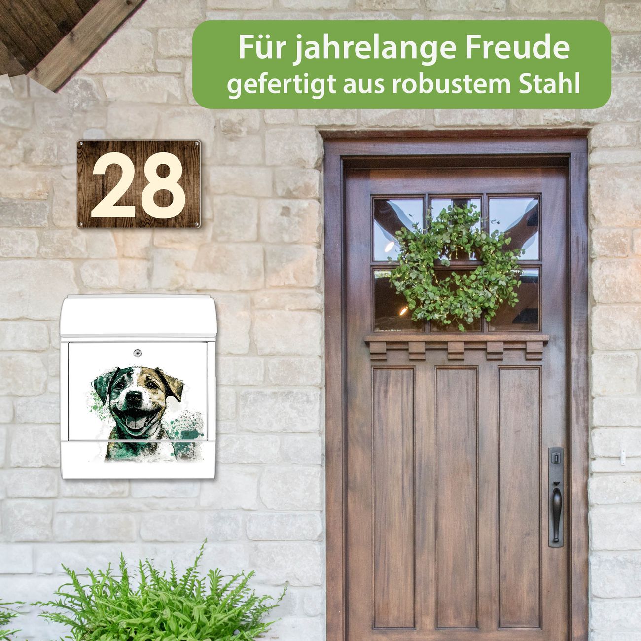 DESIGN: Der Postkasten mit Motiv Motiv Fröhlicher Welpe Aquarell hat ein sehr ansprechendes und ausgefallenes Design, damit entlocken Sie Ihren Nachbarn und dem Postboten ein Lächeln. Heben Sie Sich von der tristen grauen Masse ab, ohne auf Funktionalität zu verzichten. DETAILS: Der Postkasten besteht aus pulverbeschichtetem Stahl. Er ist 38x46x12,5cm groß. Das Motiv besteht aus einer wetter- und UV-resistenten Folie, die mit einem Schutzlaminat überzogen ist, sodass der Briefkasten zusätzlich vor Kratzern geschützt ist. Der Briefkasten wird mit Montagematerial, zusätzlich zwei Schlüssel sowie einer Bohrschablone geliefert. NUTZEN: Sie können diesen Briefkasten sowohl als Wandbriefkasten montieren oder einen passenden Ständer kaufen und als Standbriefkasten einbetonieren. Die Größe bietet genügend Platz für Sendungen aller Art, der Einwurf fasst auch größere A4 Sendungen. BANJADO: Ihr Briefkasten wird in Sachsen in einer kleinen Manufaktur von Hand veredelt. Die Motivfolie ist lösungsmittelfrei und schutzlaminiert für einen langen Halt. Wir legen großen Wert auf die Verbindung von Funktionalität und Design. Sie erhalten Handarbeit aus Sachsen.