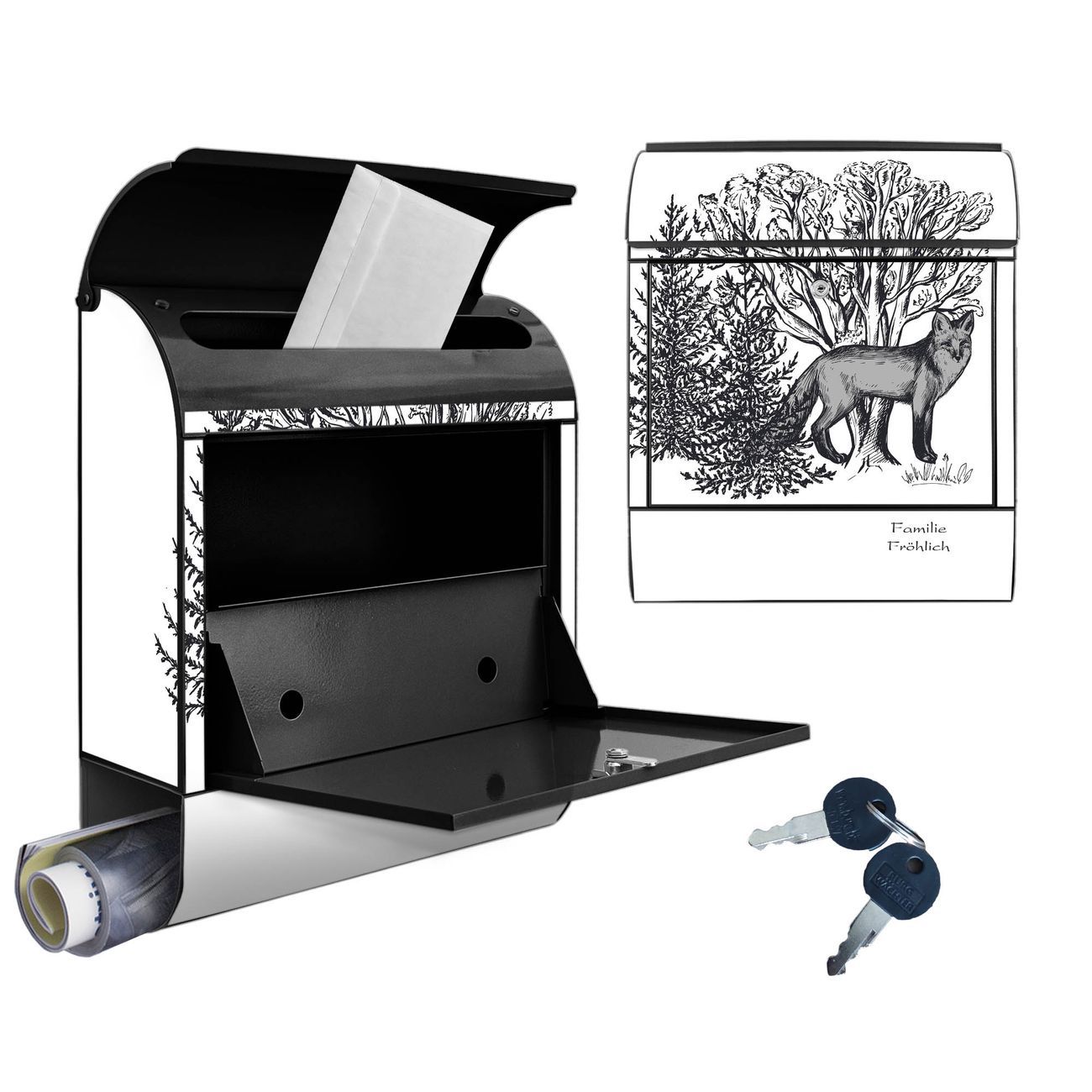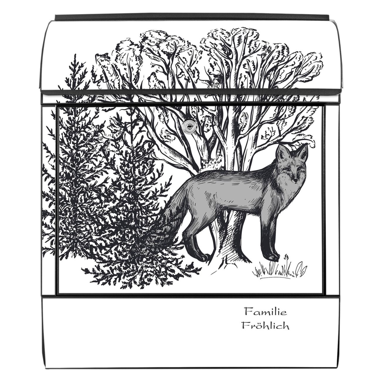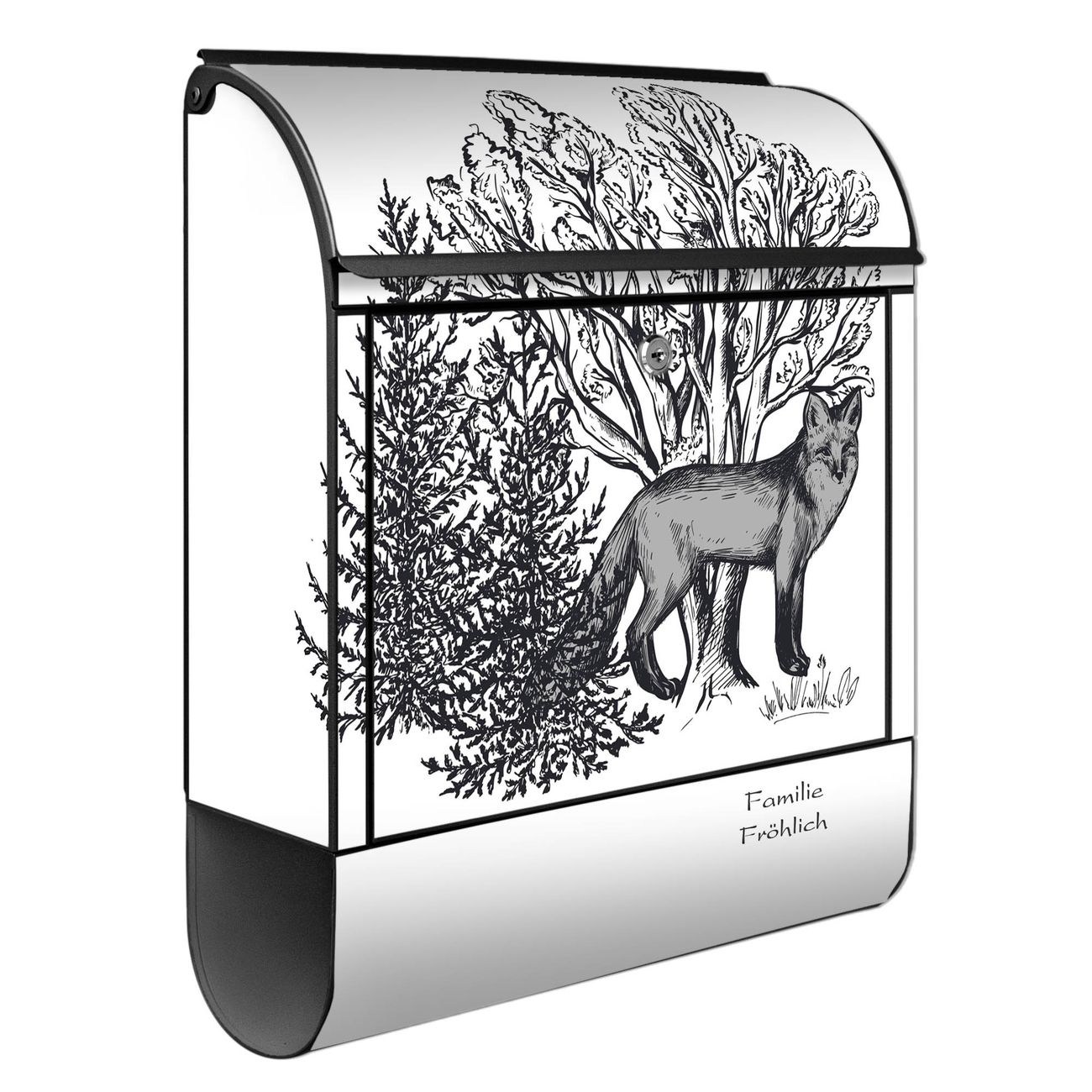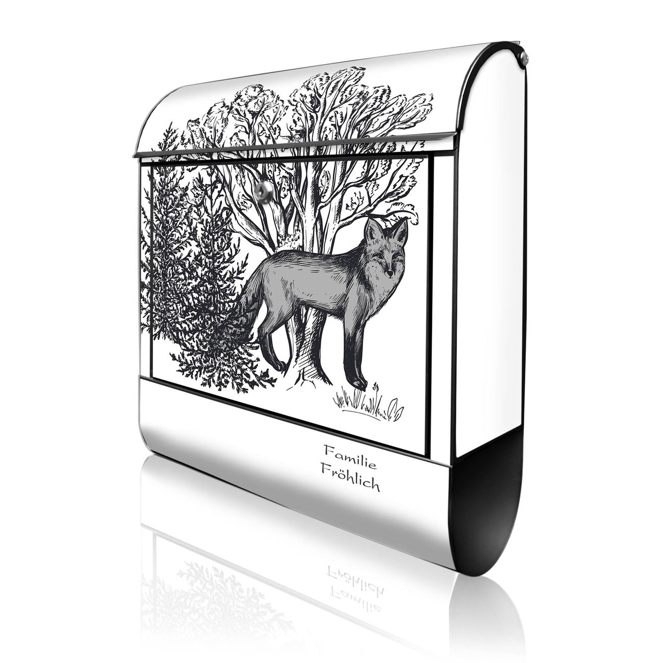 Großer Stahl Briefkasten Motiv Fuchs in Schwarz-Weiß