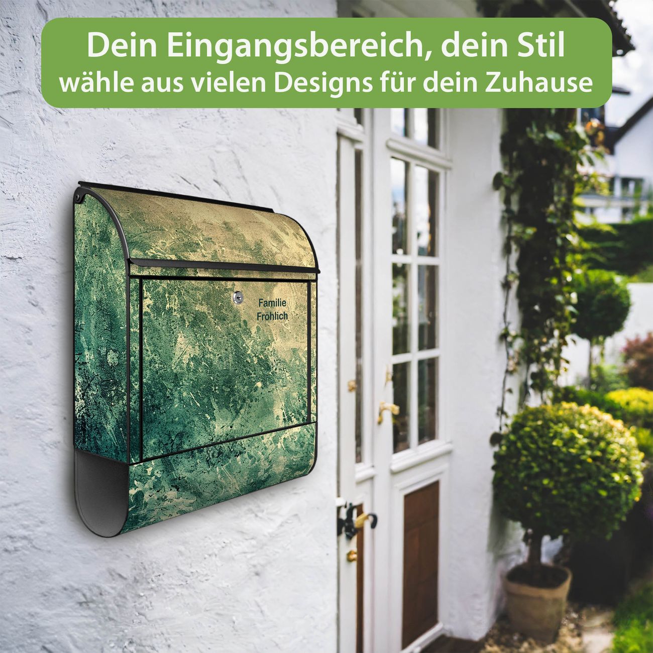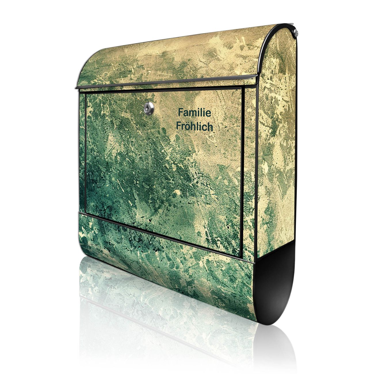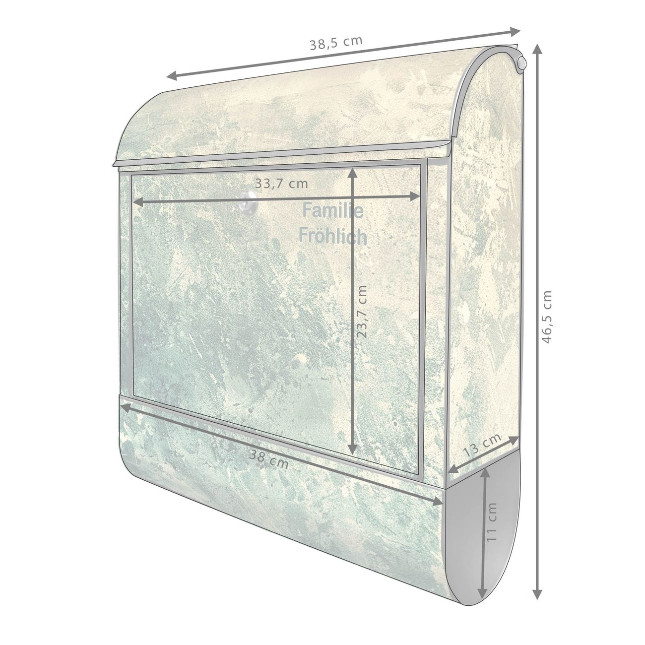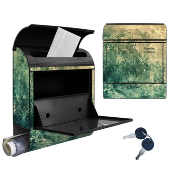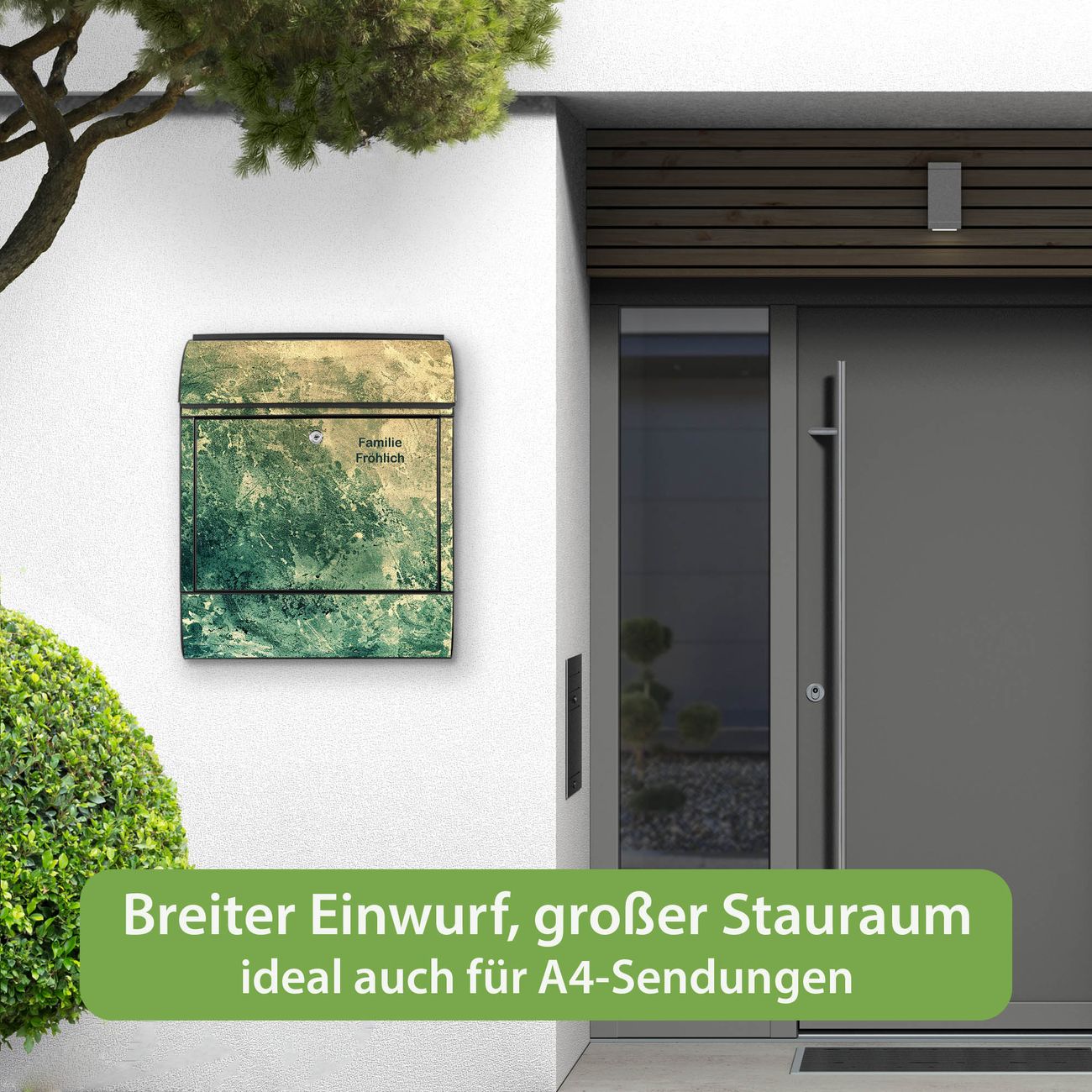 DESIGN: Der Postkasten mit Motiv Motiv Grüne Patina hat ein sehr ansprechendes und ausgefallenes Design, damit entlocken Sie Ihren Nachbarn und dem Postboten ein Lächeln. Heben Sie Sich von der tristen grauen Masse ab, ohne auf Funktionalität zu verzichten. DETAILS: Der Postkasten besteht aus pulverbeschichtetem Stahl. Er ist 38x46x12,5cm groß. Das Motiv besteht aus einer wetter- und UV-resistenten Folie, die mit einem Schutzlaminat überzogen ist, sodass der Briefkasten zusätzlich vor Kratzern geschützt ist. Der Briefkasten wird mit Montagematerial, zusätzlich zwei Schlüssel sowie einer Bohrschablone geliefert. NUTZEN: Sie können diesen Briefkasten sowohl als Wandbriefkasten montieren oder einen passenden Ständer kaufen und als Standbriefkasten einbetonieren. Die Größe bietet genügend Platz für Sendungen aller Art, der Einwurf fasst auch größere A4 Sendungen. BANJADO: Ihr Briefkasten wird in Sachsen in einer kleinen Manufaktur von Hand veredelt. Die Motivfolie ist lösungsmittelfrei und schutzlaminiert für einen langen Halt. Wir legen großen Wert auf die Verbindung von Funktionalität und Design. Sie erhalten Handarbeit aus Sachsen.