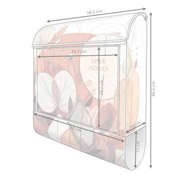 DESIGN: Der Postkasten mit Motiv Motiv Herbstliche Blätterpracht hat ein sehr ansprechendes und ausgefallenes Design, damit entlocken Sie Ihren Nachbarn und dem Postboten ein Lächeln. Heben Sie Sich von der tristen grauen Masse ab, ohne auf Funktionalität zu verzichten. DETAILS: Der Postkasten besteht aus pulverbeschichtetem Stahl. Er ist 38x46x12,5cm groß. Das Motiv besteht aus einer wetter- und UV-resistenten Folie, die mit einem Schutzlaminat überzogen ist, sodass der Briefkasten zusätzlich vor Kratzern geschützt ist. Der Briefkasten wird mit Montagematerial, zusätzlich zwei Schlüssel sowie einer Bohrschablone geliefert. NUTZEN: Sie können diesen Briefkasten sowohl als Wandbriefkasten montieren oder einen passenden Ständer kaufen und als Standbriefkasten einbetonieren. Die Größe bietet genügend Platz für Sendungen aller Art, der Einwurf fasst auch größere A4 Sendungen. BANJADO: Ihr Briefkasten wird in Sachsen in einer kleinen Manufaktur von Hand veredelt. Die Motivfolie ist lösungsmittelfrei und schutzlaminiert für einen langen Halt. Wir legen großen Wert auf die Verbindung von Funktionalität und Design. Sie erhalten Handarbeit aus Sachsen.