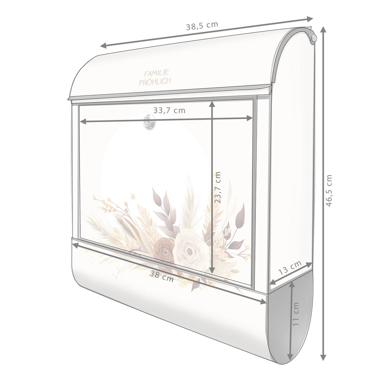 DESIGN: Der Postkasten mit Motiv Motiv Herbstliches Blumenarrangement hat ein sehr ansprechendes und ausgefallenes Design, damit entlocken Sie Ihren Nachbarn und dem Postboten ein Lächeln. Heben Sie Sich von der tristen grauen Masse ab, ohne auf Funktionalität zu verzichten. DETAILS: Der Postkasten besteht aus pulverbeschichtetem Stahl. Er ist 38x46x12,5cm groß. Das Motiv besteht aus einer wetter- und UV-resistenten Folie, die mit einem Schutzlaminat überzogen ist, sodass der Briefkasten zusätzlich vor Kratzern geschützt ist. Der Briefkasten wird mit Montagematerial, zusätzlich zwei Schlüssel sowie einer Bohrschablone geliefert. NUTZEN: Sie können diesen Briefkasten sowohl als Wandbriefkasten montieren oder einen passenden Ständer kaufen und als Standbriefkasten einbetonieren. Die Größe bietet genügend Platz für Sendungen aller Art, der Einwurf fasst auch größere A4 Sendungen. BANJADO: Ihr Briefkasten wird in Sachsen in einer kleinen Manufaktur von Hand veredelt. Die Motivfolie ist lösungsmittelfrei und schutzlaminiert für einen langen Halt. Wir legen großen Wert auf die Verbindung von Funktionalität und Design. Sie erhalten Handarbeit aus Sachsen.
