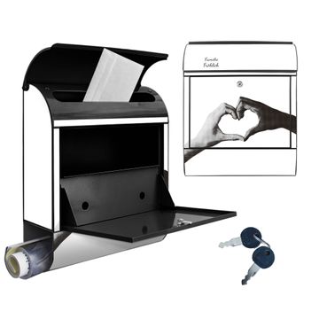DESIGN: Der Postkasten mit Motiv Motiv Herzhände hat ein sehr ansprechendes und ausgefallenes Design, damit entlocken Sie Ihren Nachbarn und dem Postboten ein Lächeln. Heben Sie Sich von der tristen grauen Masse ab, ohne auf Funktionalität zu verzichten. DETAILS: Der Postkasten besteht aus pulverbeschichtetem Stahl. Er ist 38x46x12,5cm groß. Das Motiv besteht aus einer wetter- und UV-resistenten Folie, die mit einem Schutzlaminat überzogen ist, sodass der Briefkasten zusätzlich vor Kratzern geschützt ist. Der Briefkasten wird mit Montagematerial, zusätzlich zwei Schlüssel sowie einer Bohrschablone geliefert. NUTZEN: Sie können diesen Briefkasten sowohl als Wandbriefkasten montieren oder einen passenden Ständer kaufen und als Standbriefkasten einbetonieren. Die Größe bietet genügend Platz für Sendungen aller Art, der Einwurf fasst auch größere A4 Sendungen. BANJADO: Ihr Briefkasten wird in Sachsen in einer kleinen Manufaktur von Hand veredelt. Die Motivfolie ist lösungsmittelfrei und schutzlaminiert für einen langen Halt. Wir legen großen Wert auf die Verbindung von Funktionalität und Design. Sie erhalten Handarbeit aus Sachsen.