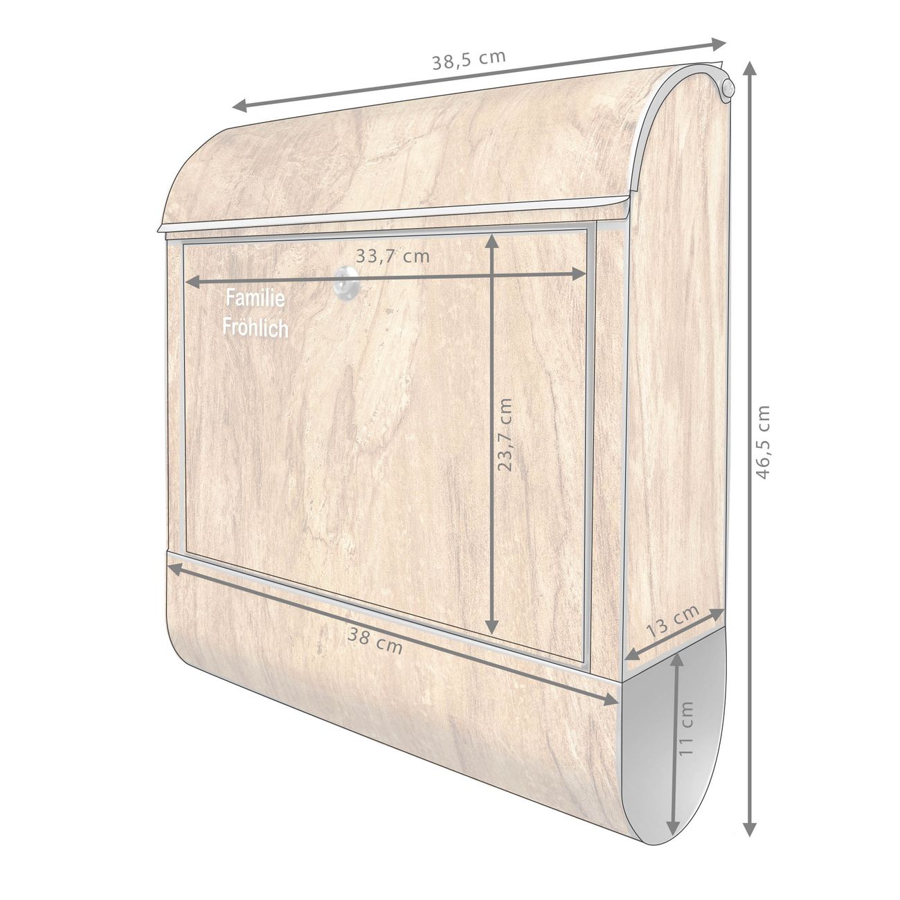 DESIGN: Der Postkasten mit Motiv Motiv Holz Struktur mit Astloch hat ein sehr ansprechendes und ausgefallenes Design, damit entlocken Sie Ihren Nachbarn und dem Postboten ein Lächeln. Heben Sie Sich von der tristen grauen Masse ab, ohne auf Funktionalität zu verzichten. DETAILS: Der Postkasten besteht aus pulverbeschichtetem Stahl. Er ist 38x46x12,5cm groß. Das Motiv besteht aus einer wetter- und UV-resistenten Folie, die mit einem Schutzlaminat überzogen ist, sodass der Briefkasten zusätzlich vor Kratzern geschützt ist. Der Briefkasten wird mit Montagematerial, zusätzlich zwei Schlüssel sowie einer Bohrschablone geliefert. NUTZEN: Sie können diesen Briefkasten sowohl als Wandbriefkasten montieren oder einen passenden Ständer kaufen und als Standbriefkasten einbetonieren. Die Größe bietet genügend Platz für Sendungen aller Art, der Einwurf fasst auch größere A4 Sendungen. BANJADO: Ihr Briefkasten wird in Sachsen in einer kleinen Manufaktur von Hand veredelt. Die Motivfolie ist lösungsmittelfrei und schutzlaminiert für einen langen Halt. Wir legen großen Wert auf die Verbindung von Funktionalität und Design. Sie erhalten Handarbeit aus Sachsen.