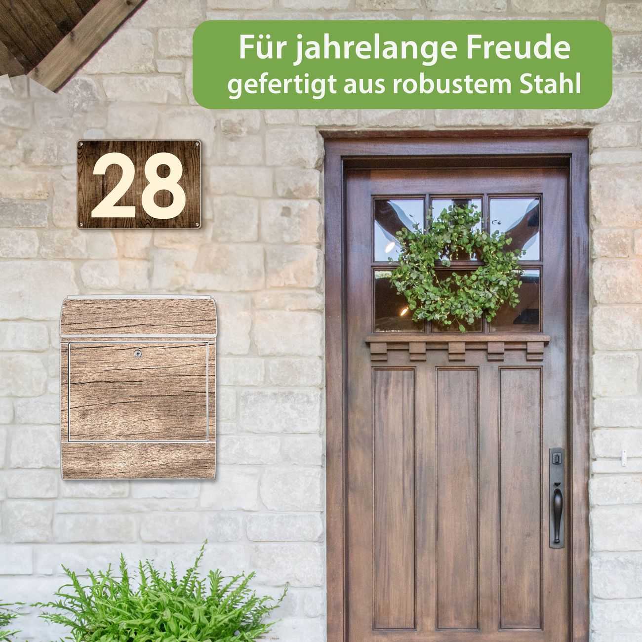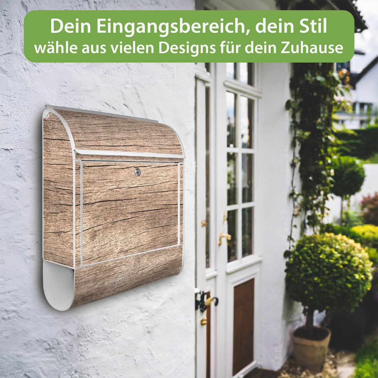 DESIGN: Der Postkasten mit Motiv Motiv Holz Struktur Warmgrau hat ein sehr ansprechendes und ausgefallenes Design, damit entlocken Sie Ihren Nachbarn und dem Postboten ein Lächeln. Heben Sie Sich von der tristen grauen Masse ab, ohne auf Funktionalität zu verzichten. DETAILS: Der Postkasten besteht aus pulverbeschichtetem Stahl. Er ist 38x46x12,5cm groß. Das Motiv besteht aus einer wetter- und UV-resistenten Folie, die mit einem Schutzlaminat überzogen ist, sodass der Briefkasten zusätzlich vor Kratzern geschützt ist. Der Briefkasten wird mit Montagematerial, zusätzlich zwei Schlüssel sowie einer Bohrschablone geliefert. NUTZEN: Sie können diesen Briefkasten sowohl als Wandbriefkasten montieren oder einen passenden Ständer kaufen und als Standbriefkasten einbetonieren. Die Größe bietet genügend Platz für Sendungen aller Art, der Einwurf fasst auch größere A4 Sendungen. BANJADO: Ihr Briefkasten wird in Sachsen in einer kleinen Manufaktur von Hand veredelt. Die Motivfolie ist lösungsmittelfrei und schutzlaminiert für einen langen Halt. Wir legen großen Wert auf die Verbindung von Funktionalität und Design. Sie erhalten Handarbeit aus Sachsen.