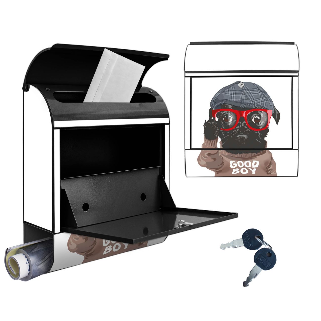DESIGN: Der Postkasten mit Motiv Motiv Lustiger Mops mit Brille hat ein sehr ansprechendes und ausgefallenes Design, damit entlocken Sie Ihren Nachbarn und dem Postboten ein Lächeln. Heben Sie Sich von der tristen grauen Masse ab, ohne auf Funktionalität zu verzichten. DETAILS: Der Postkasten besteht aus pulverbeschichtetem Stahl. Er ist 38x46x12,5cm groß. Das Motiv besteht aus einer wetter- und UV-resistenten Folie, die mit einem Schutzlaminat überzogen ist, sodass der Briefkasten zusätzlich vor Kratzern geschützt ist. Der Briefkasten wird mit Montagematerial, zusätzlich zwei Schlüssel sowie einer Bohrschablone geliefert. NUTZEN: Sie können diesen Briefkasten sowohl als Wandbriefkasten montieren oder einen passenden Ständer kaufen und als Standbriefkasten einbetonieren. Die Größe bietet genügend Platz für Sendungen aller Art, der Einwurf fasst auch größere A4 Sendungen. BANJADO: Ihr Briefkasten wird in Sachsen in einer kleinen Manufaktur von Hand veredelt. Die Motivfolie ist lösungsmittelfrei und schutzlaminiert für einen langen Halt. Wir legen großen Wert auf die Verbindung von Funktionalität und Design. Sie erhalten Handarbeit aus Sachsen.