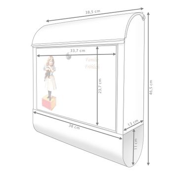 DESIGN: Der Postkasten mit Motiv Motiv Mädchen mit Katze Vintage hat ein sehr ansprechendes und ausgefallenes Design, damit entlocken Sie Ihren Nachbarn und dem Postboten ein Lächeln. Heben Sie Sich von der tristen grauen Masse ab, ohne auf Funktionalität zu verzichten. DETAILS: Der Postkasten besteht aus pulverbeschichtetem Stahl. Er ist 38x46x12,5cm groß. Das Motiv besteht aus einer wetter- und UV-resistenten Folie, die mit einem Schutzlaminat überzogen ist, sodass der Briefkasten zusätzlich vor Kratzern geschützt ist. Der Briefkasten wird mit Montagematerial, zusätzlich zwei Schlüssel sowie einer Bohrschablone geliefert. NUTZEN: Sie können diesen Briefkasten sowohl als Wandbriefkasten montieren oder einen passenden Ständer kaufen und als Standbriefkasten einbetonieren. Die Größe bietet genügend Platz für Sendungen aller Art, der Einwurf fasst auch größere A4 Sendungen. BANJADO: Ihr Briefkasten wird in Sachsen in einer kleinen Manufaktur von Hand veredelt. Die Motivfolie ist lösungsmittelfrei und schutzlaminiert für einen langen Halt. Wir legen großen Wert auf die Verbindung von Funktionalität und Design. Sie erhalten Handarbeit aus Sachsen.