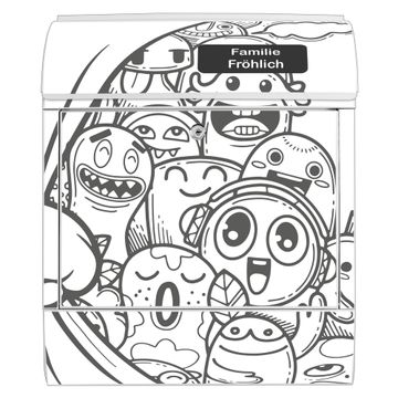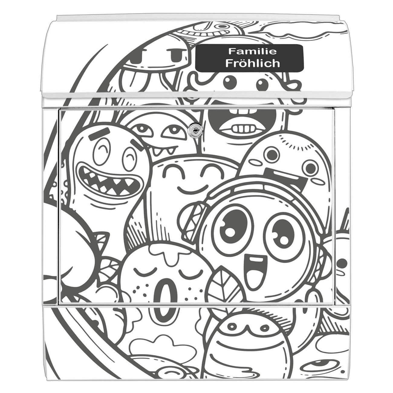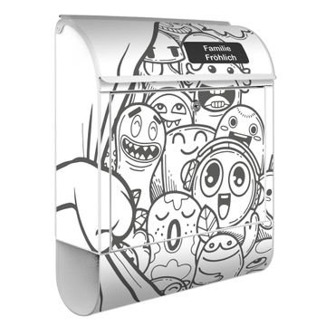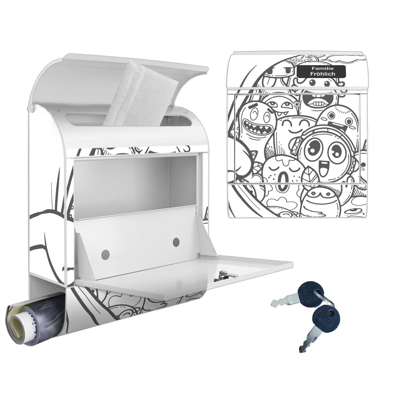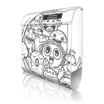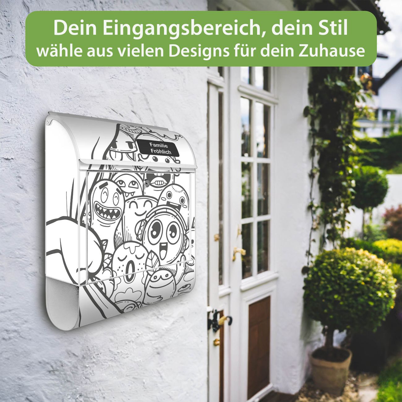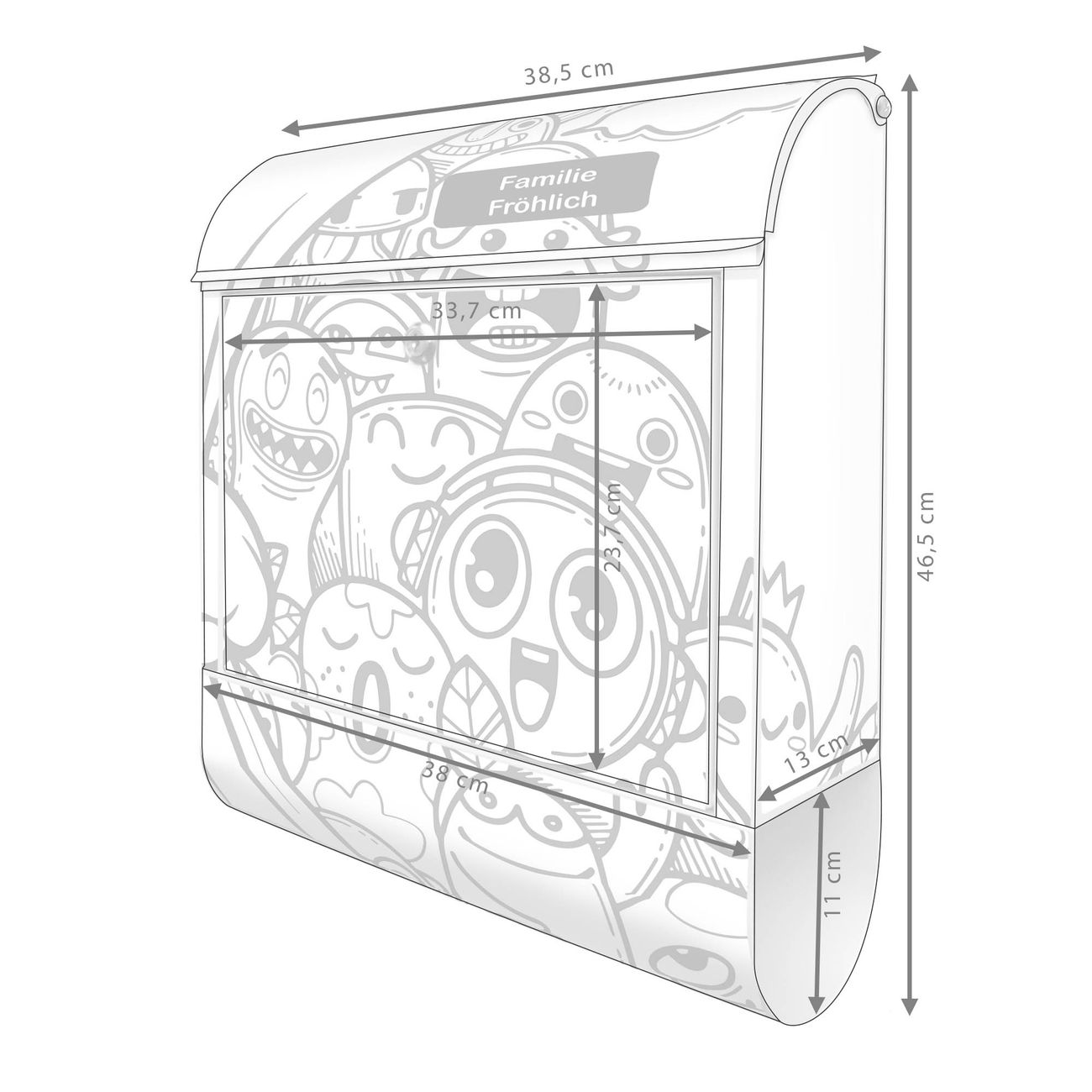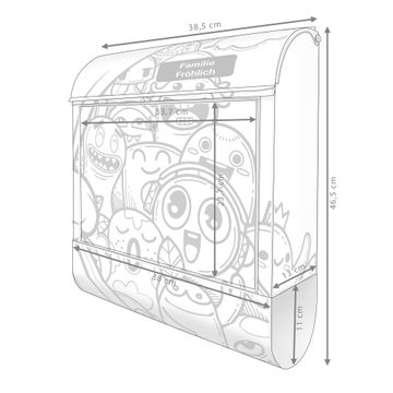 DESIGN: Der Postkasten mit Motiv Motiv Monsterparty hat ein sehr ansprechendes und ausgefallenes Design, damit entlocken Sie Ihren Nachbarn und dem Postboten ein Lächeln. Heben Sie Sich von der tristen grauen Masse ab, ohne auf Funktionalität zu verzichten. DETAILS: Der Postkasten besteht aus pulverbeschichtetem Stahl. Er ist 38x46x12,5cm groß. Das Motiv besteht aus einer wetter- und UV-resistenten Folie, die mit einem Schutzlaminat überzogen ist, sodass der Briefkasten zusätzlich vor Kratzern geschützt ist. Der Briefkasten wird mit Montagematerial, zusätzlich zwei Schlüssel sowie einer Bohrschablone geliefert. NUTZEN: Sie können diesen Briefkasten sowohl als Wandbriefkasten montieren oder einen passenden Ständer kaufen und als Standbriefkasten einbetonieren. Die Größe bietet genügend Platz für Sendungen aller Art, der Einwurf fasst auch größere A4 Sendungen. BANJADO: Ihr Briefkasten wird in Sachsen in einer kleinen Manufaktur von Hand veredelt. Die Motivfolie ist lösungsmittelfrei und schutzlaminiert für einen langen Halt. Wir legen großen Wert auf die Verbindung von Funktionalität und Design. Sie erhalten Handarbeit aus Sachsen.