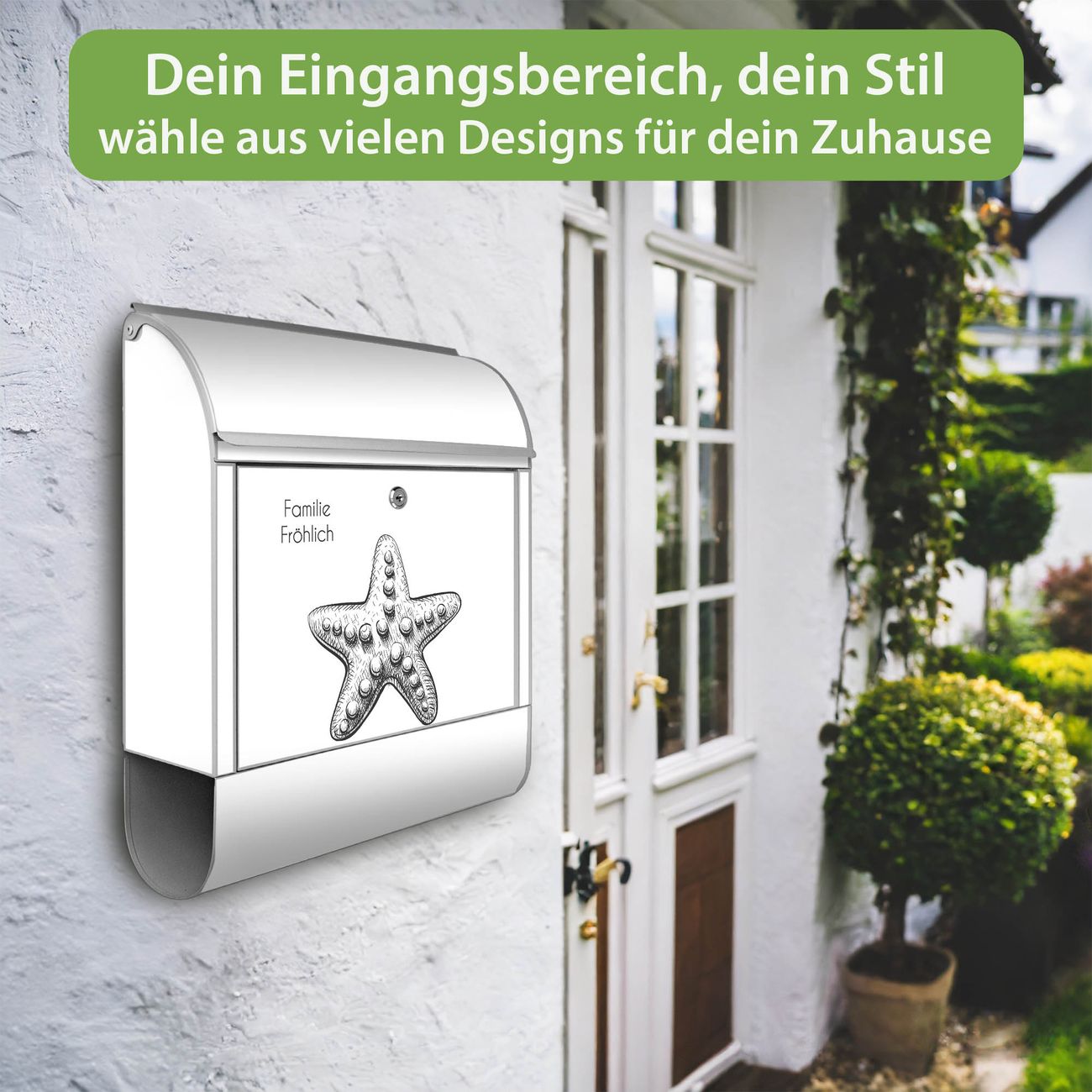 DESIGN: Der Postkasten mit Motiv Motiv Muschel 8 hat ein sehr ansprechendes und ausgefallenes Design, damit entlocken Sie Ihren Nachbarn und dem Postboten ein Lächeln. Heben Sie Sich von der tristen grauen Masse ab, ohne auf Funktionalität zu verzichten. DETAILS: Der Postkasten besteht aus pulverbeschichtetem Stahl. Er ist 38x46x12,5cm groß. Das Motiv besteht aus einer wetter- und UV-resistenten Folie, die mit einem Schutzlaminat überzogen ist, sodass der Briefkasten zusätzlich vor Kratzern geschützt ist. Der Briefkasten wird mit Montagematerial, zusätzlich zwei Schlüssel sowie einer Bohrschablone geliefert. NUTZEN: Sie können diesen Briefkasten sowohl als Wandbriefkasten montieren oder einen passenden Ständer kaufen und als Standbriefkasten einbetonieren. Die Größe bietet genügend Platz für Sendungen aller Art, der Einwurf fasst auch größere A4 Sendungen. BANJADO: Ihr Briefkasten wird in Sachsen in einer kleinen Manufaktur von Hand veredelt. Die Motivfolie ist lösungsmittelfrei und schutzlaminiert für einen langen Halt. Wir legen großen Wert auf die Verbindung von Funktionalität und Design. Sie erhalten Handarbeit aus Sachsen.