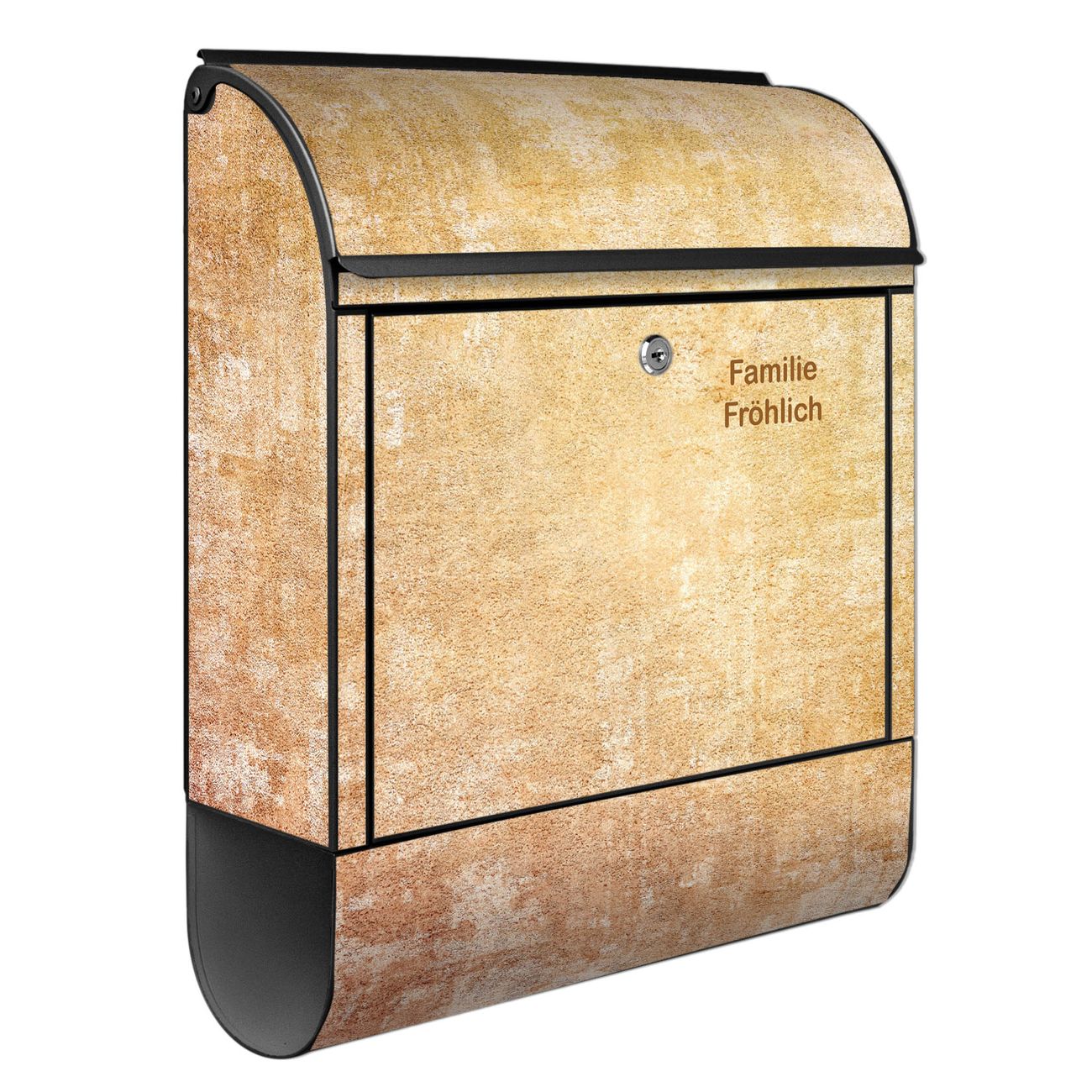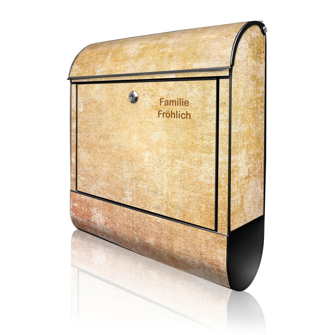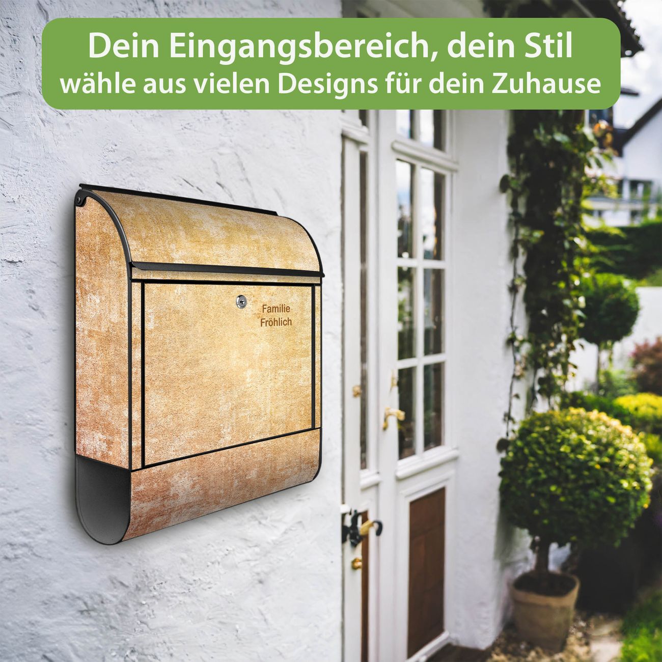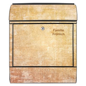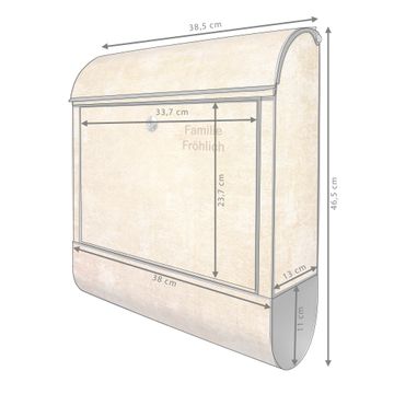 DESIGN: Der Postkasten mit Motiv Motiv Nostalgische Tapetenstruktur hat ein sehr ansprechendes und ausgefallenes Design, damit entlocken Sie Ihren Nachbarn und dem Postboten ein Lächeln. Heben Sie Sich von der tristen grauen Masse ab, ohne auf Funktionalität zu verzichten. DETAILS: Der Postkasten besteht aus pulverbeschichtetem Stahl. Er ist 38x46x12,5cm groß. Das Motiv besteht aus einer wetter- und UV-resistenten Folie, die mit einem Schutzlaminat überzogen ist, sodass der Briefkasten zusätzlich vor Kratzern geschützt ist. Der Briefkasten wird mit Montagematerial, zusätzlich zwei Schlüssel sowie einer Bohrschablone geliefert. NUTZEN: Sie können diesen Briefkasten sowohl als Wandbriefkasten montieren oder einen passenden Ständer kaufen und als Standbriefkasten einbetonieren. Die Größe bietet genügend Platz für Sendungen aller Art, der Einwurf fasst auch größere A4 Sendungen. BANJADO: Ihr Briefkasten wird in Sachsen in einer kleinen Manufaktur von Hand veredelt. Die Motivfolie ist lösungsmittelfrei und schutzlaminiert für einen langen Halt. Wir legen großen Wert auf die Verbindung von Funktionalität und Design. Sie erhalten Handarbeit aus Sachsen.