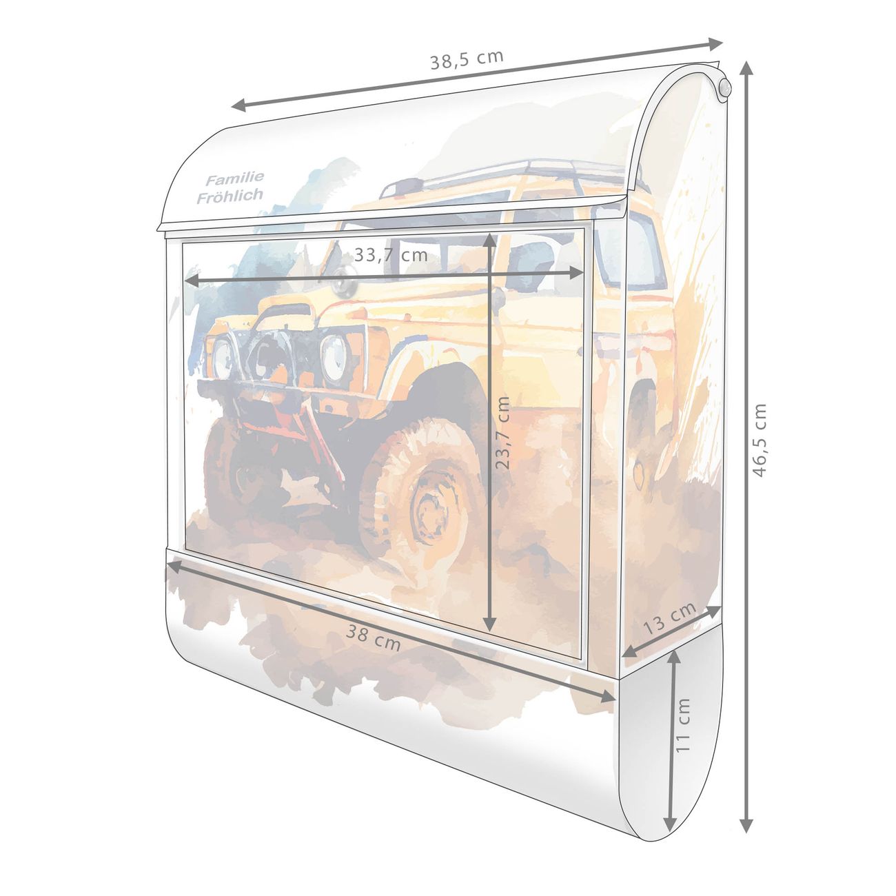DESIGN: Der Postkasten mit Motiv Motiv Offroad Abenteuer 2 hat ein sehr ansprechendes und ausgefallenes Design, damit entlocken Sie Ihren Nachbarn und dem Postboten ein Lächeln. Heben Sie Sich von der tristen grauen Masse ab, ohne auf Funktionalität zu verzichten. DETAILS: Der Postkasten besteht aus pulverbeschichtetem Stahl. Er ist 38x46x12,5cm groß. Das Motiv besteht aus einer wetter- und UV-resistenten Folie, die mit einem Schutzlaminat überzogen ist, sodass der Briefkasten zusätzlich vor Kratzern geschützt ist. Der Briefkasten wird mit Montagematerial, zusätzlich zwei Schlüssel sowie einer Bohrschablone geliefert. NUTZEN: Sie können diesen Briefkasten sowohl als Wandbriefkasten montieren oder einen passenden Ständer kaufen und als Standbriefkasten einbetonieren. Die Größe bietet genügend Platz für Sendungen aller Art, der Einwurf fasst auch größere A4 Sendungen. BANJADO: Ihr Briefkasten wird in Sachsen in einer kleinen Manufaktur von Hand veredelt. Die Motivfolie ist lösungsmittelfrei und schutzlaminiert für einen langen Halt. Wir legen großen Wert auf die Verbindung von Funktionalität und Design. Sie erhalten Handarbeit aus Sachsen.