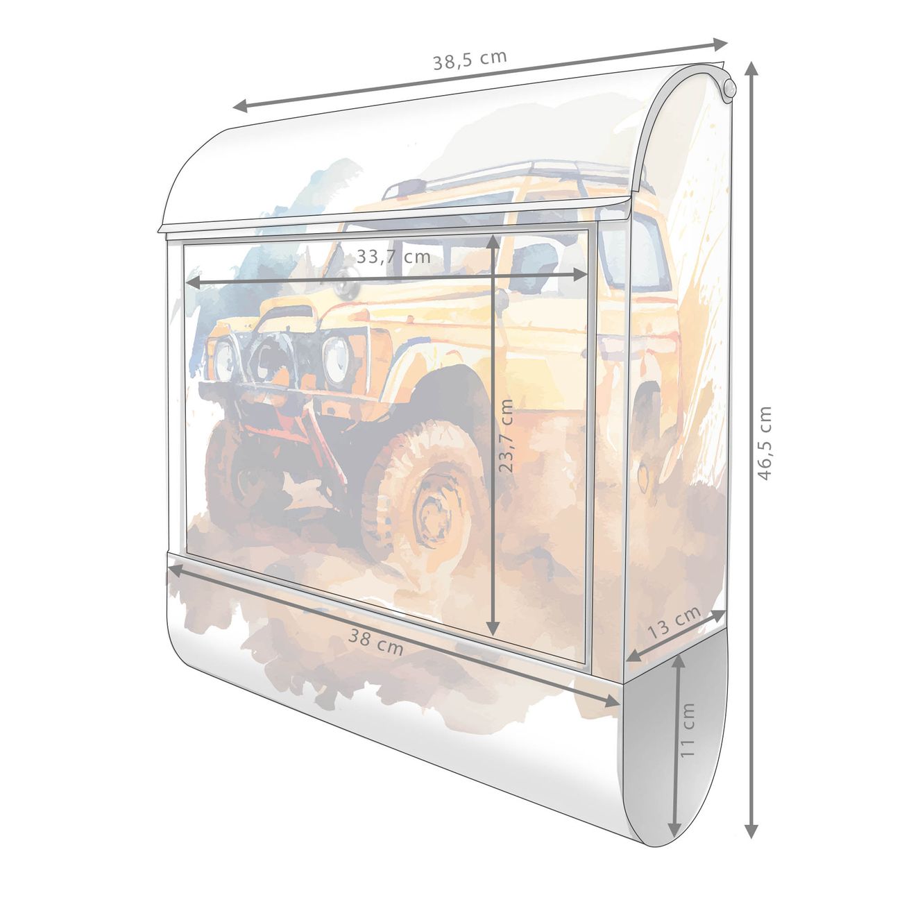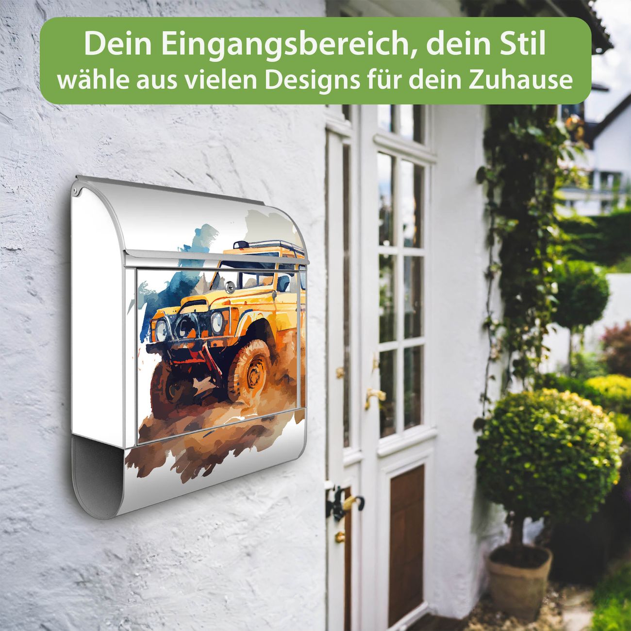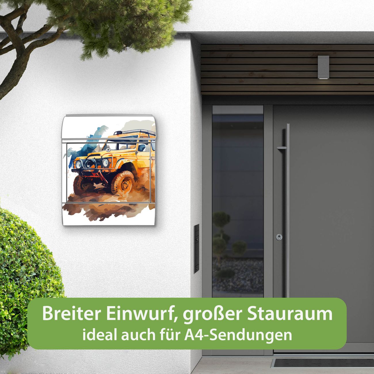 DESIGN: Der Postkasten mit Motiv Motiv Offroad Abenteuer 2 hat ein sehr ansprechendes und ausgefallenes Design, damit entlocken Sie Ihren Nachbarn und dem Postboten ein Lächeln. Heben Sie Sich von der tristen grauen Masse ab, ohne auf Funktionalität zu verzichten. DETAILS: Der Postkasten besteht aus pulverbeschichtetem Stahl. Er ist 38x46x12,5cm groß. Das Motiv besteht aus einer wetter- und UV-resistenten Folie, die mit einem Schutzlaminat überzogen ist, sodass der Briefkasten zusätzlich vor Kratzern geschützt ist. Der Briefkasten wird mit Montagematerial, zusätzlich zwei Schlüssel sowie einer Bohrschablone geliefert. NUTZEN: Sie können diesen Briefkasten sowohl als Wandbriefkasten montieren oder einen passenden Ständer kaufen und als Standbriefkasten einbetonieren. Die Größe bietet genügend Platz für Sendungen aller Art, der Einwurf fasst auch größere A4 Sendungen. BANJADO: Ihr Briefkasten wird in Sachsen in einer kleinen Manufaktur von Hand veredelt. Die Motivfolie ist lösungsmittelfrei und schutzlaminiert für einen langen Halt. Wir legen großen Wert auf die Verbindung von Funktionalität und Design. Sie erhalten Handarbeit aus Sachsen.