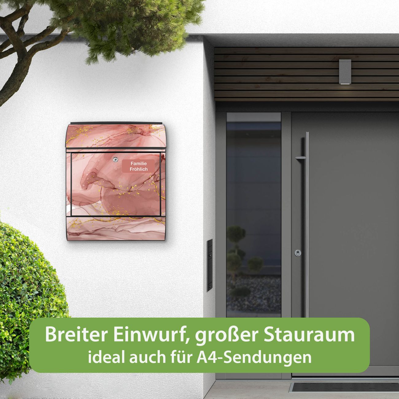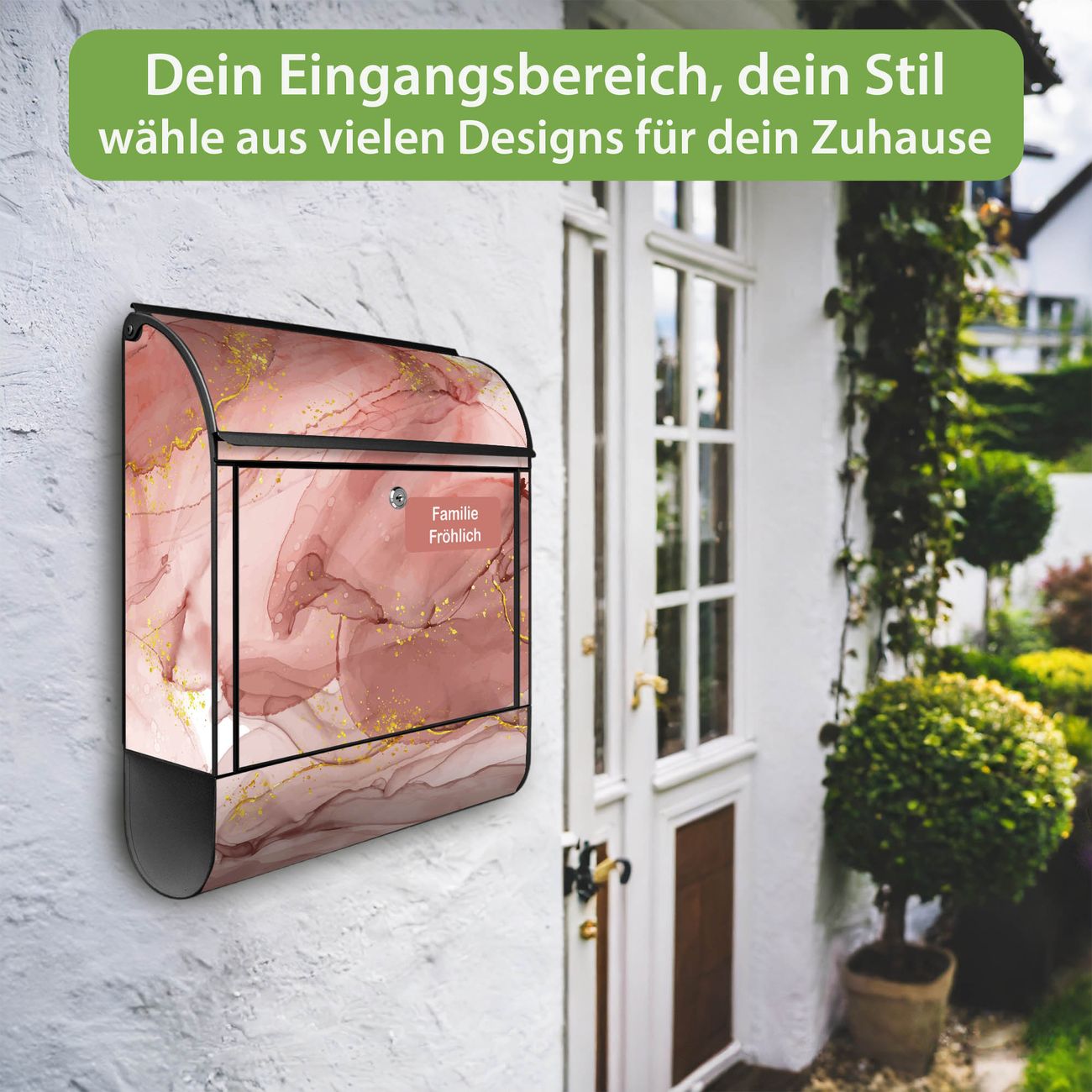 DESIGN: Der Postkasten mit Motiv Motiv Rosa Marmor mit Gold 1 hat ein sehr ansprechendes und ausgefallenes Design, damit entlocken Sie Ihren Nachbarn und dem Postboten ein Lächeln. Heben Sie Sich von der tristen grauen Masse ab, ohne auf Funktionalität zu verzichten. DETAILS: Der Postkasten besteht aus pulverbeschichtetem Stahl. Er ist 38x46x12,5cm groß. Das Motiv besteht aus einer wetter- und UV-resistenten Folie, die mit einem Schutzlaminat überzogen ist, sodass der Briefkasten zusätzlich vor Kratzern geschützt ist. Der Briefkasten wird mit Montagematerial, zusätzlich zwei Schlüssel sowie einer Bohrschablone geliefert. NUTZEN: Sie können diesen Briefkasten sowohl als Wandbriefkasten montieren oder einen passenden Ständer kaufen und als Standbriefkasten einbetonieren. Die Größe bietet genügend Platz für Sendungen aller Art, der Einwurf fasst auch größere A4 Sendungen. BANJADO: Ihr Briefkasten wird in Sachsen in einer kleinen Manufaktur von Hand veredelt. Die Motivfolie ist lösungsmittelfrei und schutzlaminiert für einen langen Halt. Wir legen großen Wert auf die Verbindung von Funktionalität und Design. Sie erhalten Handarbeit aus Sachsen.