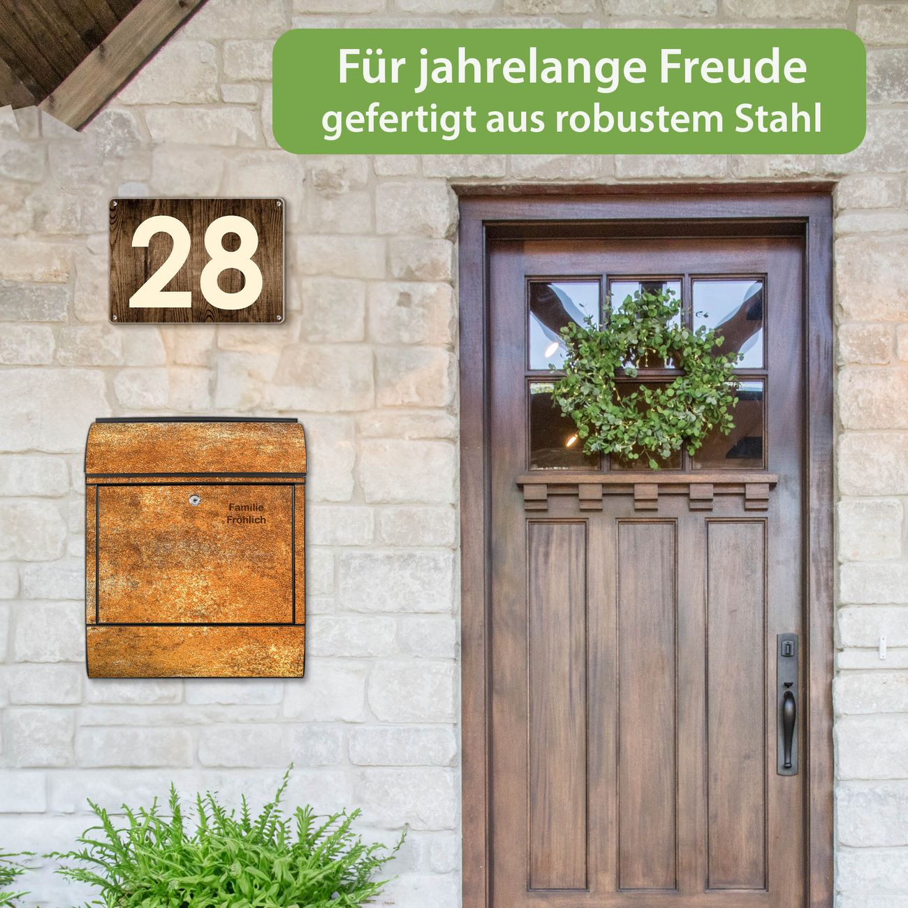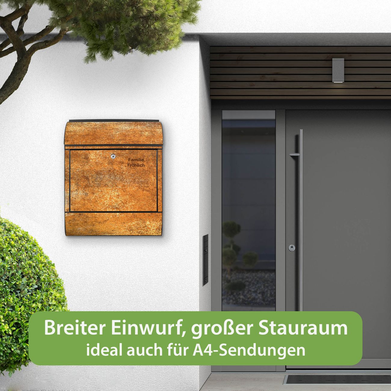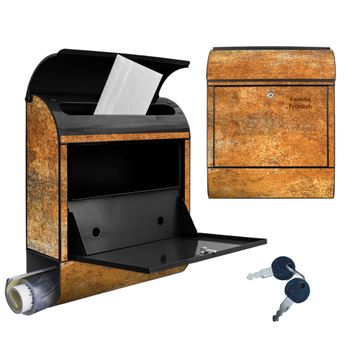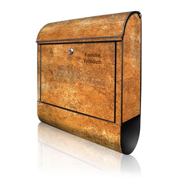 DESIGN: Der Postkasten mit Motiv Motiv Rostige Oberfläche hat ein sehr ansprechendes und ausgefallenes Design, damit entlocken Sie Ihren Nachbarn und dem Postboten ein Lächeln. Heben Sie Sich von der tristen grauen Masse ab, ohne auf Funktionalität zu verzichten. DETAILS: Der Postkasten besteht aus pulverbeschichtetem Stahl. Er ist 38x46x12,5cm groß. Das Motiv besteht aus einer wetter- und UV-resistenten Folie, die mit einem Schutzlaminat überzogen ist, sodass der Briefkasten zusätzlich vor Kratzern geschützt ist. Der Briefkasten wird mit Montagematerial, zusätzlich zwei Schlüssel sowie einer Bohrschablone geliefert. NUTZEN: Sie können diesen Briefkasten sowohl als Wandbriefkasten montieren oder einen passenden Ständer kaufen und als Standbriefkasten einbetonieren. Die Größe bietet genügend Platz für Sendungen aller Art, der Einwurf fasst auch größere A4 Sendungen. BANJADO: Ihr Briefkasten wird in Sachsen in einer kleinen Manufaktur von Hand veredelt. Die Motivfolie ist lösungsmittelfrei und schutzlaminiert für einen langen Halt. Wir legen großen Wert auf die Verbindung von Funktionalität und Design. Sie erhalten Handarbeit aus Sachsen.