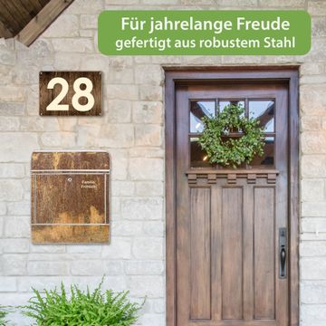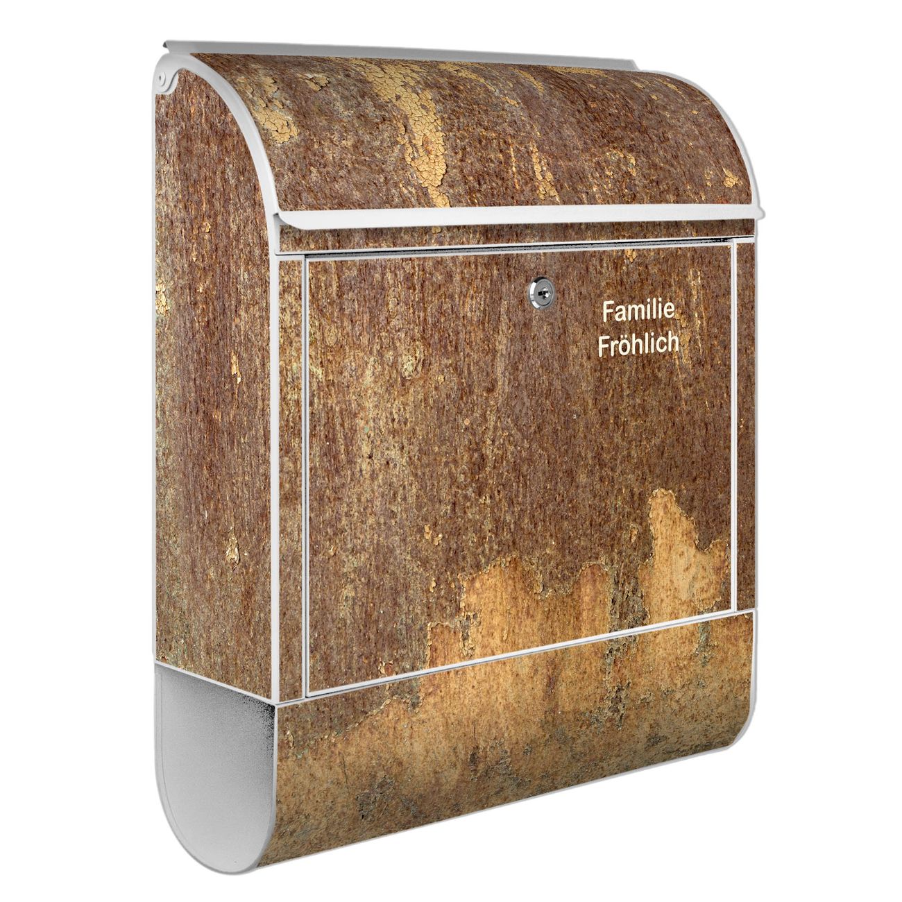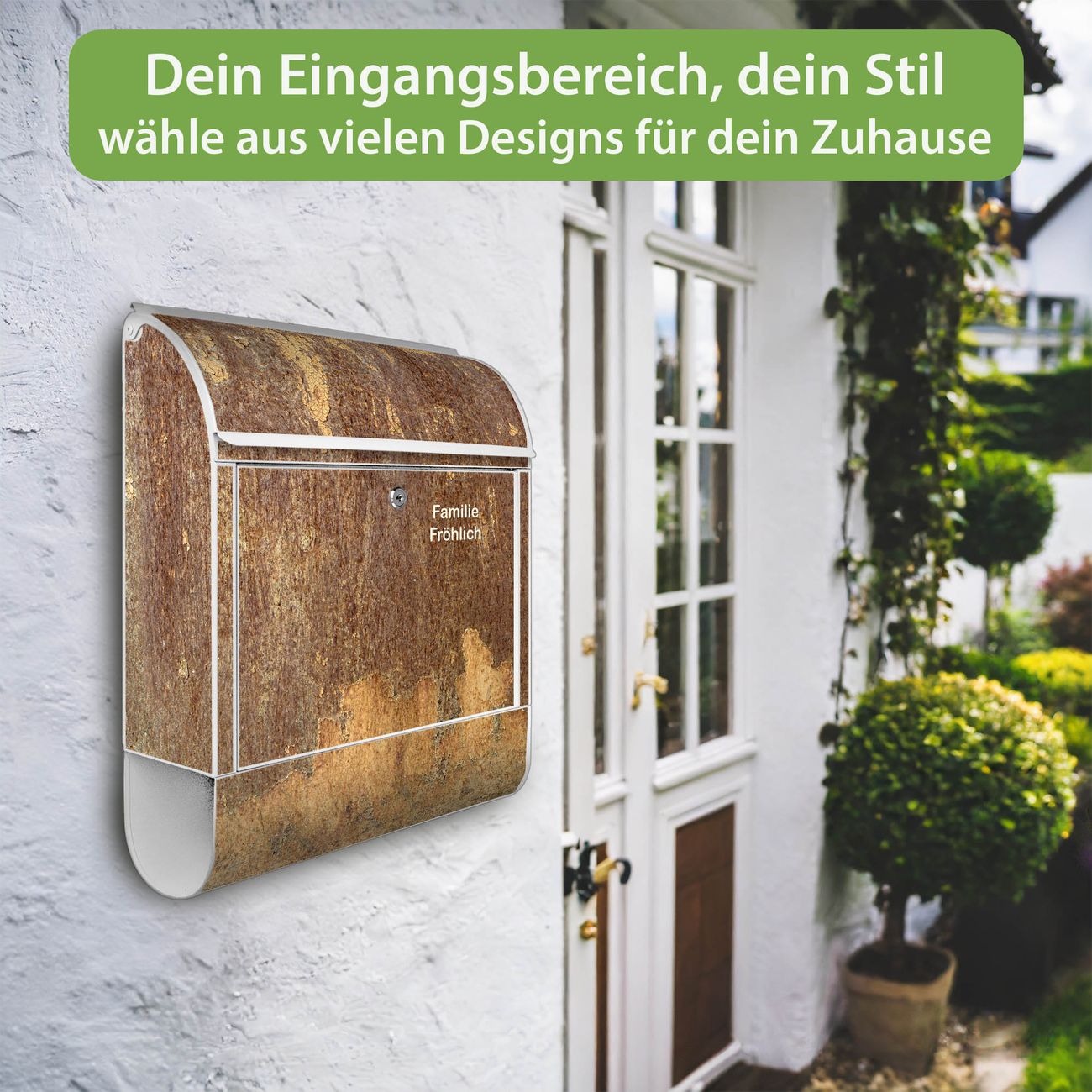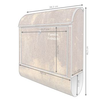 DESIGN: Der Postkasten mit Motiv Motiv Rostige Patina hat ein sehr ansprechendes und ausgefallenes Design, damit entlocken Sie Ihren Nachbarn und dem Postboten ein Lächeln. Heben Sie Sich von der tristen grauen Masse ab, ohne auf Funktionalität zu verzichten. DETAILS: Der Postkasten besteht aus pulverbeschichtetem Stahl. Er ist 38x46x12,5cm groß. Das Motiv besteht aus einer wetter- und UV-resistenten Folie, die mit einem Schutzlaminat überzogen ist, sodass der Briefkasten zusätzlich vor Kratzern geschützt ist. Der Briefkasten wird mit Montagematerial, zusätzlich zwei Schlüssel sowie einer Bohrschablone geliefert. NUTZEN: Sie können diesen Briefkasten sowohl als Wandbriefkasten montieren oder einen passenden Ständer kaufen und als Standbriefkasten einbetonieren. Die Größe bietet genügend Platz für Sendungen aller Art, der Einwurf fasst auch größere A4 Sendungen. BANJADO: Ihr Briefkasten wird in Sachsen in einer kleinen Manufaktur von Hand veredelt. Die Motivfolie ist lösungsmittelfrei und schutzlaminiert für einen langen Halt. Wir legen großen Wert auf die Verbindung von Funktionalität und Design. Sie erhalten Handarbeit aus Sachsen.