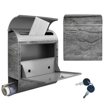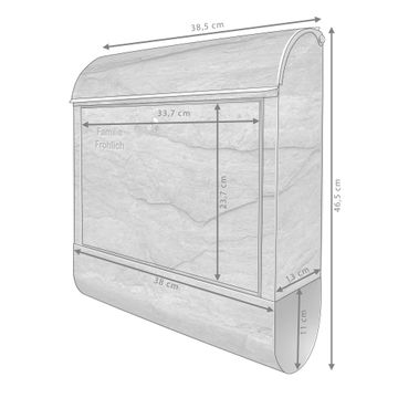 DESIGN: Der Postkasten mit Motiv Motiv Schiefer Platte 1 hat ein sehr ansprechendes und ausgefallenes Design, damit entlocken Sie Ihren Nachbarn und dem Postboten ein Lächeln. Heben Sie Sich von der tristen grauen Masse ab, ohne auf Funktionalität zu verzichten. DETAILS: Der Postkasten besteht aus pulverbeschichtetem Stahl. Er ist 38x46x12,5cm groß. Das Motiv besteht aus einer wetter- und UV-resistenten Folie, die mit einem Schutzlaminat überzogen ist, sodass der Briefkasten zusätzlich vor Kratzern geschützt ist. Der Briefkasten wird mit Montagematerial, zusätzlich zwei Schlüssel sowie einer Bohrschablone geliefert. NUTZEN: Sie können diesen Briefkasten sowohl als Wandbriefkasten montieren oder einen passenden Ständer kaufen und als Standbriefkasten einbetonieren. Die Größe bietet genügend Platz für Sendungen aller Art, der Einwurf fasst auch größere A4 Sendungen. BANJADO: Ihr Briefkasten wird in Sachsen in einer kleinen Manufaktur von Hand veredelt. Die Motivfolie ist lösungsmittelfrei und schutzlaminiert für einen langen Halt. Wir legen großen Wert auf die Verbindung von Funktionalität und Design. Sie erhalten Handarbeit aus Sachsen.