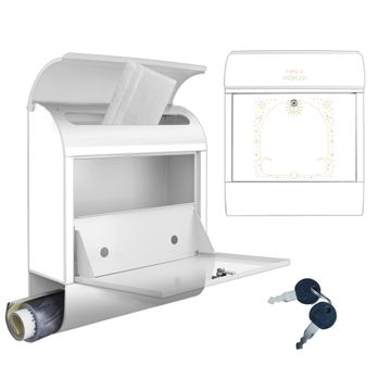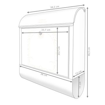 DESIGN: Der Postkasten mit Motiv Motiv Sonne und Mond Symbole hat ein sehr ansprechendes und ausgefallenes Design, damit entlocken Sie Ihren Nachbarn und dem Postboten ein Lächeln. Heben Sie Sich von der tristen grauen Masse ab, ohne auf Funktionalität zu verzichten. DETAILS: Der Postkasten besteht aus pulverbeschichtetem Stahl. Er ist 38x46x12,5cm groß. Das Motiv besteht aus einer wetter- und UV-resistenten Folie, die mit einem Schutzlaminat überzogen ist, sodass der Briefkasten zusätzlich vor Kratzern geschützt ist. Der Briefkasten wird mit Montagematerial, zusätzlich zwei Schlüssel sowie einer Bohrschablone geliefert. NUTZEN: Sie können diesen Briefkasten sowohl als Wandbriefkasten montieren oder einen passenden Ständer kaufen und als Standbriefkasten einbetonieren. Die Größe bietet genügend Platz für Sendungen aller Art, der Einwurf fasst auch größere A4 Sendungen. BANJADO: Ihr Briefkasten wird in Sachsen in einer kleinen Manufaktur von Hand veredelt. Die Motivfolie ist lösungsmittelfrei und schutzlaminiert für einen langen Halt. Wir legen großen Wert auf die Verbindung von Funktionalität und Design. Sie erhalten Handarbeit aus Sachsen.