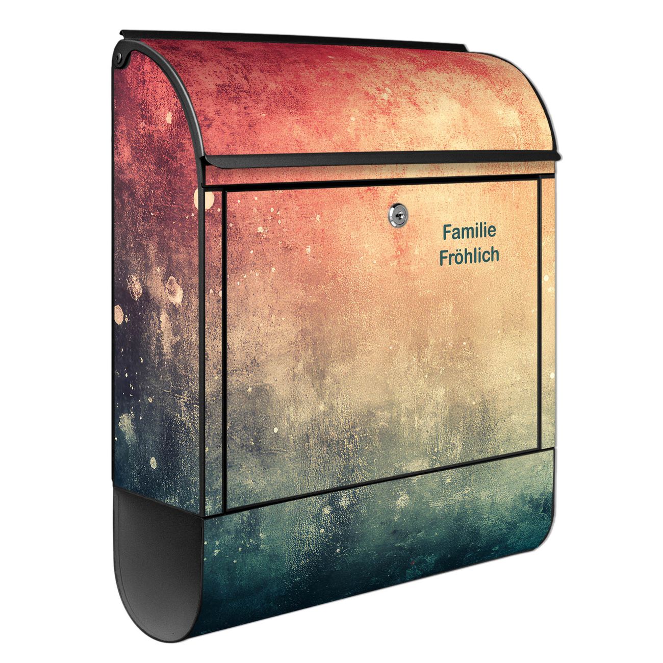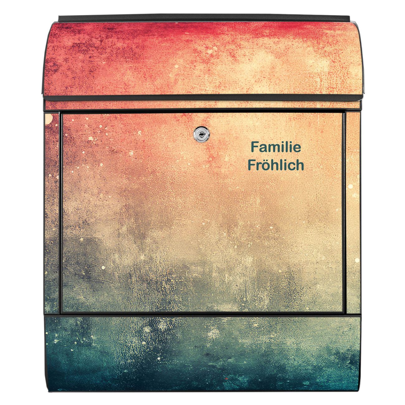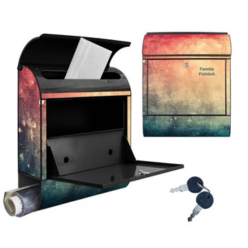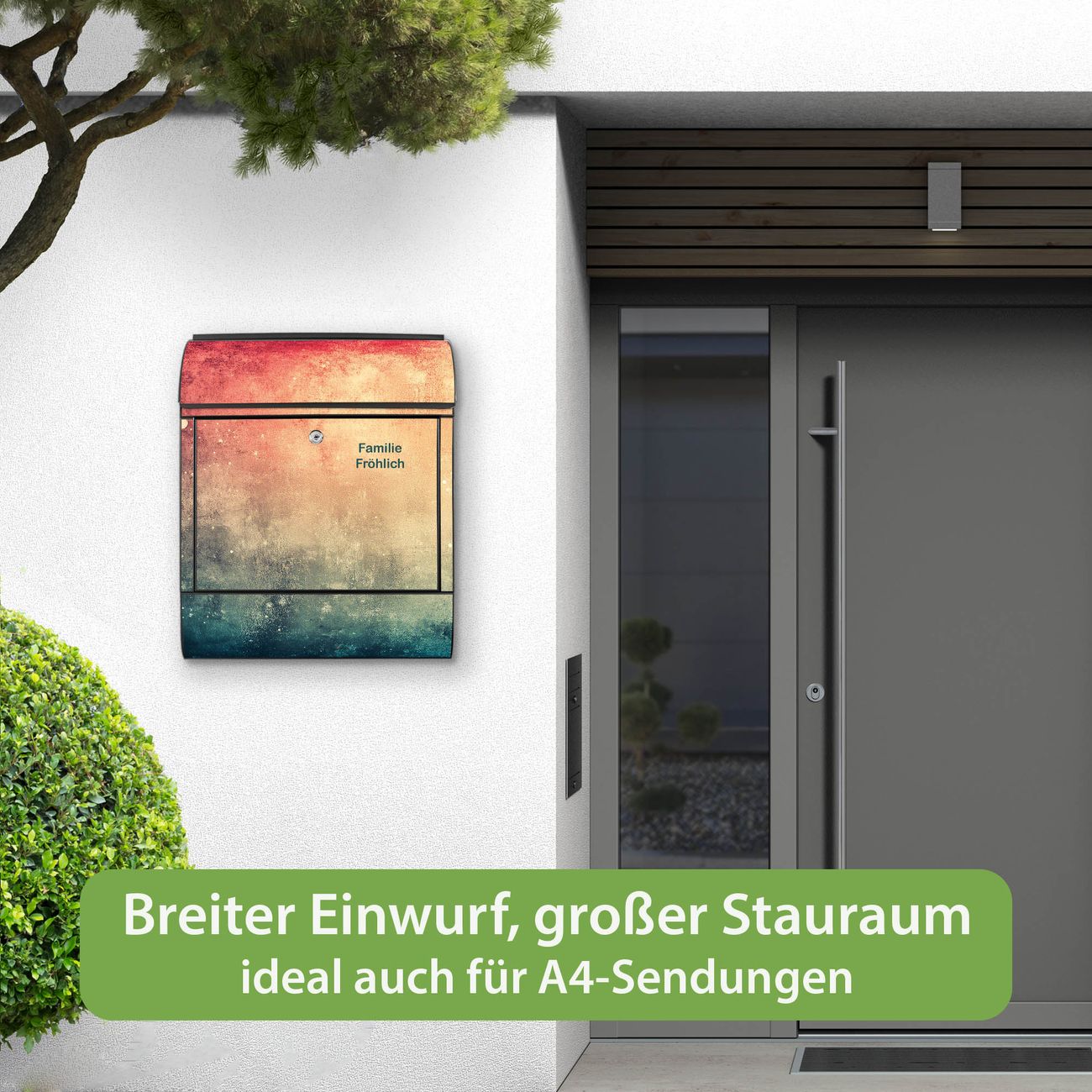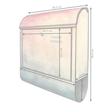 DESIGN: Der Postkasten mit Motiv Motiv Struktur Verträumt hat ein sehr ansprechendes und ausgefallenes Design, damit entlocken Sie Ihren Nachbarn und dem Postboten ein Lächeln. Heben Sie Sich von der tristen grauen Masse ab, ohne auf Funktionalität zu verzichten. DETAILS: Der Postkasten besteht aus pulverbeschichtetem Stahl. Er ist 38x46x12,5cm groß. Das Motiv besteht aus einer wetter- und UV-resistenten Folie, die mit einem Schutzlaminat überzogen ist, sodass der Briefkasten zusätzlich vor Kratzern geschützt ist. Der Briefkasten wird mit Montagematerial, zusätzlich zwei Schlüssel sowie einer Bohrschablone geliefert. NUTZEN: Sie können diesen Briefkasten sowohl als Wandbriefkasten montieren oder einen passenden Ständer kaufen und als Standbriefkasten einbetonieren. Die Größe bietet genügend Platz für Sendungen aller Art, der Einwurf fasst auch größere A4 Sendungen. BANJADO: Ihr Briefkasten wird in Sachsen in einer kleinen Manufaktur von Hand veredelt. Die Motivfolie ist lösungsmittelfrei und schutzlaminiert für einen langen Halt. Wir legen großen Wert auf die Verbindung von Funktionalität und Design. Sie erhalten Handarbeit aus Sachsen.