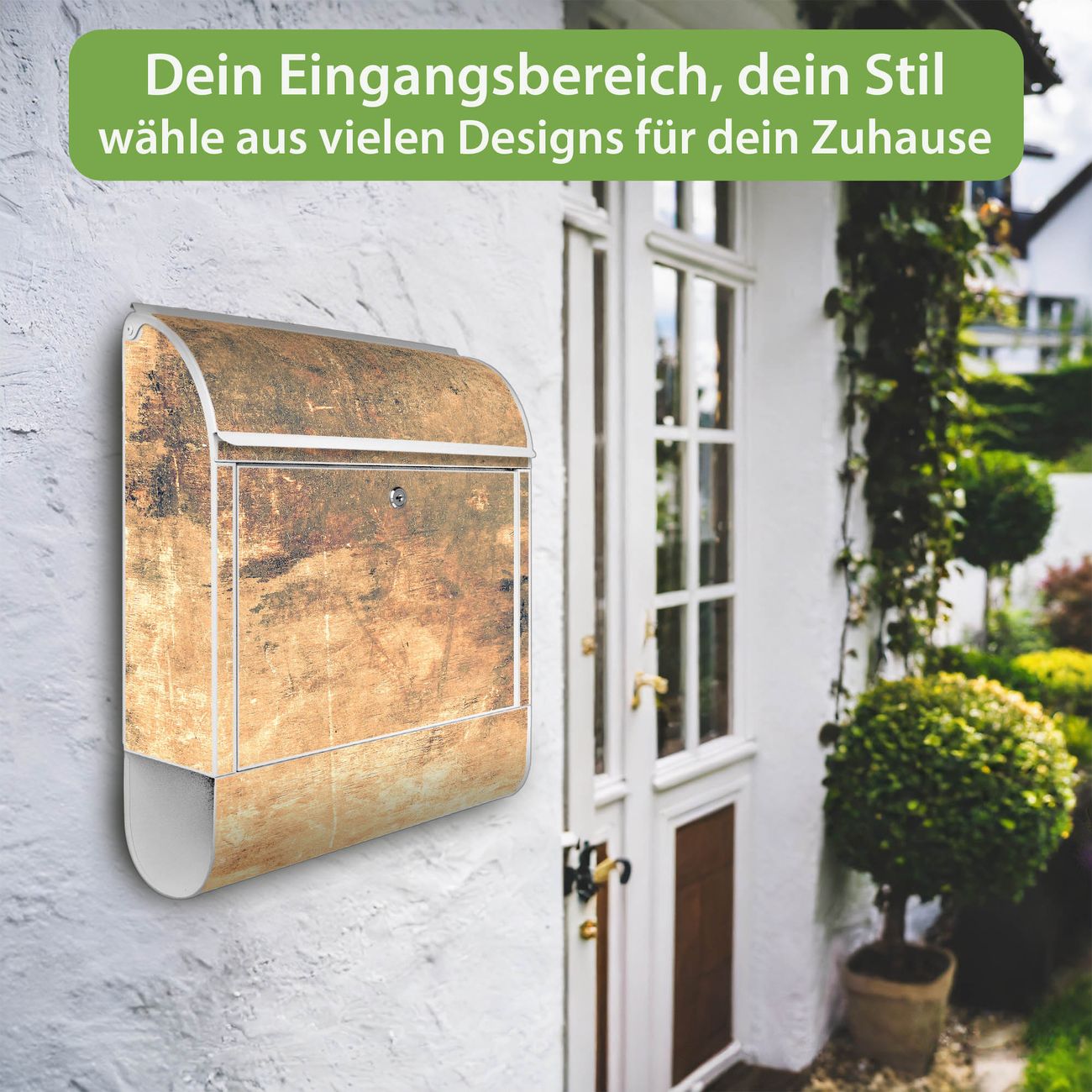 DESIGN: Der Postkasten mit Motiv Motiv Verwittertes Holz 2 hat ein sehr ansprechendes und ausgefallenes Design, damit entlocken Sie Ihren Nachbarn und dem Postboten ein Lächeln. Heben Sie Sich von der tristen grauen Masse ab, ohne auf Funktionalität zu verzichten. DETAILS: Der Postkasten besteht aus pulverbeschichtetem Stahl. Er ist 38x46x12,5cm groß. Das Motiv besteht aus einer wetter- und UV-resistenten Folie, die mit einem Schutzlaminat überzogen ist, sodass der Briefkasten zusätzlich vor Kratzern geschützt ist. Der Briefkasten wird mit Montagematerial, zusätzlich zwei Schlüssel sowie einer Bohrschablone geliefert. NUTZEN: Sie können diesen Briefkasten sowohl als Wandbriefkasten montieren oder einen passenden Ständer kaufen und als Standbriefkasten einbetonieren. Die Größe bietet genügend Platz für Sendungen aller Art, der Einwurf fasst auch größere A4 Sendungen. BANJADO: Ihr Briefkasten wird in Sachsen in einer kleinen Manufaktur von Hand veredelt. Die Motivfolie ist lösungsmittelfrei und schutzlaminiert für einen langen Halt. Wir legen großen Wert auf die Verbindung von Funktionalität und Design. Sie erhalten Handarbeit aus Sachsen.