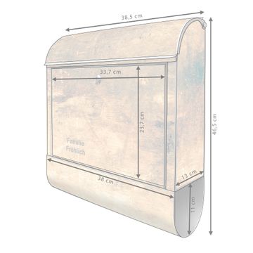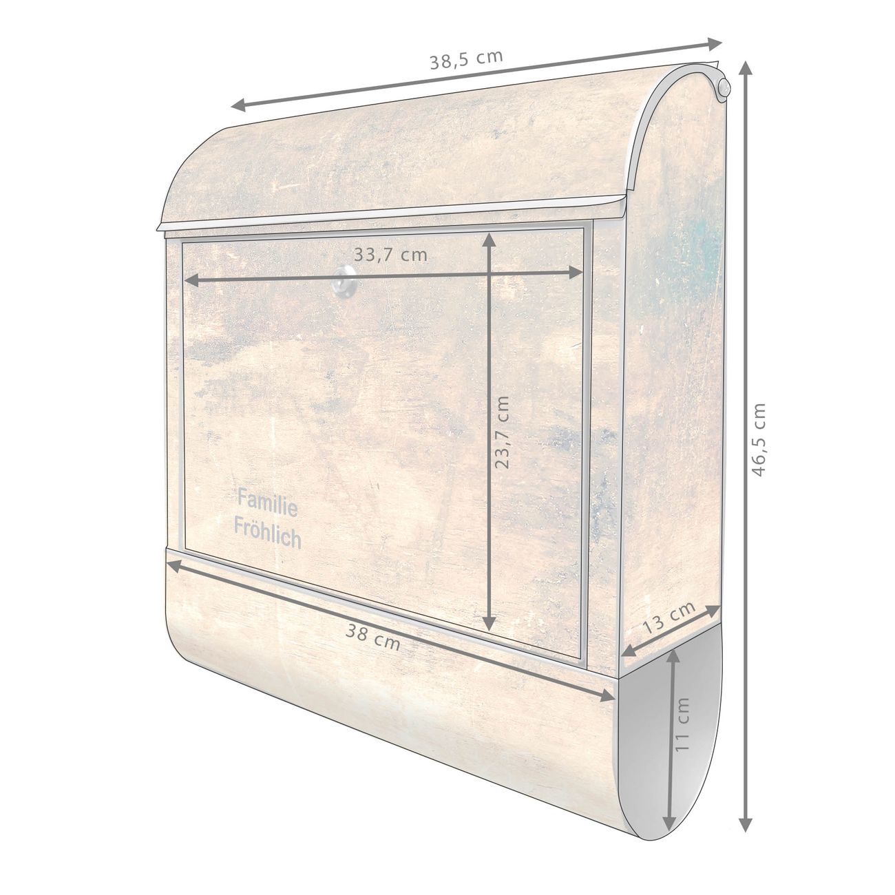 DESIGN: Der Postkasten mit Motiv Motiv Verwittertes Holz 2 hat ein sehr ansprechendes und ausgefallenes Design, damit entlocken Sie Ihren Nachbarn und dem Postboten ein Lächeln. Heben Sie Sich von der tristen grauen Masse ab, ohne auf Funktionalität zu verzichten. DETAILS: Der Postkasten besteht aus pulverbeschichtetem Stahl. Er ist 38x46x12,5cm groß. Das Motiv besteht aus einer wetter- und UV-resistenten Folie, die mit einem Schutzlaminat überzogen ist, sodass der Briefkasten zusätzlich vor Kratzern geschützt ist. Der Briefkasten wird mit Montagematerial, zusätzlich zwei Schlüssel sowie einer Bohrschablone geliefert. NUTZEN: Sie können diesen Briefkasten sowohl als Wandbriefkasten montieren oder einen passenden Ständer kaufen und als Standbriefkasten einbetonieren. Die Größe bietet genügend Platz für Sendungen aller Art, der Einwurf fasst auch größere A4 Sendungen. BANJADO: Ihr Briefkasten wird in Sachsen in einer kleinen Manufaktur von Hand veredelt. Die Motivfolie ist lösungsmittelfrei und schutzlaminiert für einen langen Halt. Wir legen großen Wert auf die Verbindung von Funktionalität und Design. Sie erhalten Handarbeit aus Sachsen.