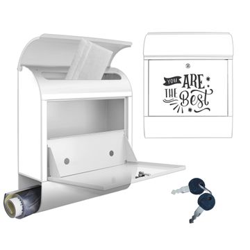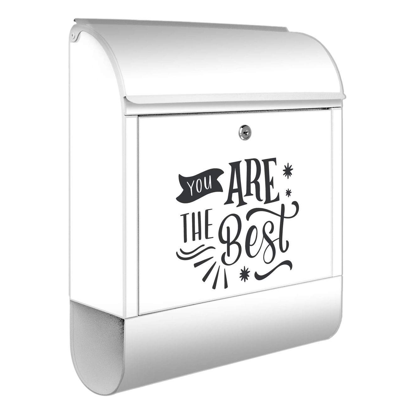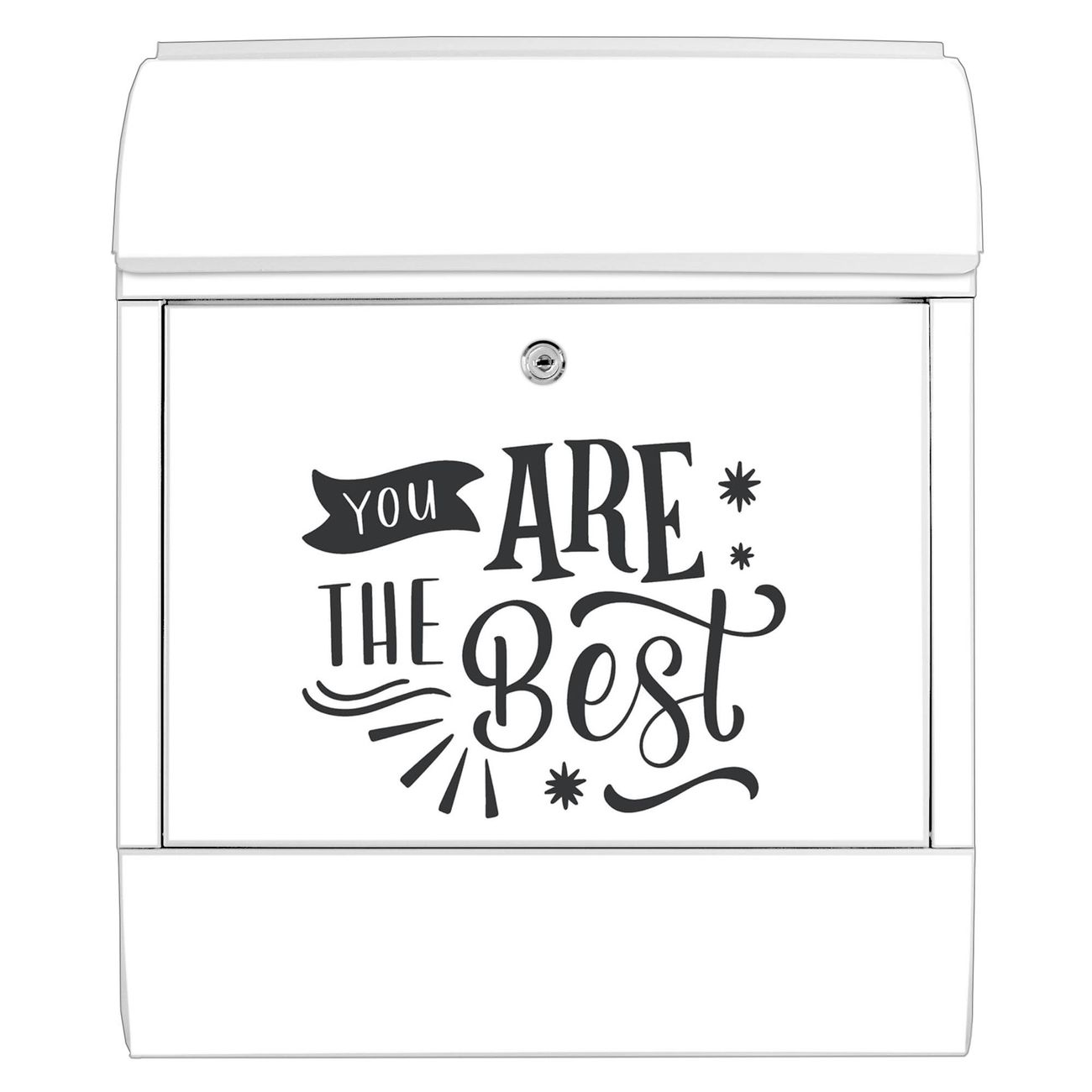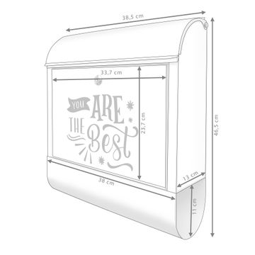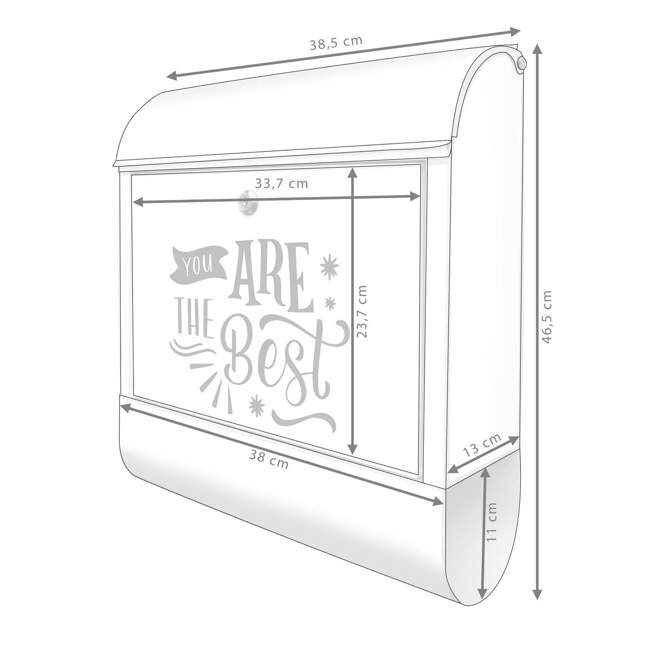 DESIGN: Der Postkasten mit Motiv Motiv You are the Best hat ein sehr ansprechendes und ausgefallenes Design, damit entlocken Sie Ihren Nachbarn und dem Postboten ein Lächeln. Heben Sie Sich von der tristen grauen Masse ab, ohne auf Funktionalität zu verzichten. DETAILS: Der Postkasten besteht aus pulverbeschichtetem Stahl. Er ist 38x46x12,5cm groß. Das Motiv besteht aus einer wetter- und UV-resistenten Folie, die mit einem Schutzlaminat überzogen ist, sodass der Briefkasten zusätzlich vor Kratzern geschützt ist. Der Briefkasten wird mit Montagematerial, zusätzlich zwei Schlüssel sowie einer Bohrschablone geliefert. NUTZEN: Sie können diesen Briefkasten sowohl als Wandbriefkasten montieren oder einen passenden Ständer kaufen und als Standbriefkasten einbetonieren. Die Größe bietet genügend Platz für Sendungen aller Art, der Einwurf fasst auch größere A4 Sendungen. BANJADO: Ihr Briefkasten wird in Sachsen in einer kleinen Manufaktur von Hand veredelt. Die Motivfolie ist lösungsmittelfrei und schutzlaminiert für einen langen Halt. Wir legen großen Wert auf die Verbindung von Funktionalität und Design. Sie erhalten Handarbeit aus Sachsen.