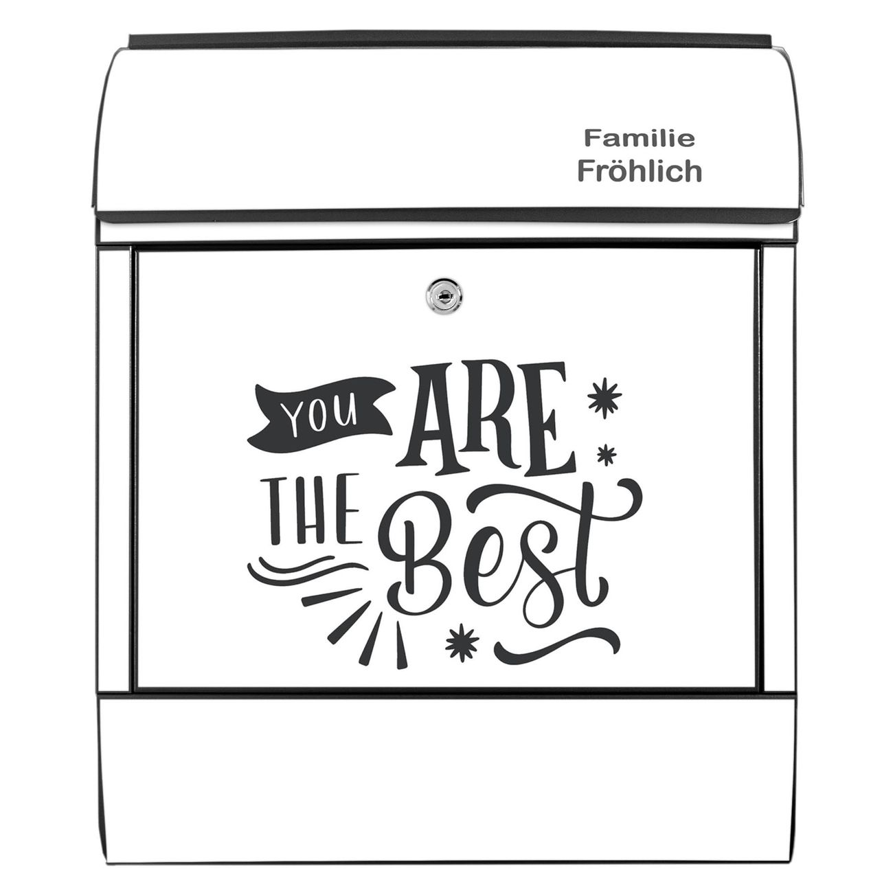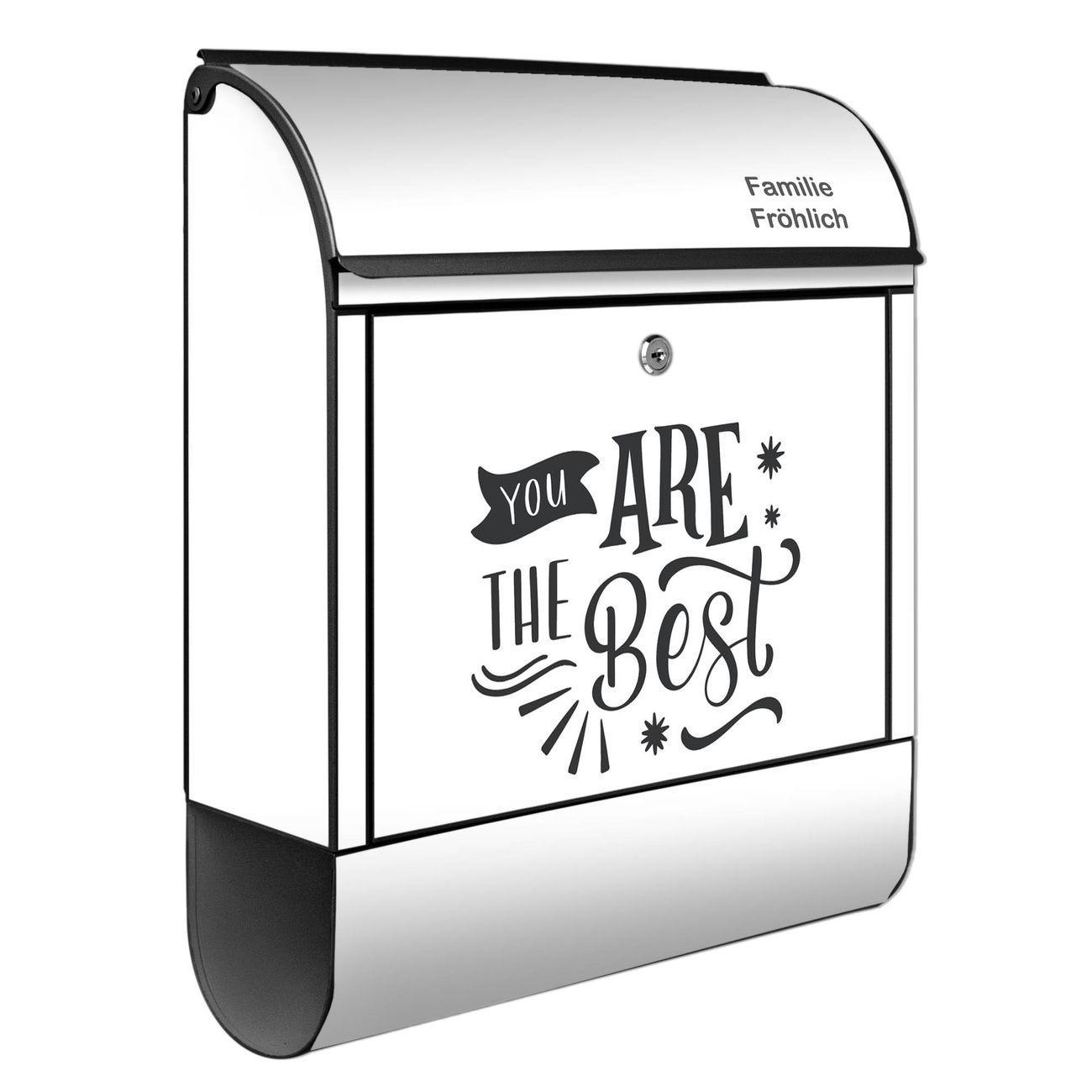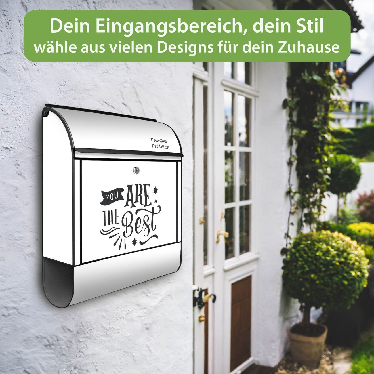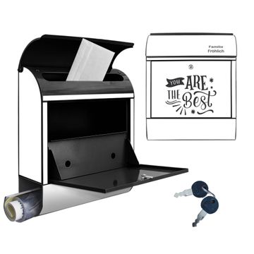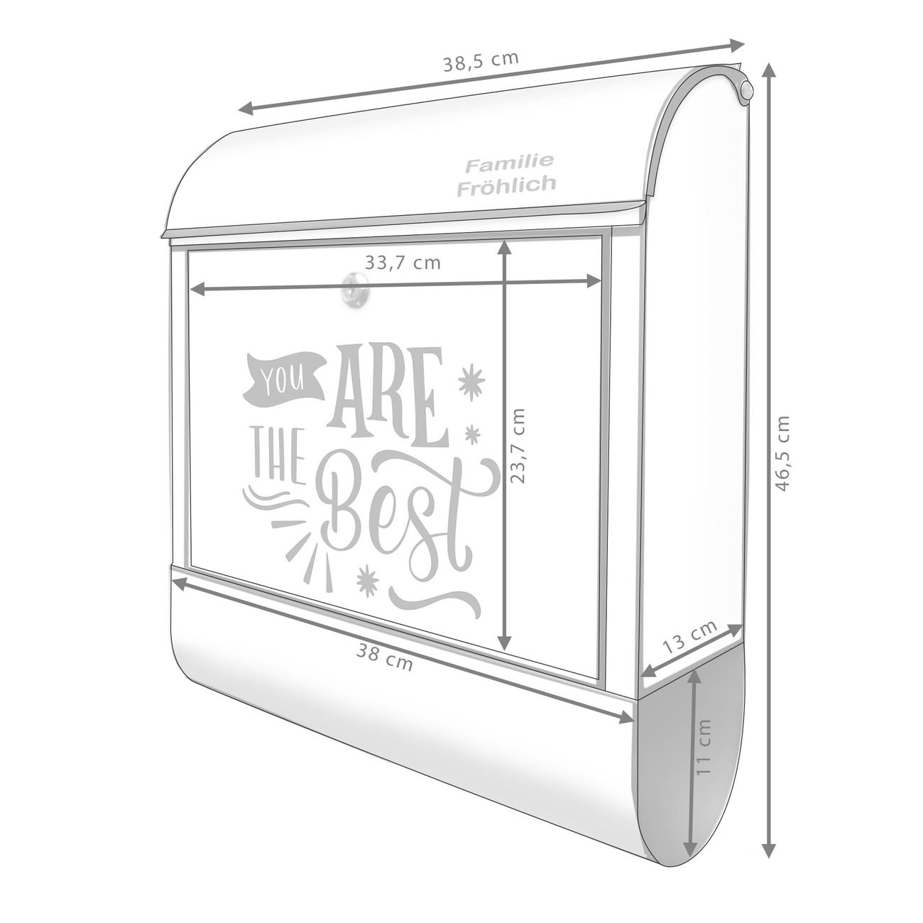 DESIGN: Der Postkasten mit Motiv Motiv You are the Best hat ein sehr ansprechendes und ausgefallenes Design, damit entlocken Sie Ihren Nachbarn und dem Postboten ein Lächeln. Heben Sie Sich von der tristen grauen Masse ab, ohne auf Funktionalität zu verzichten. DETAILS: Der Postkasten besteht aus pulverbeschichtetem Stahl. Er ist 38x46x12,5cm groß. Das Motiv besteht aus einer wetter- und UV-resistenten Folie, die mit einem Schutzlaminat überzogen ist, sodass der Briefkasten zusätzlich vor Kratzern geschützt ist. Der Briefkasten wird mit Montagematerial, zusätzlich zwei Schlüssel sowie einer Bohrschablone geliefert. NUTZEN: Sie können diesen Briefkasten sowohl als Wandbriefkasten montieren oder einen passenden Ständer kaufen und als Standbriefkasten einbetonieren. Die Größe bietet genügend Platz für Sendungen aller Art, der Einwurf fasst auch größere A4 Sendungen. BANJADO: Ihr Briefkasten wird in Sachsen in einer kleinen Manufaktur von Hand veredelt. Die Motivfolie ist lösungsmittelfrei und schutzlaminiert für einen langen Halt. Wir legen großen Wert auf die Verbindung von Funktionalität und Design. Sie erhalten Handarbeit aus Sachsen.