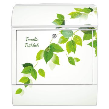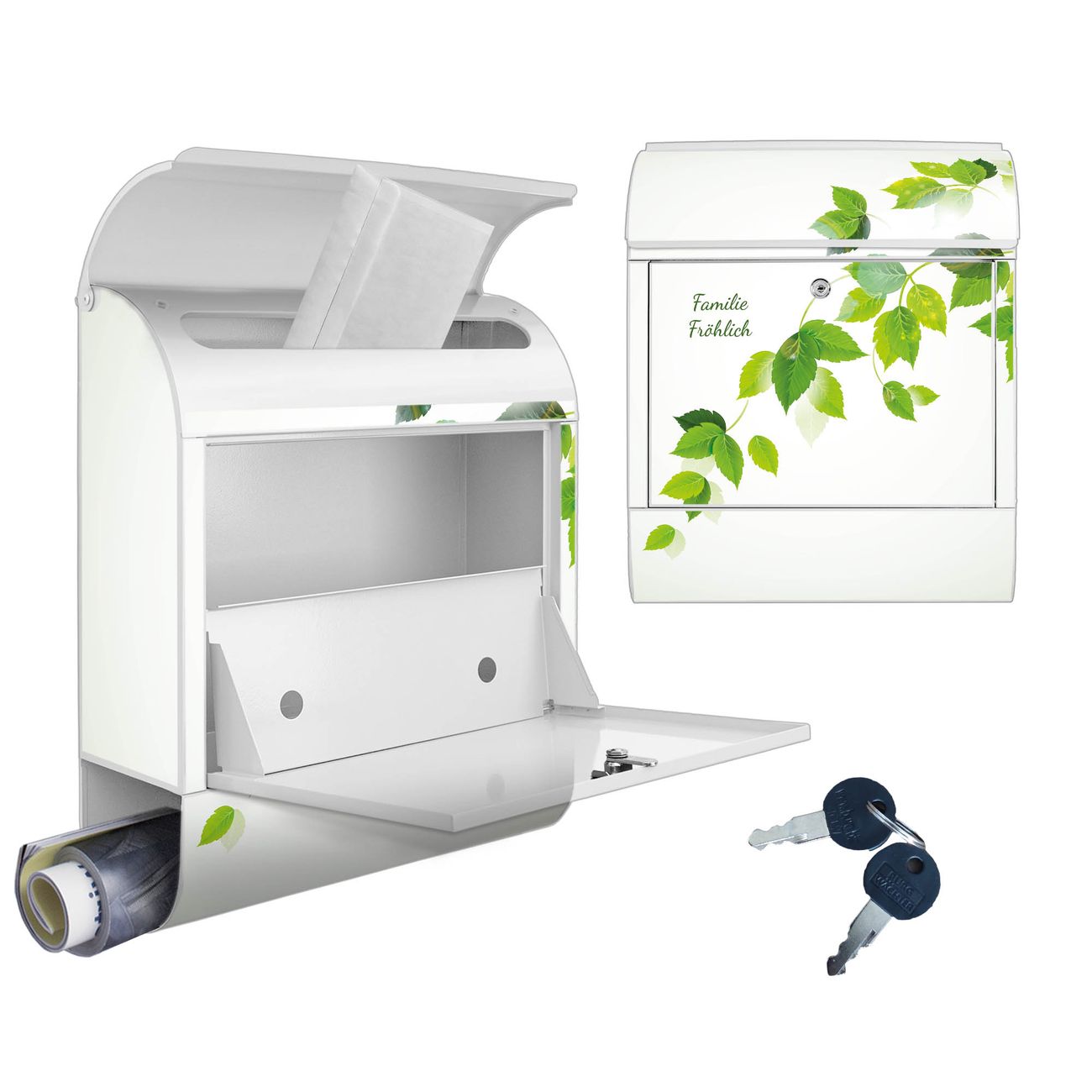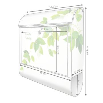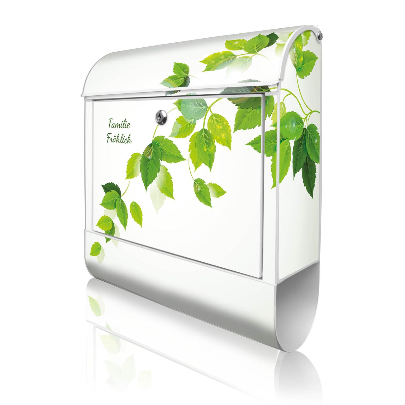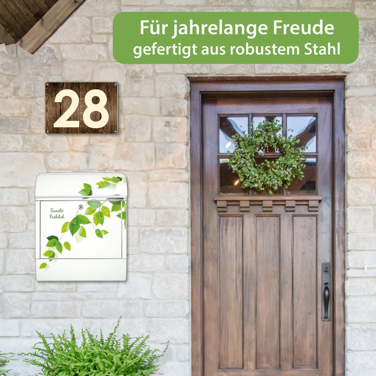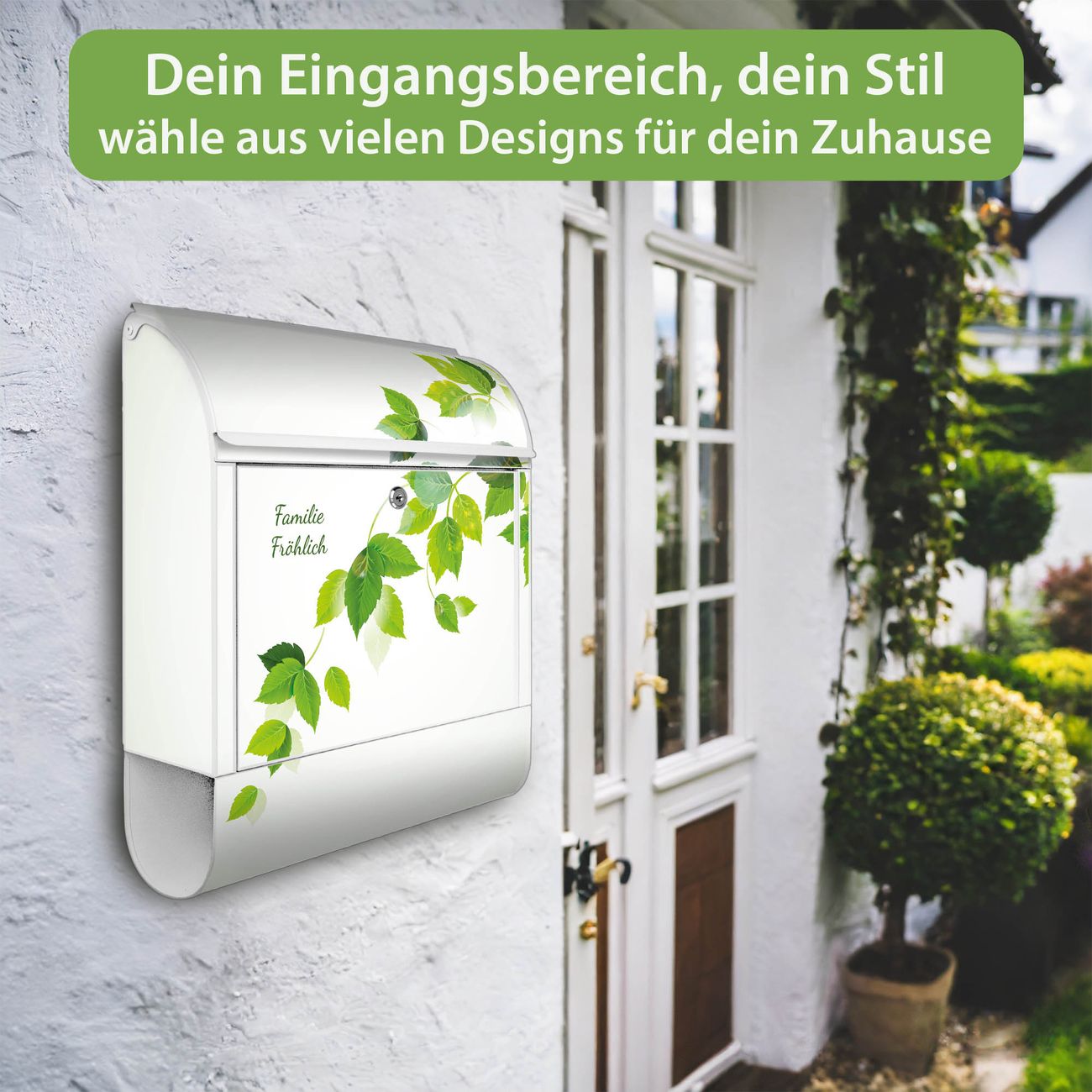 Motiv Ranke Gelb Weiß Nr. 10355 Material weiß pulverbeschichtetes Stahlblech Dekorfolie UV-beständig, wetterfest Gesamtgröße 38x47x13cm BxHxT Briefschlitz 33x3,5cm BxH Gewicht ca. 3,5 kg Zubehör Montagezubehör, 2 Schlüssel, Bohrschablone