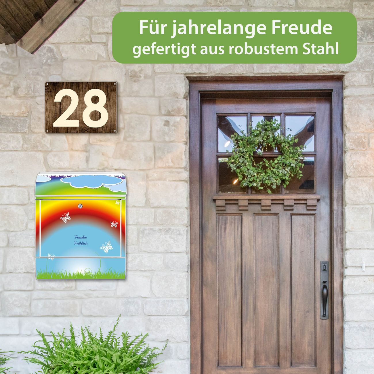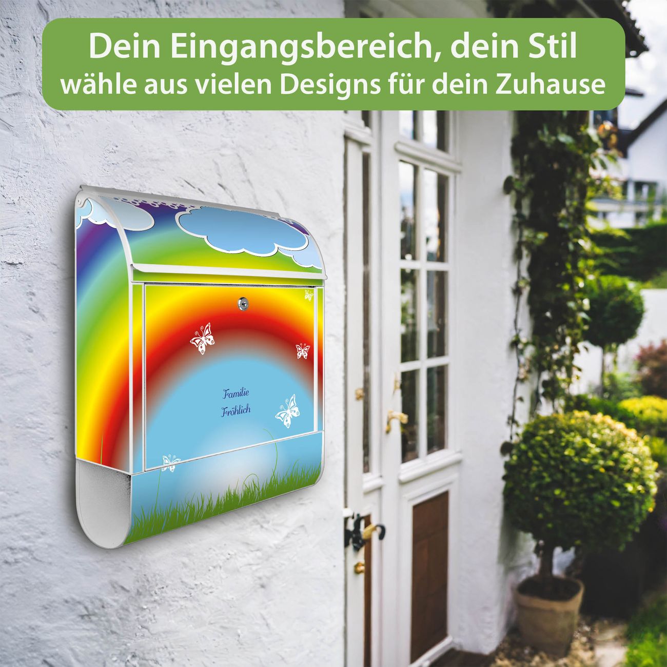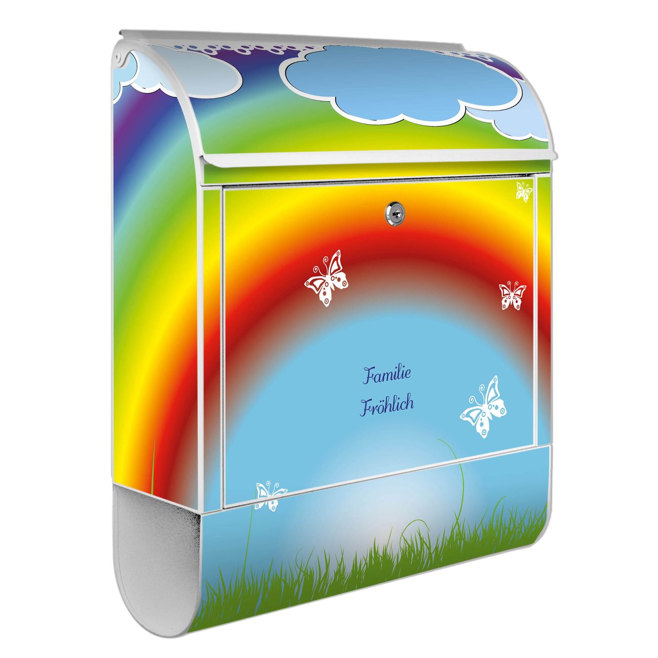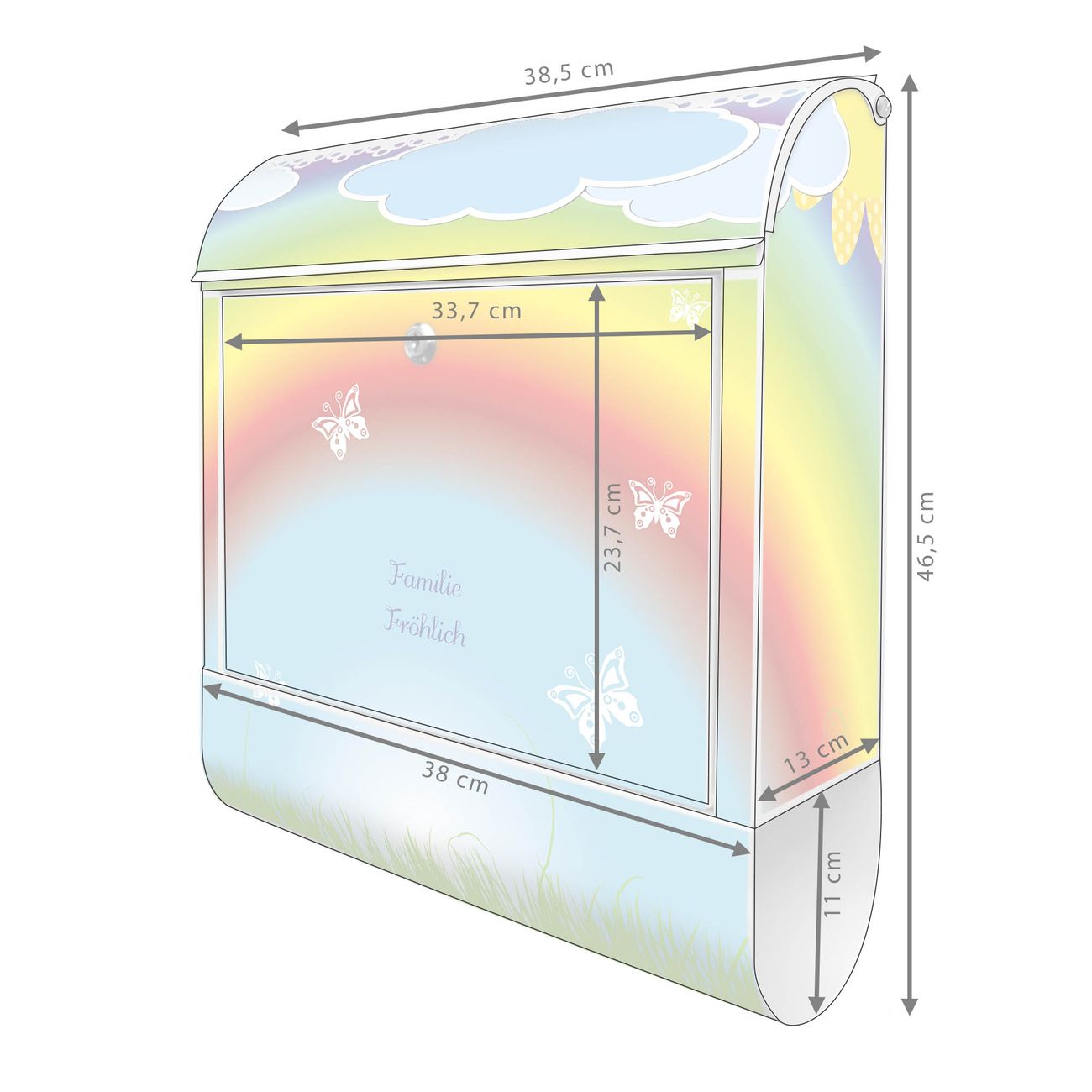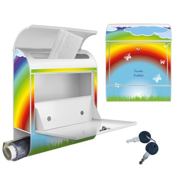 Motiv Regenbogen Nr. 10232 Material: weiß pulverbeschichtetes Stahlblech Dekorfolie: UV-beständig, wetterfest Gesamtgröße: 38x46x12,5cm BxHxT Briefschlitz: 33x3,5cm BxH Gewicht: ca. 3,4 kg Zubehör: Montagezubehör, 2 Schlüssel, Bohrschablone
