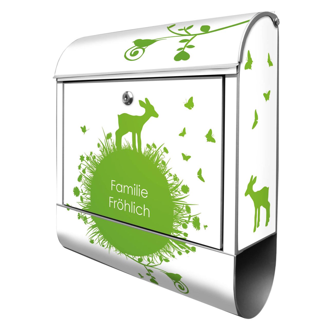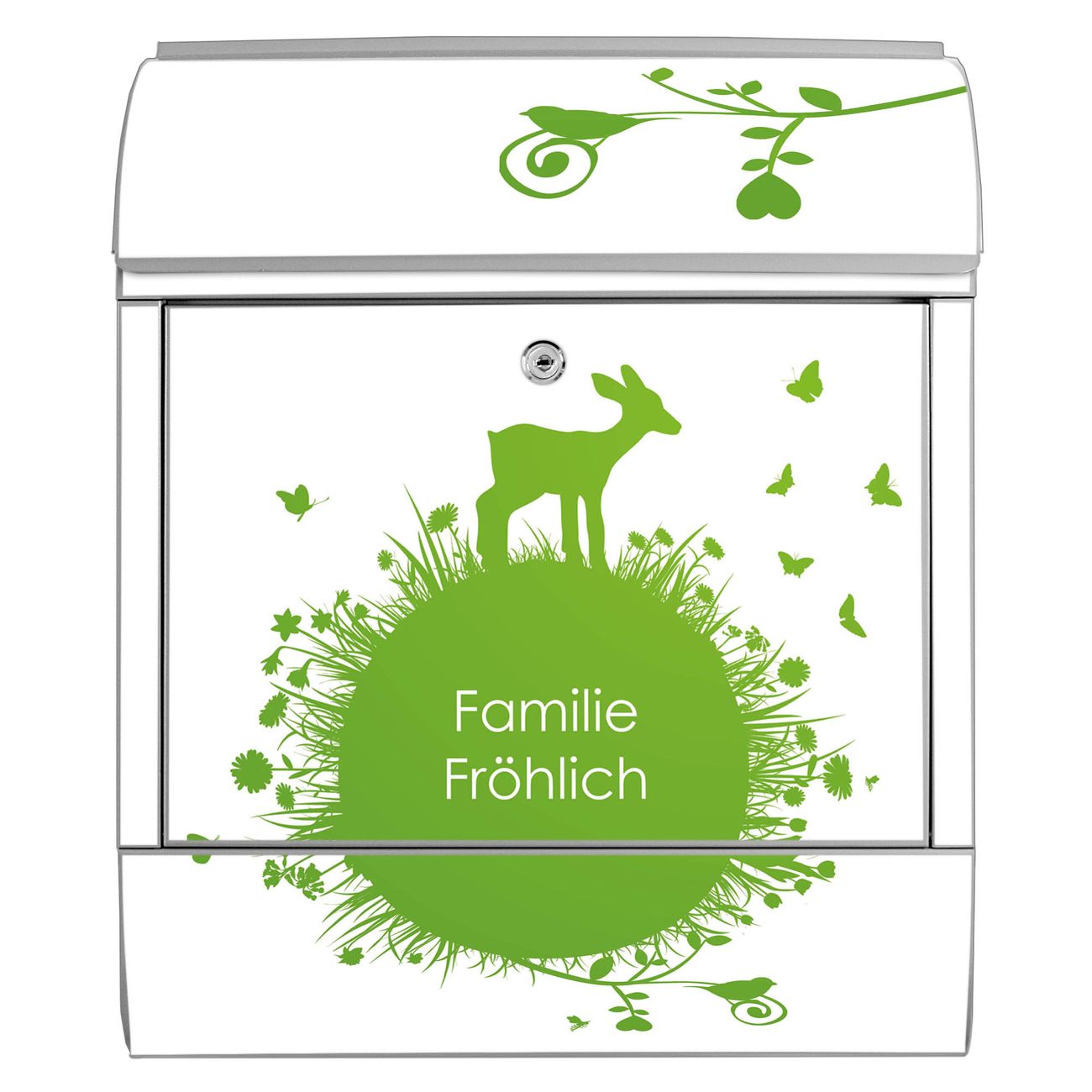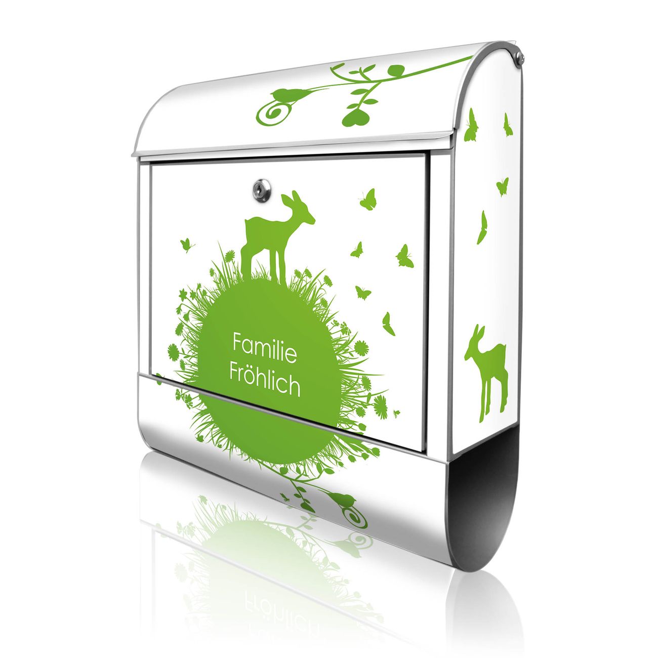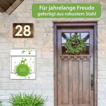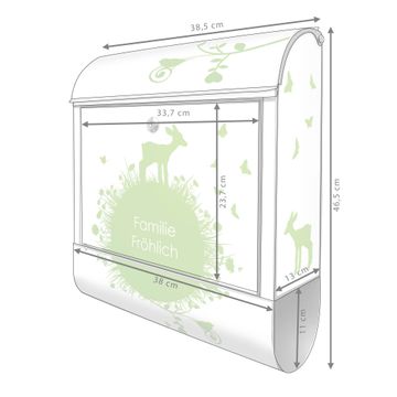 DESIGN: Der Postkasten mit Motiv Motiv Rehkitz hat ein sehr ansprechendes und ausgefallenes Design, damit entlocken Sie Ihren Nachbarn und dem Postboten ein Lächeln. Heben Sie Sich von der tristen grauen Masse ab, ohne auf Funktionalität zu verzichten. DETAILS: Der Postkasten besteht aus pulverbeschichtetem Stahl. Er ist 38x46x12,5cm groß. Das Motiv besteht aus einer wetter- und UV-resistenten Folie, die mit einem Schutzlaminat überzogen ist, sodass der Briefkasten zusätzlich vor Kratzern geschützt ist. Der Briefkasten wird mit Montagematerial, zusätzlich zwei Schlüssel sowie einer Bohrschablone geliefert. NUTZEN: Sie können diesen Briefkasten sowohl als Wandbriefkasten montieren oder einen passenden Ständer kaufen und als Standbriefkasten einbetonieren. Die Größe bietet genügend Platz für Sendungen aller Art, der Einwurf fasst auch größere A4 Sendungen. BANJADO: Ihr Briefkasten wird in Sachsen in einer kleinen Manufaktur von Hand veredelt. Die Motivfolie ist lösungsmittelfrei und schutzlaminiert für einen langen Halt. Wir legen großen Wert auf die Verbindung von Funktionalität und Design. Sie erhalten Handarbeit aus Sachsen.