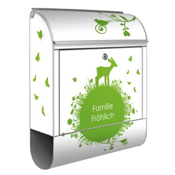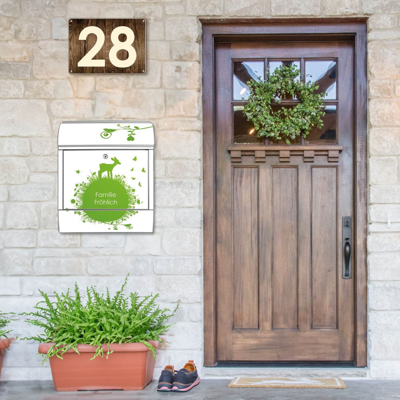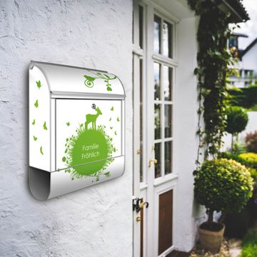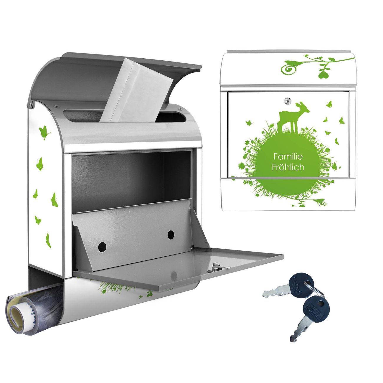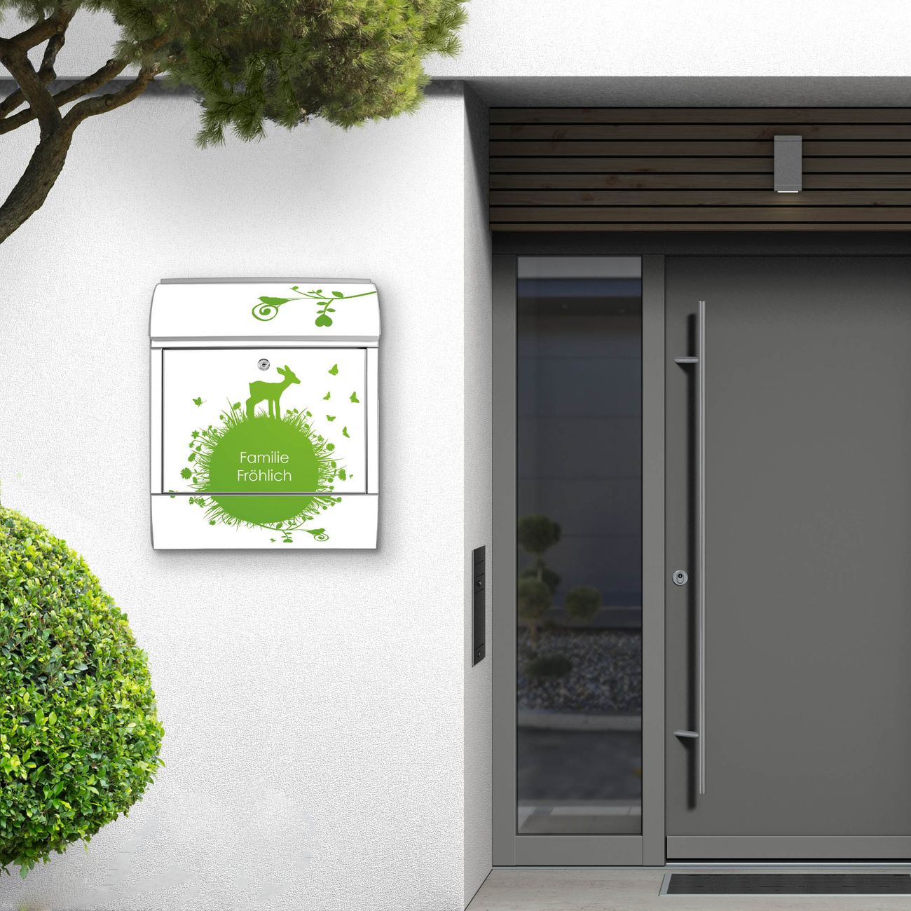 DESIGN: Der Postkasten mit Motiv Motiv Rehkitz hat ein sehr ansprechendes und ausgefallenes Design, damit entlocken Sie Ihren Nachbarn und dem Postboten ein Lächeln. Heben Sie Sich von der tristen grauen Masse ab, ohne auf Funktionalität zu verzichten. DETAILS: Der Postkasten besteht aus pulverbeschichtetem Stahl. Er ist 38x46x12,5cm groß. Das Motiv besteht aus einer wetter- und UV-resistenten Folie, die mit einem Schutzlaminat überzogen ist, sodass der Briefkasten zusätzlich vor Kratzern geschützt ist. Der Briefkasten wird mit Montagematerial, zusätzlich zwei Schlüssel sowie einer Bohrschablone geliefert. NUTZEN: Sie können diesen Briefkasten sowohl als Wandbriefkasten montieren oder einen passenden Ständer kaufen und als Standbriefkasten einbetonieren. Die Größe bietet genügend Platz für Sendungen aller Art, der Einwurf fasst auch größere A4 Sendungen. BANJADO: Ihr Briefkasten wird in Sachsen in einer kleinen Manufaktur von Hand veredelt. Die Motivfolie ist lösungsmittelfrei und schutzlaminiert für einen langen Halt. Wir legen großen Wert auf die Verbindung von Funktionalität und Design. Sie erhalten Handarbeit aus Sachsen.