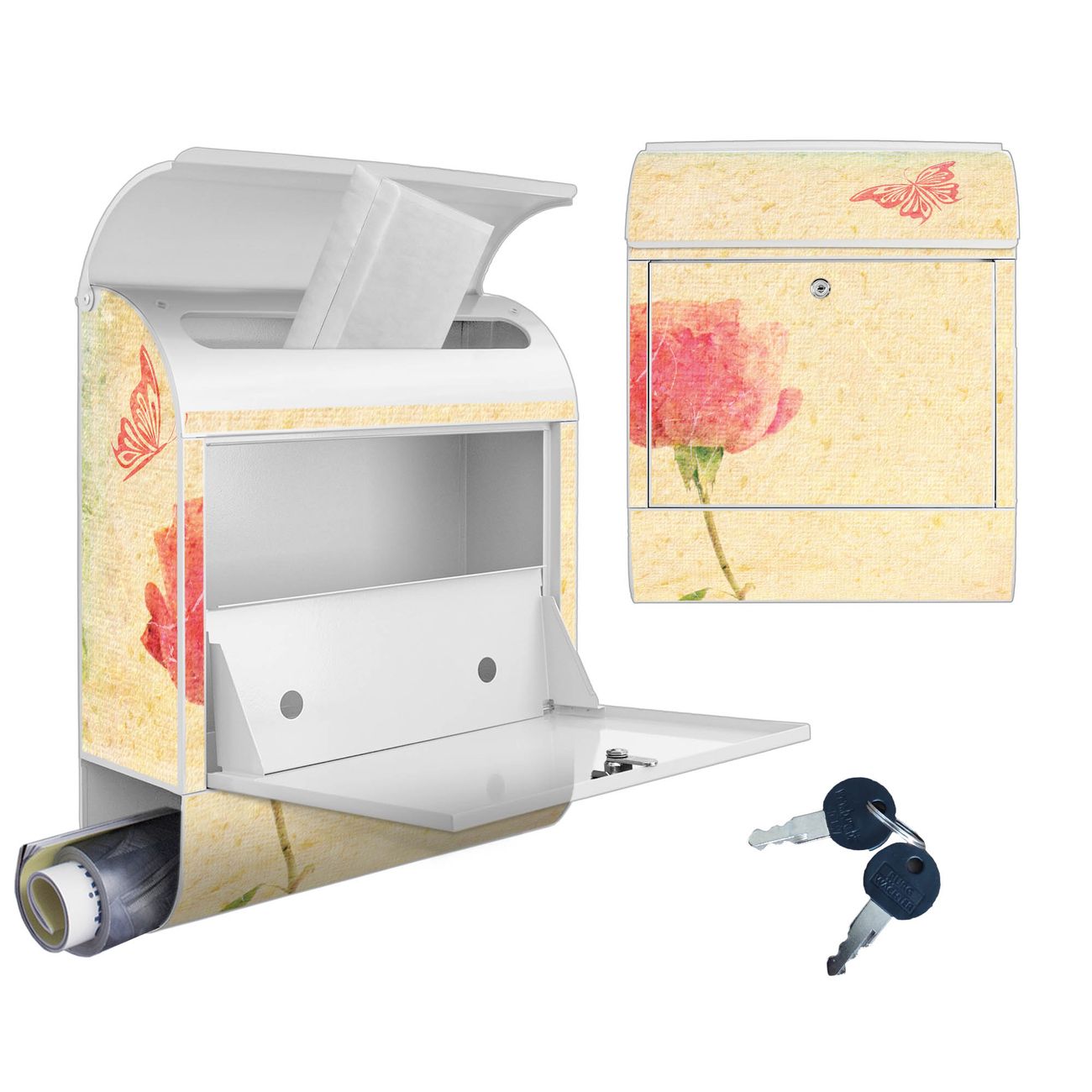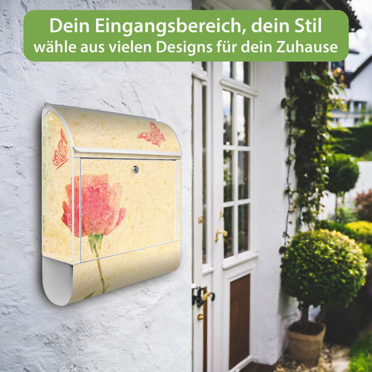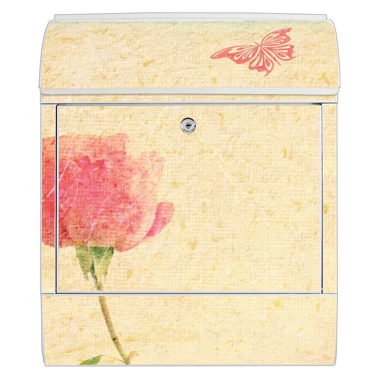 Motiv Romantik Nr. 10369 Material weiß pulverbeschichtetes Stahlblech Dekorfolie UV-beständig, wetterfest Gesamtgröße 38x47x13cm BxHxT Briefschlitz 33x3,5cm BxH Gewicht ca. 3,5 kg Zubehör Montagezubehör, 2 Schlüssel, Bohrschablone