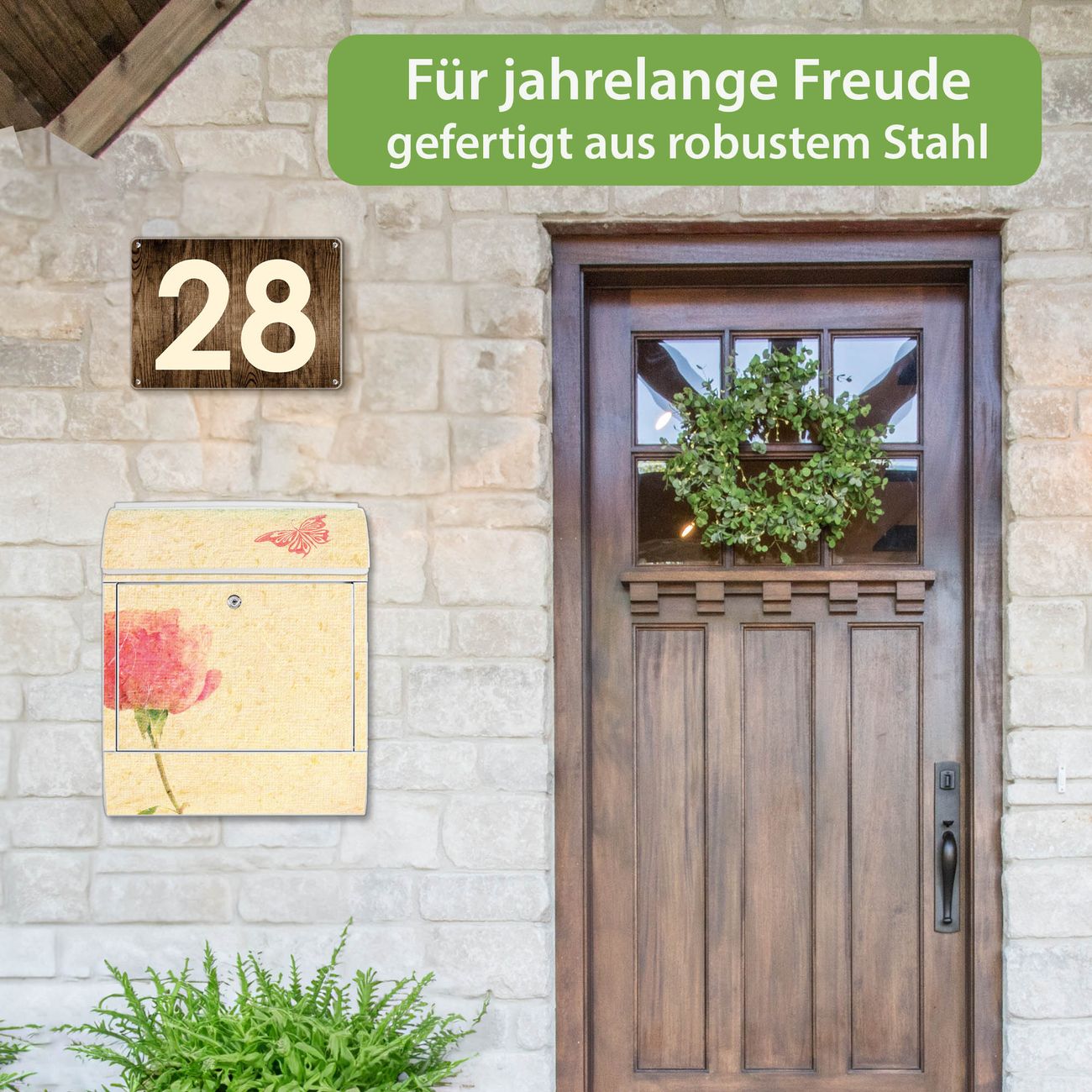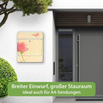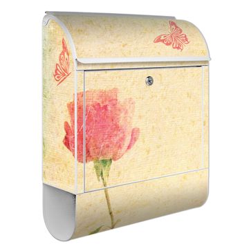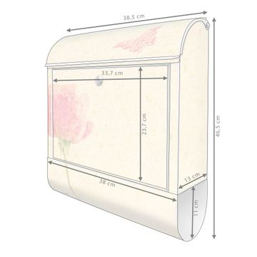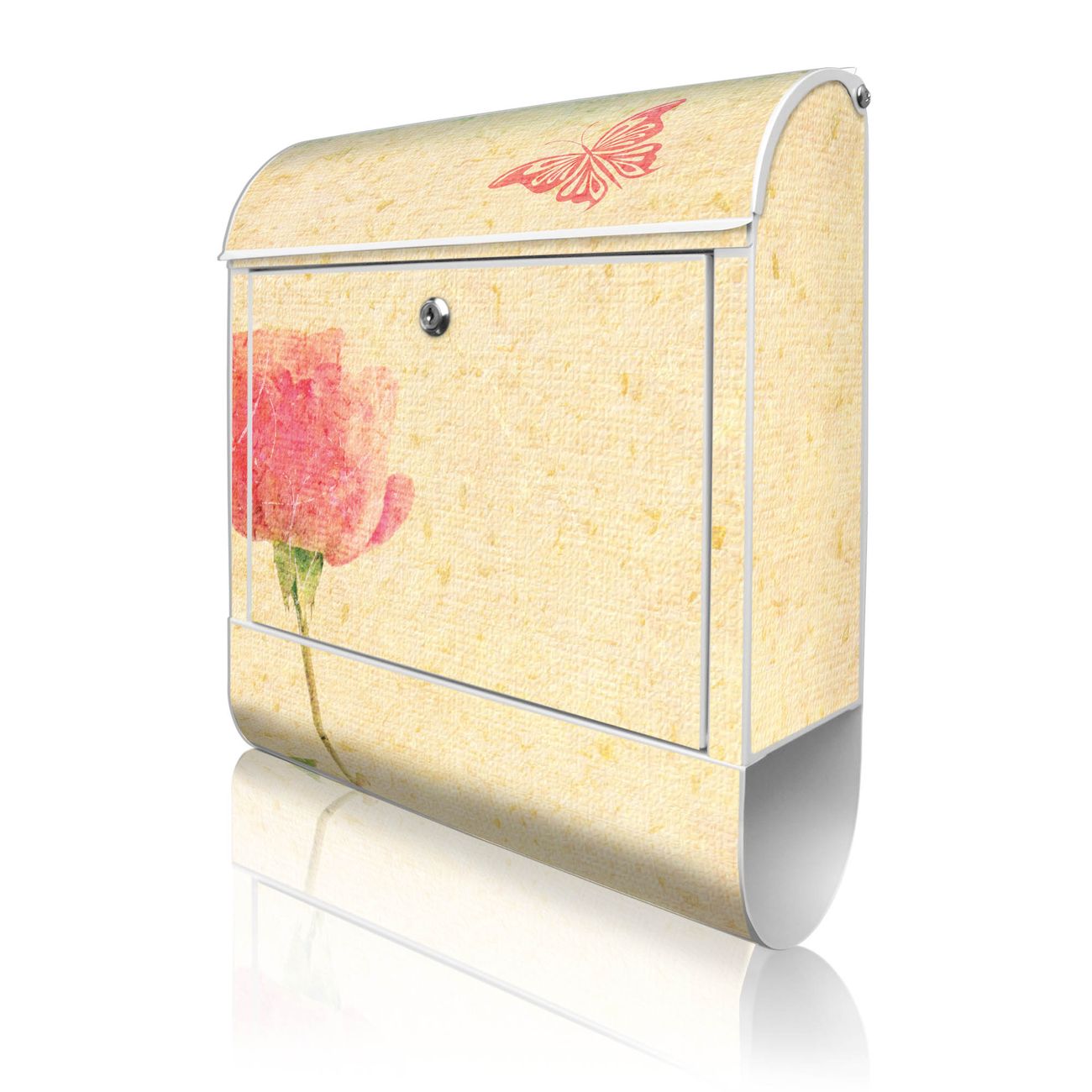 Motiv Romantik Nr. 10369 Material weiß pulverbeschichtetes Stahlblech Dekorfolie UV-beständig, wetterfest Gesamtgröße 38x47x13cm BxHxT Briefschlitz 33x3,5cm BxH Gewicht ca. 3,5 kg Zubehör Montagezubehör, 2 Schlüssel, Bohrschablone
