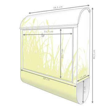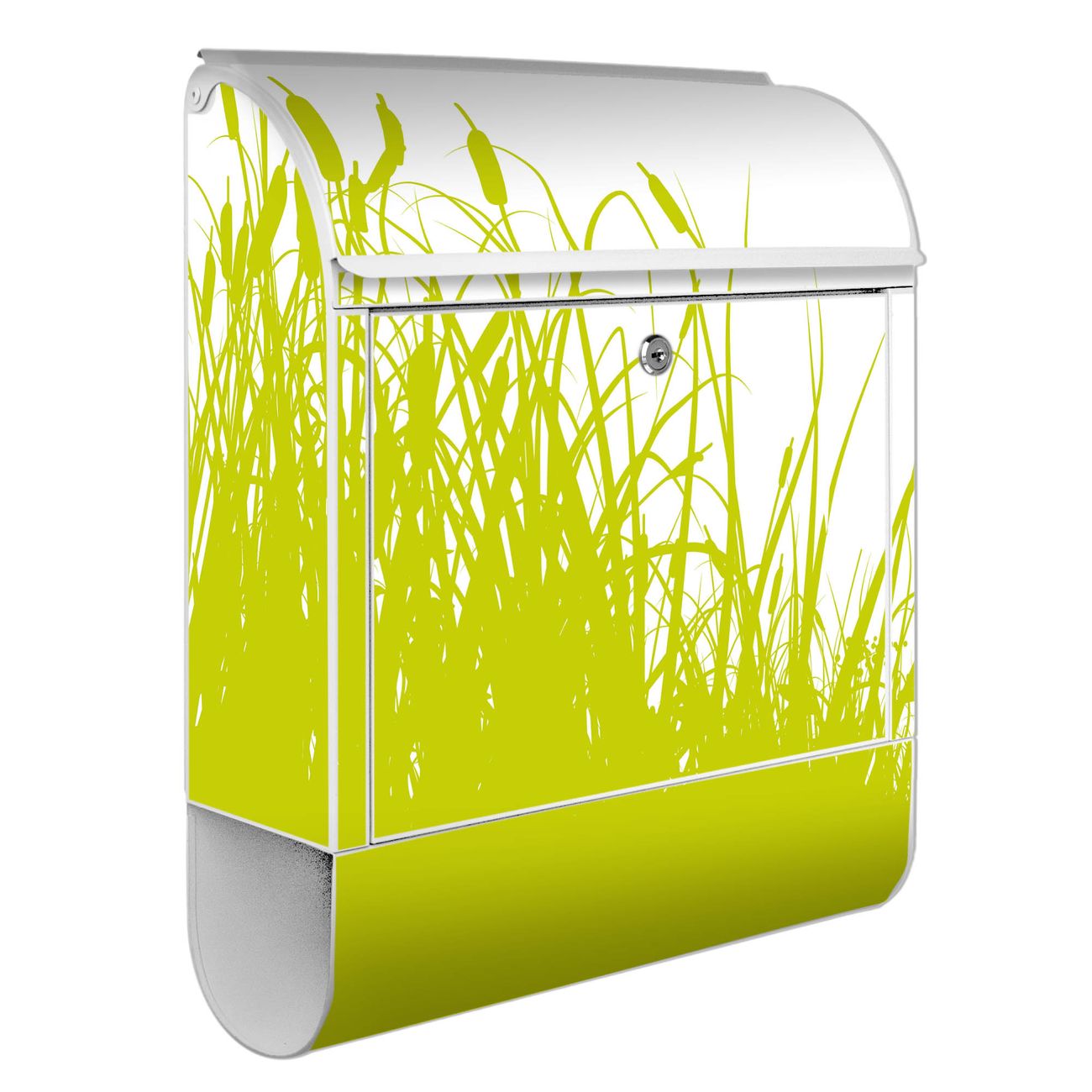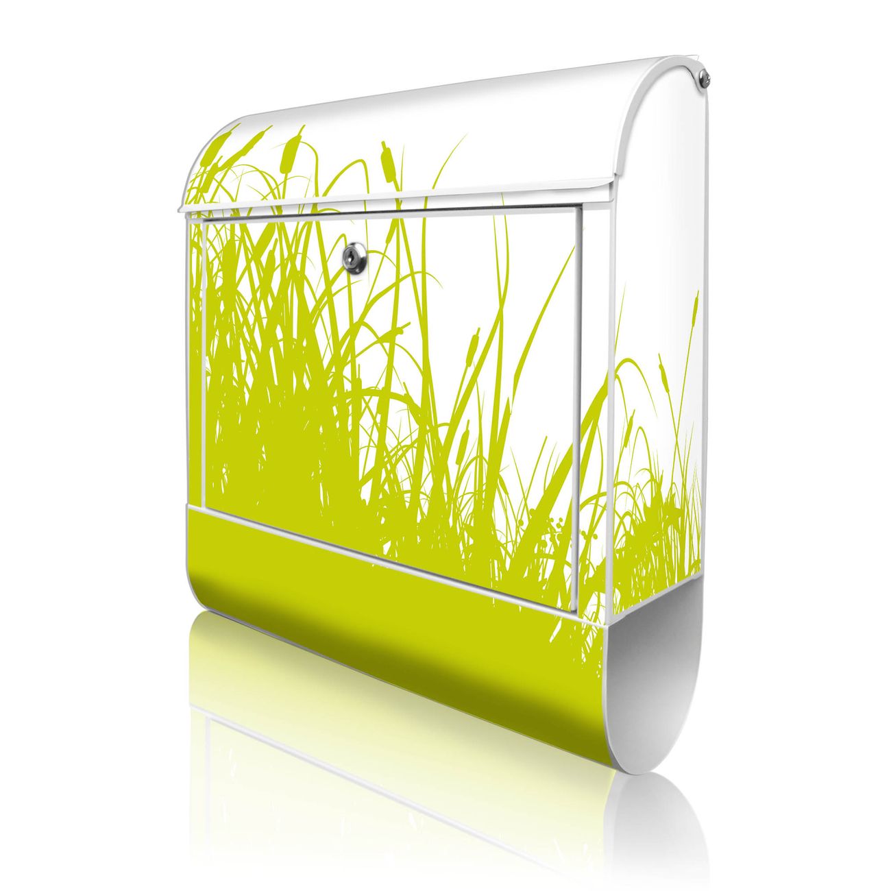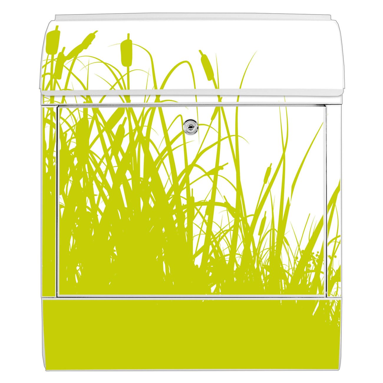 Motiv Schilf Nr. 10371 Material weiß pulverbeschichtetes Stahlblech Dekorfolie UV-beständig, wetterfest Gesamtgröße 38x47x13cm BxHxT Briefschlitz 33x3,5cm BxH Gewicht ca. 3,5 kg Zubehör Montagezubehör, 2 Schlüssel, Bohrschablone