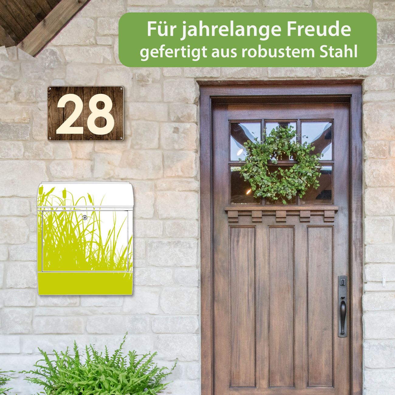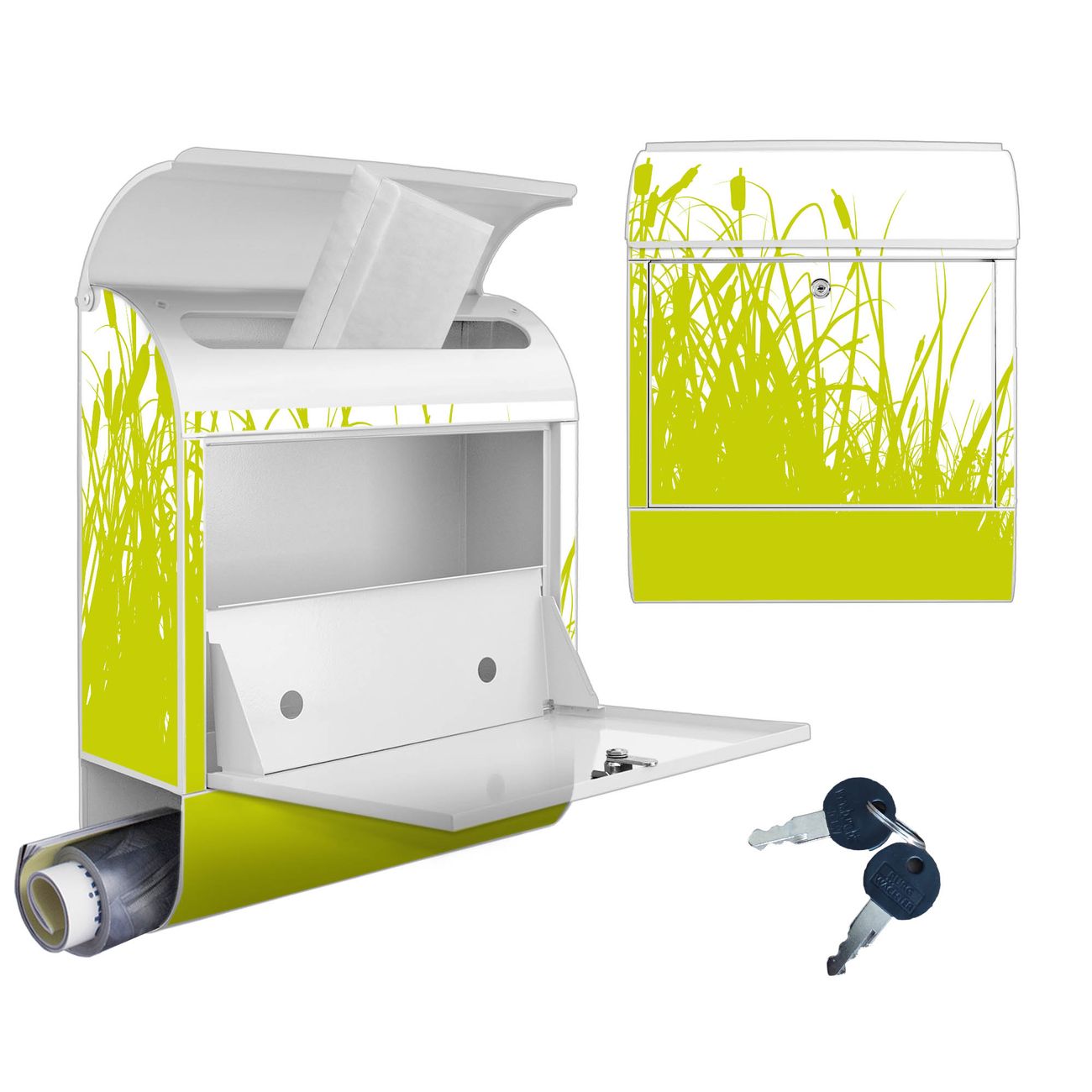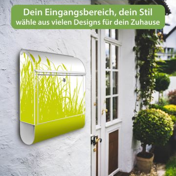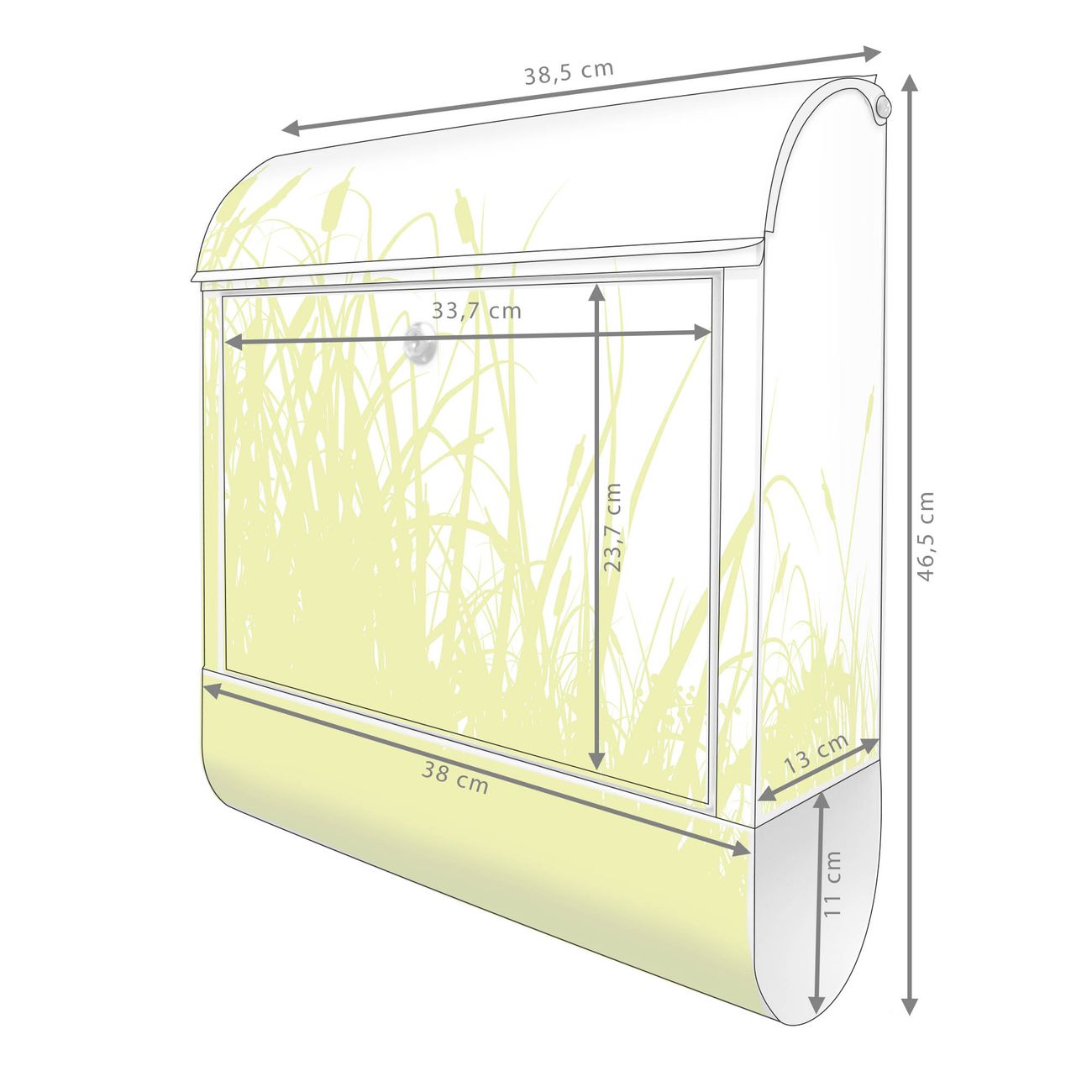 Motiv Schilf Nr. 10371 Material weiß pulverbeschichtetes Stahlblech Dekorfolie UV-beständig, wetterfest Gesamtgröße 38x47x13cm BxHxT Briefschlitz 33x3,5cm BxH Gewicht ca. 3,5 kg Zubehör Montagezubehör, 2 Schlüssel, Bohrschablone
