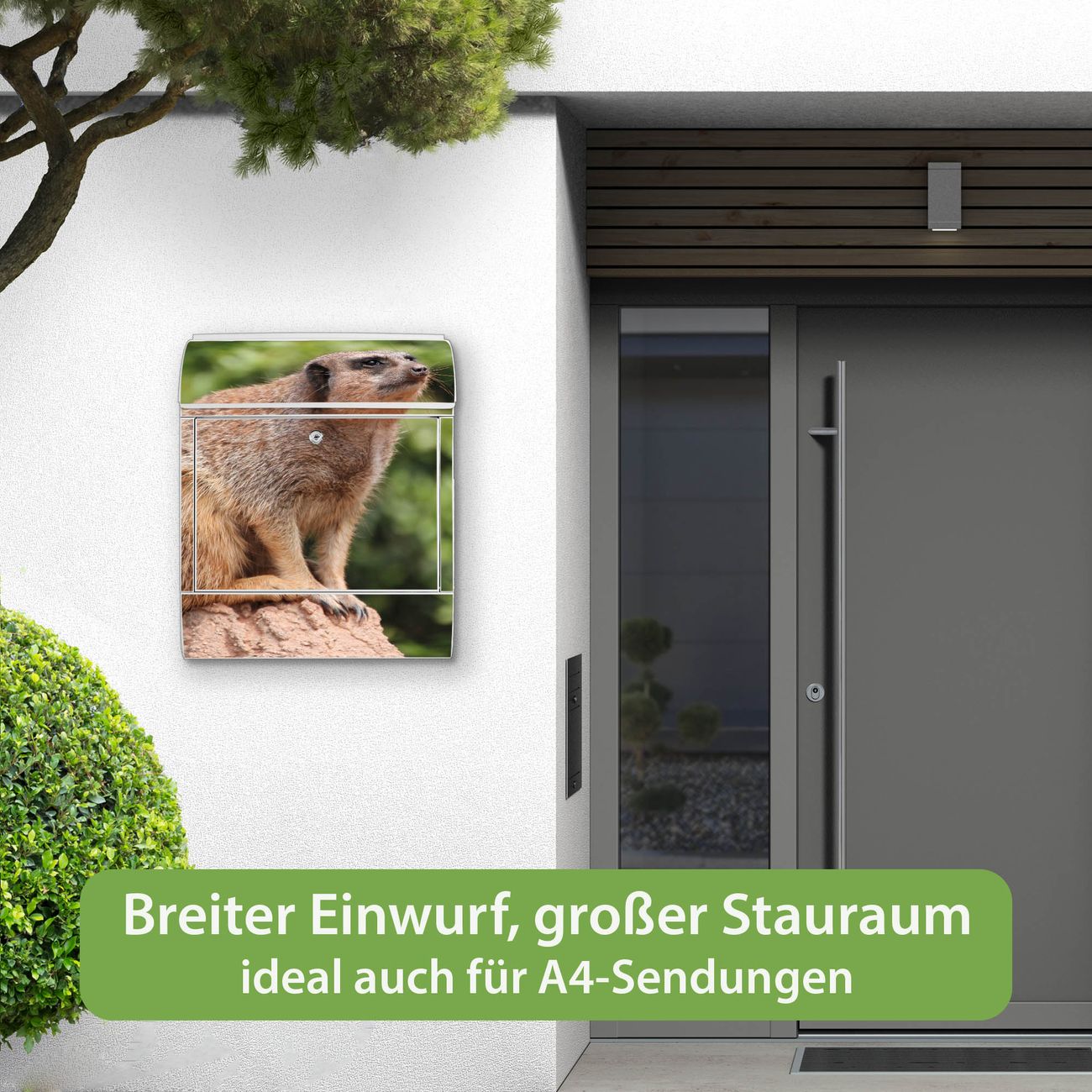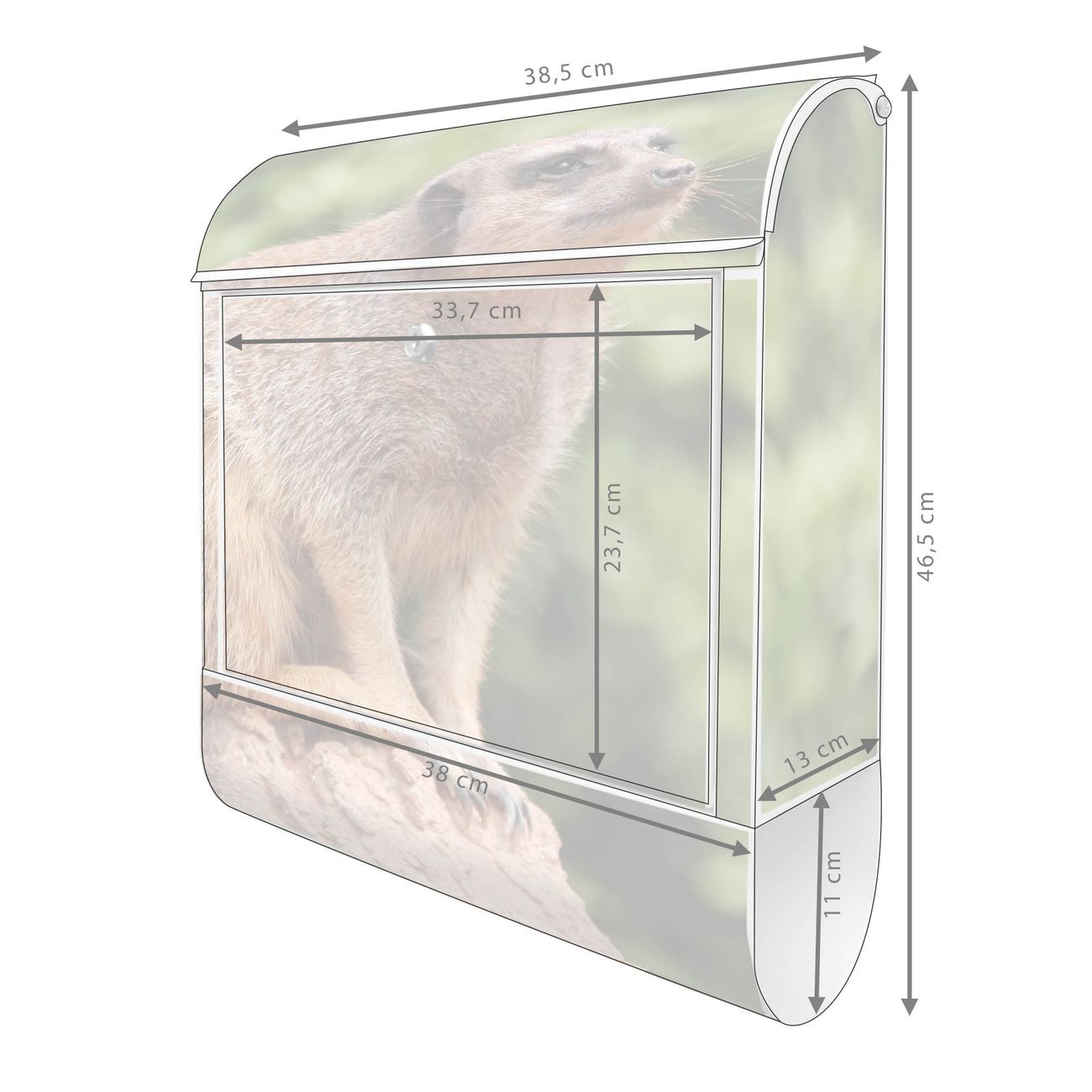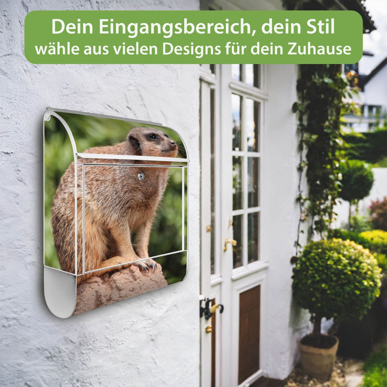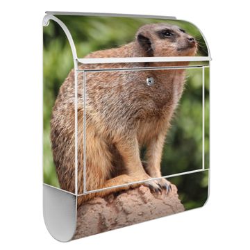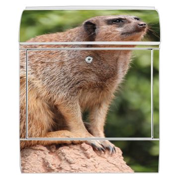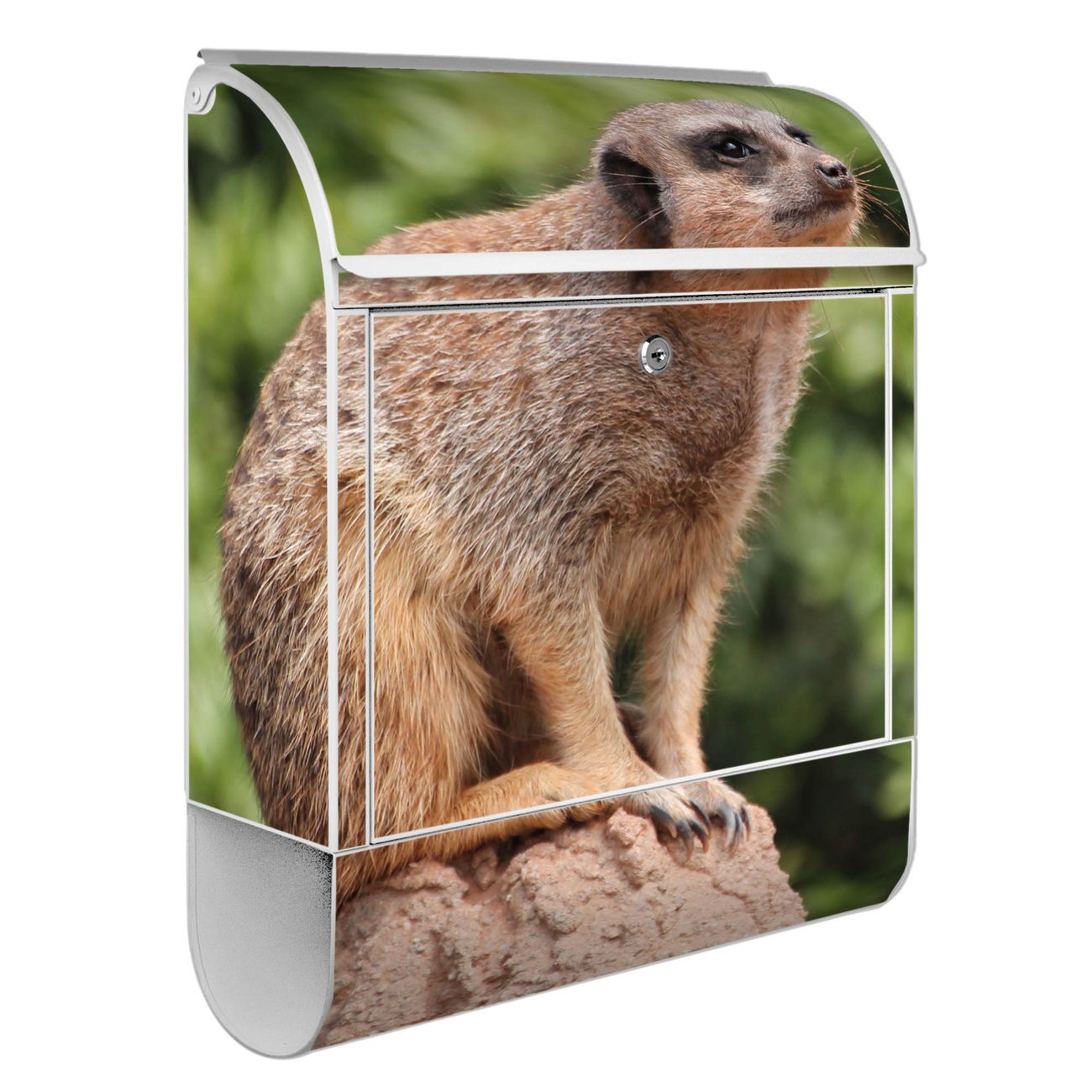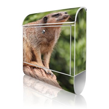Motiv Sitzendes Erdmännchen Nr. 10284 Material weiß pulverbeschichtetes Stahlblech Dekorfolie UV-beständig, wetterfest Gesamtgröße 38x47x13cm BxHxT Briefschlitz 33x3,5cm BxH Gewicht ca. 3,5 kg Zubehör Montagezubehör, 2 Schlüssel, Bohrschablone