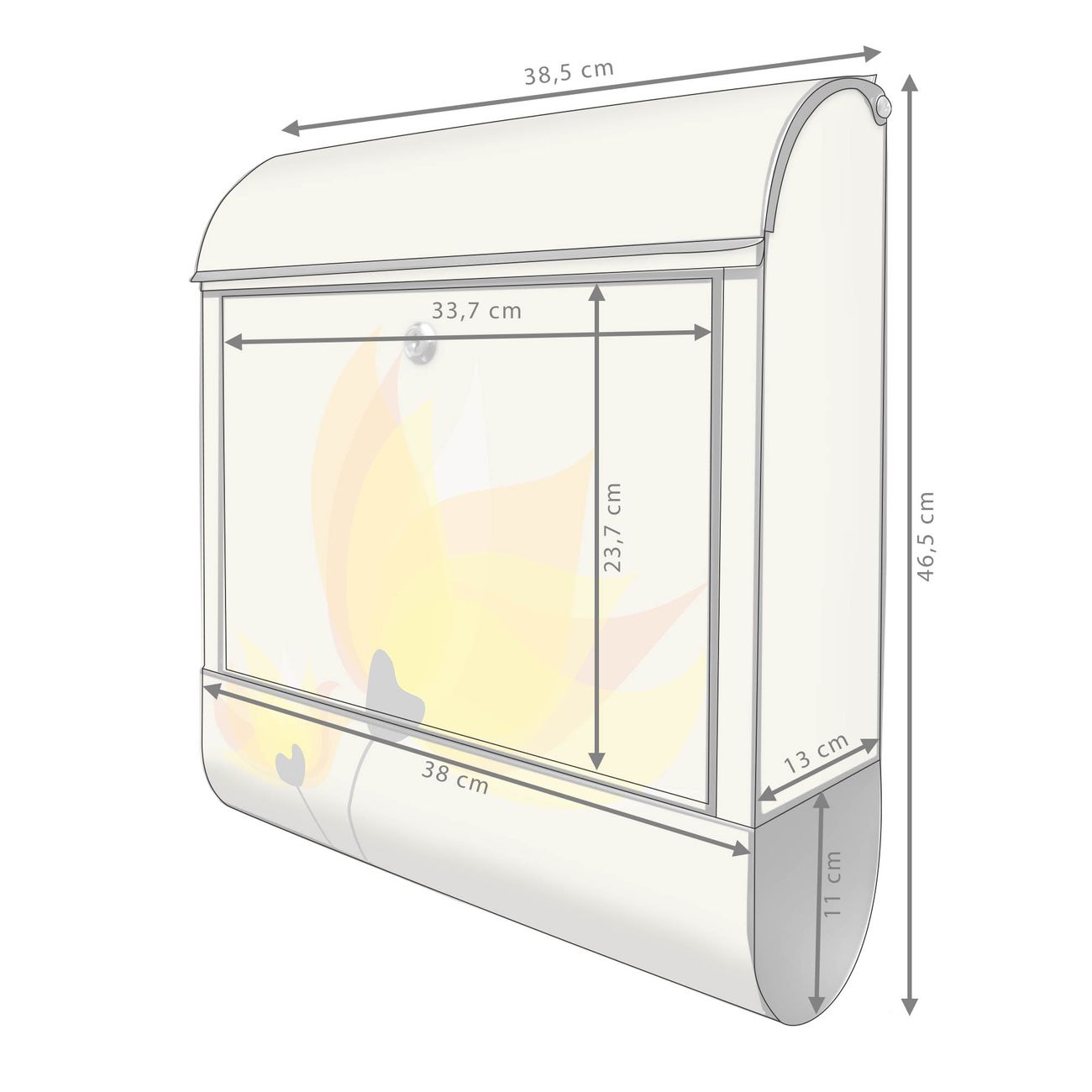 Motiv Sommerblüten Nr. 10384 Material: schwarz pulverbeschichtetes Stahlblech Dekorfolie: UV-beständig, wetterfest Gesamtgröße: 38x46x12,5cm BxHxT Briefschlitz: 33x3,5cm BxH Gewicht: ca. 3,4 kg Zubehör: Montagezubehör, 2 Schlüssel, Bohrschablone