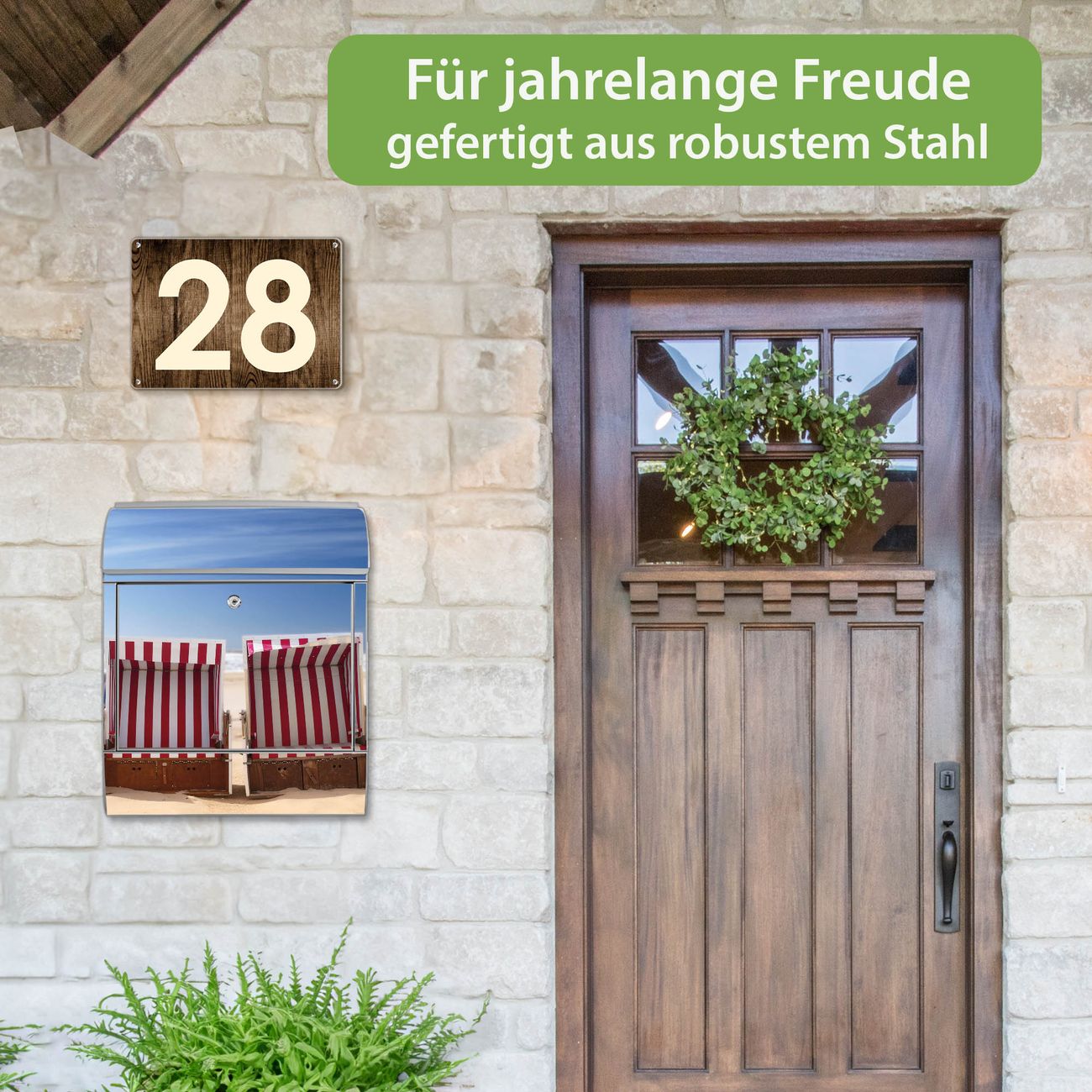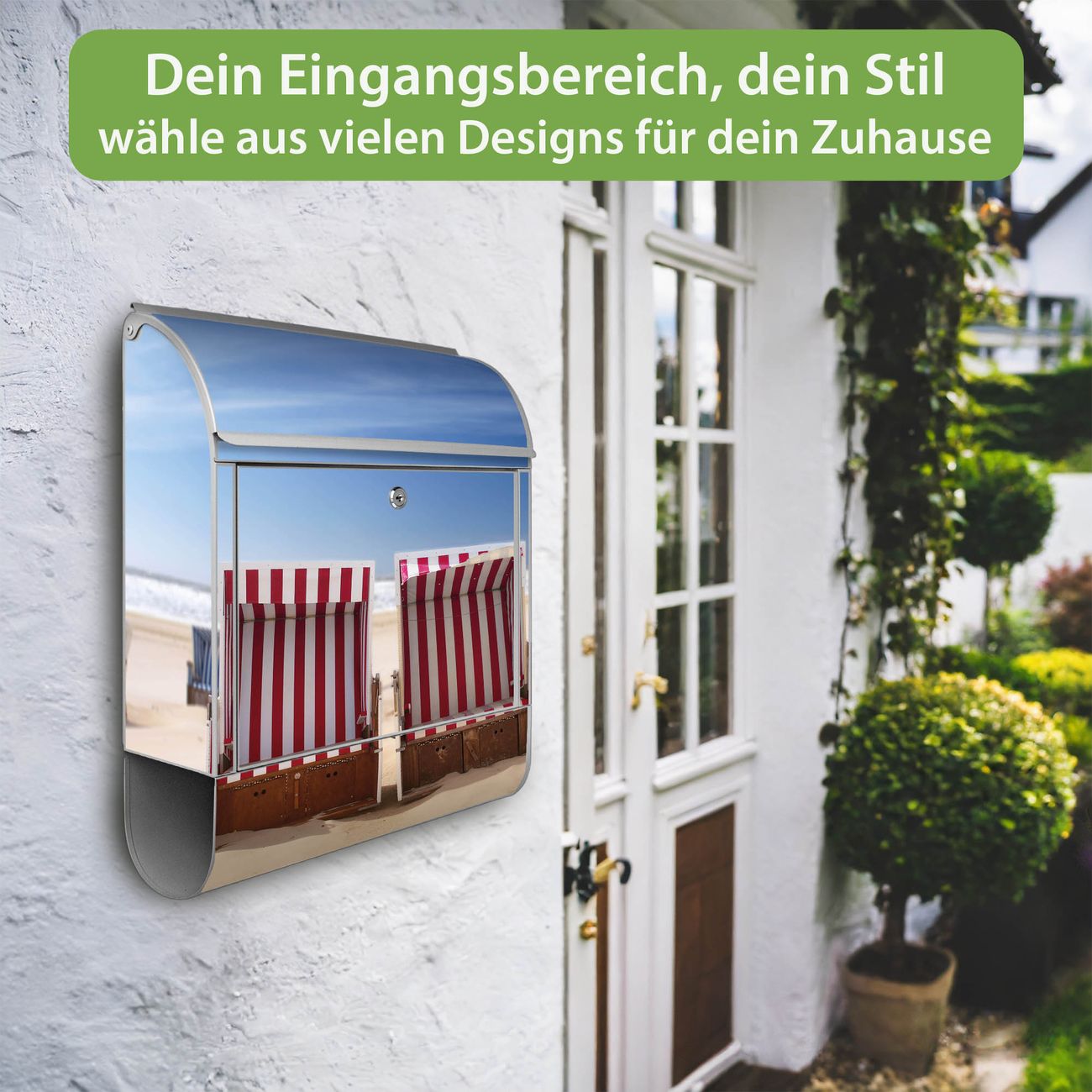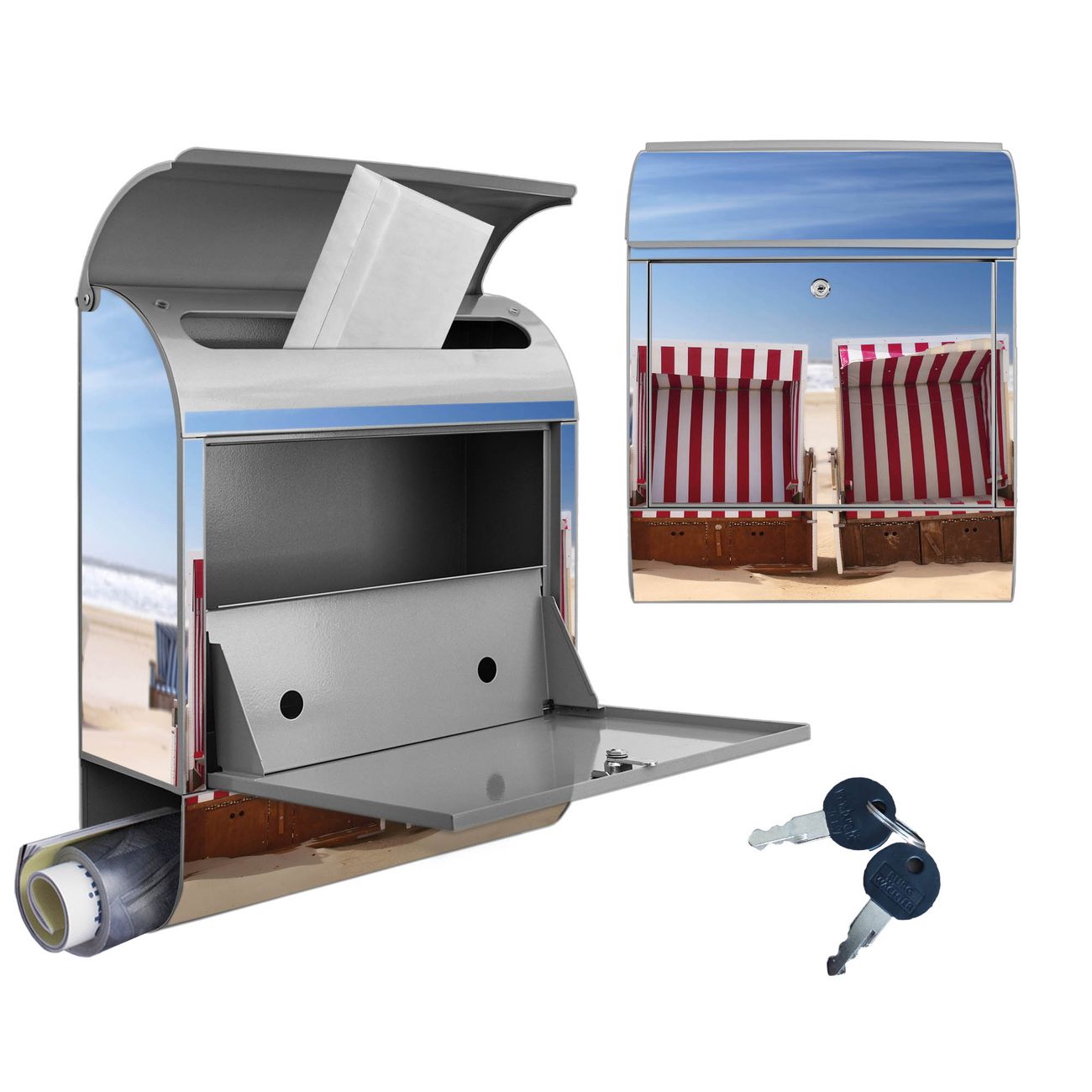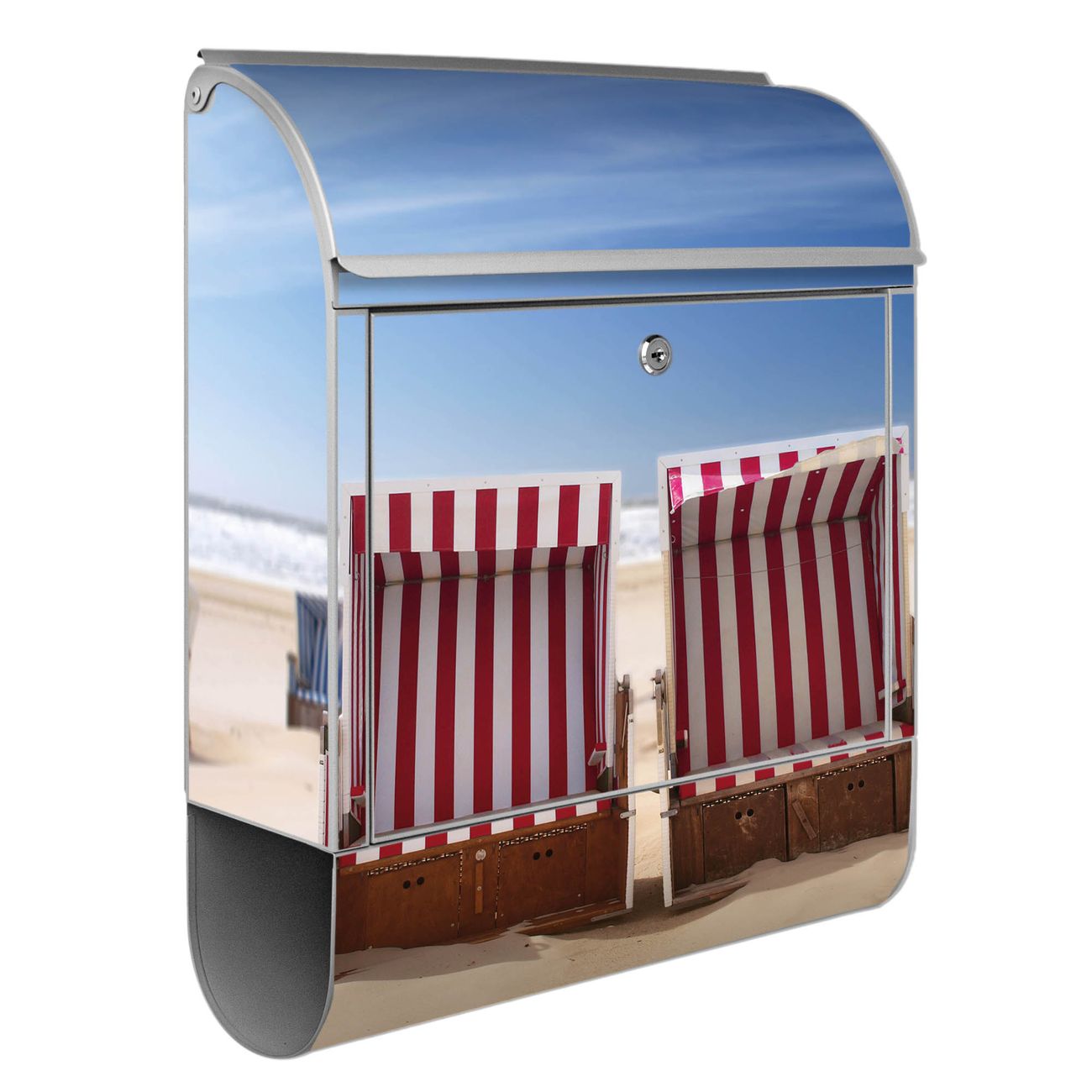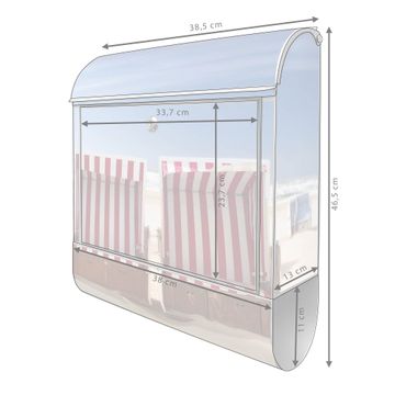 Motiv Strandkörbe Nr. 10218 Material silber pulverbeschichtetes Stahlblech Dekorfolie UV-beständig, wetterfest Gesamtgröße 38x47x13cm BxHxT Briefschlitz 33x3,5cm BxH Gewicht ca. 3,5 kg Zubehör Montagezubehör, 2 Schlüssel, Bohrschablone