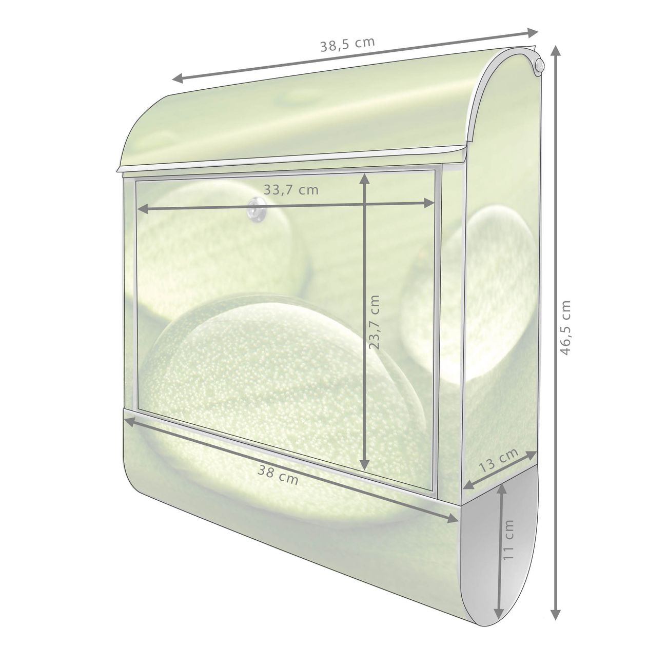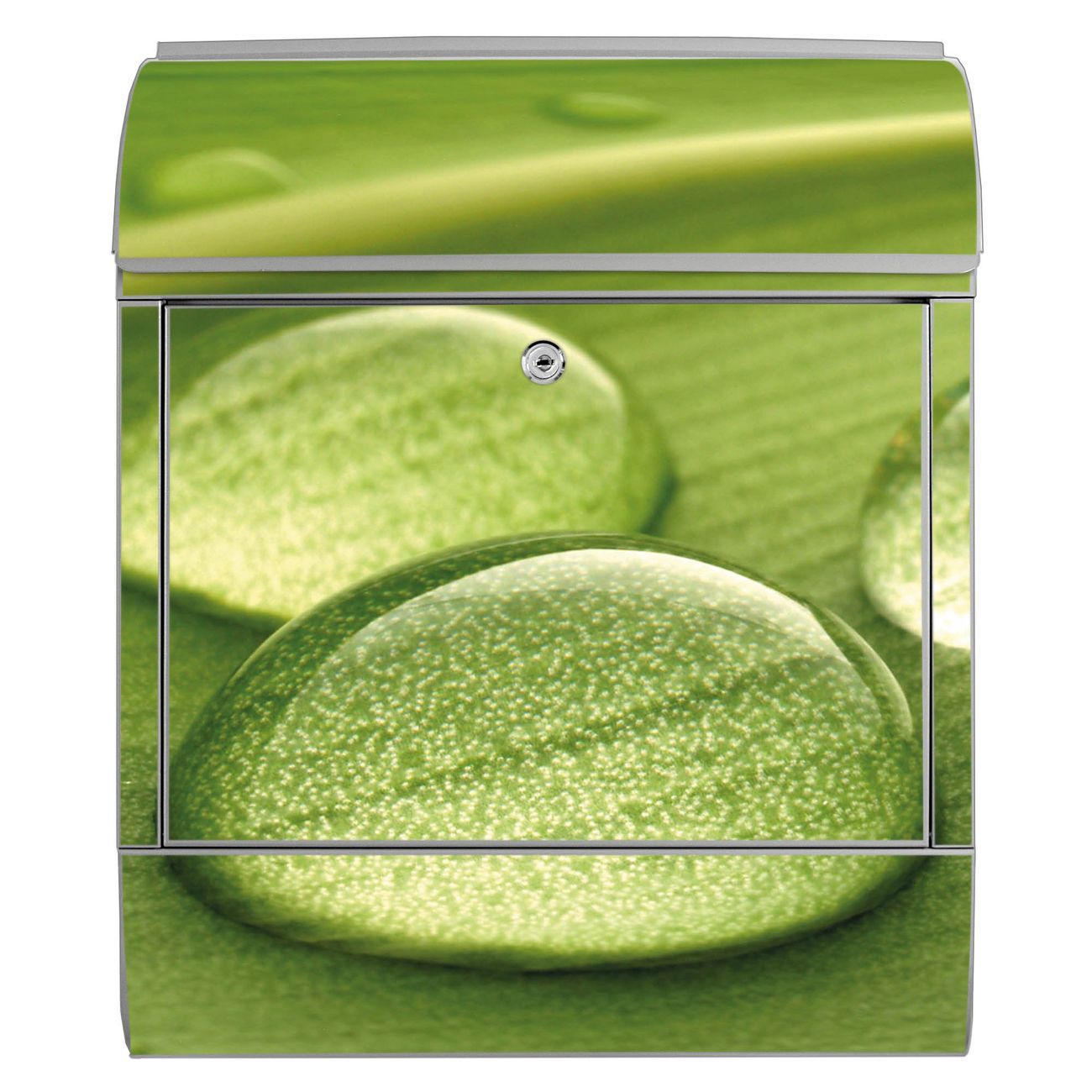 Motiv Tautropfen Nr. 10288 Material silber pulverbeschichtetes Stahlblech Dekorfolie UV-beständig, wetterfest Gesamtgröße 38x47x13cm BxHxT Briefschlitz 33x3,5cm BxH Gewicht ca. 3,5 kg Zubehör Montagezubehör, 2 Schlüssel, Bohrschablone