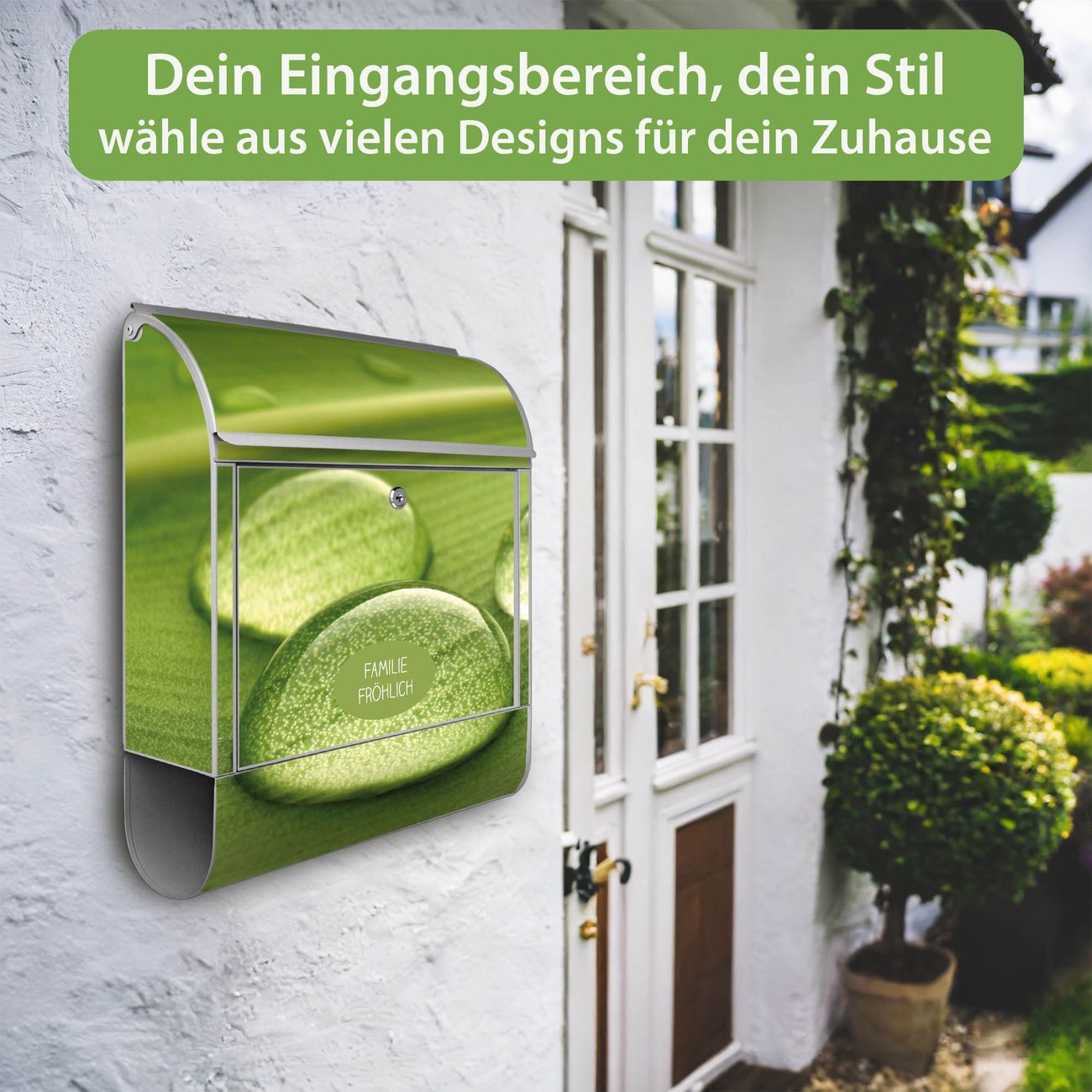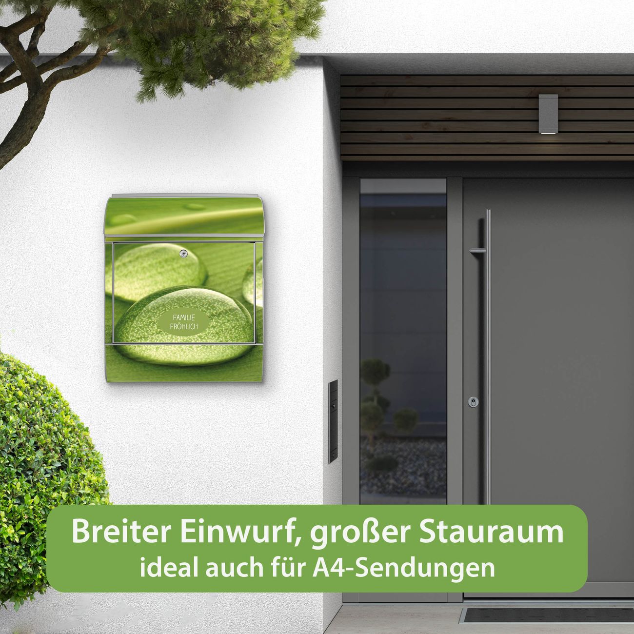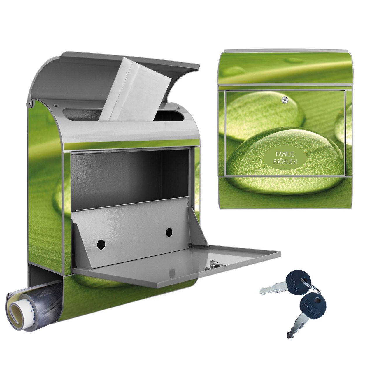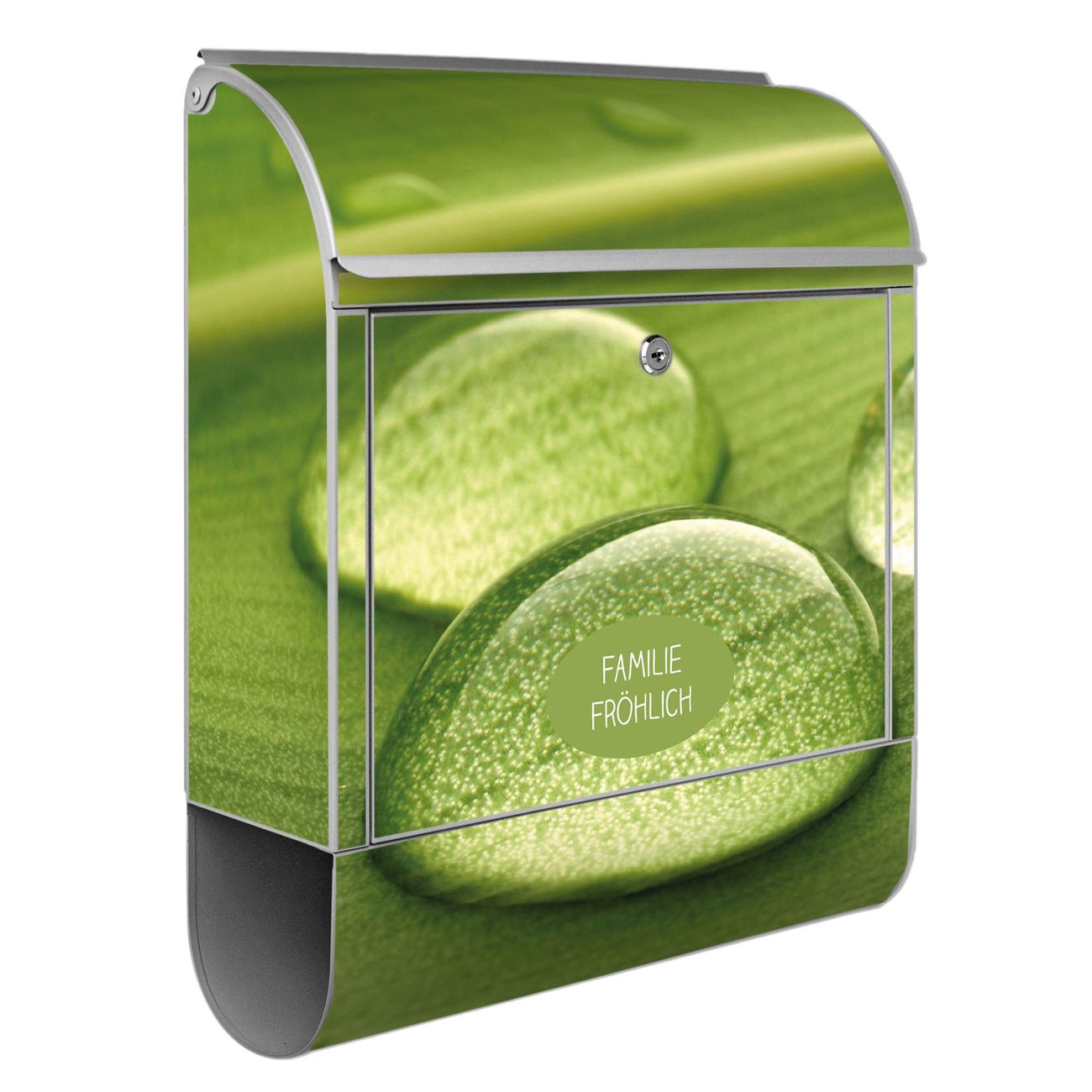 Motiv Tautropfen Nr. 10288 Material silber pulverbeschichtetes Stahlblech Dekorfolie UV-beständig, wetterfest Gesamtgröße 38x47x13cm BxHxT Briefschlitz 33x3,5cm BxH Gewicht ca. 3,5 kg Zubehör Montagezubehör, 2 Schlüssel, Bohrschablone