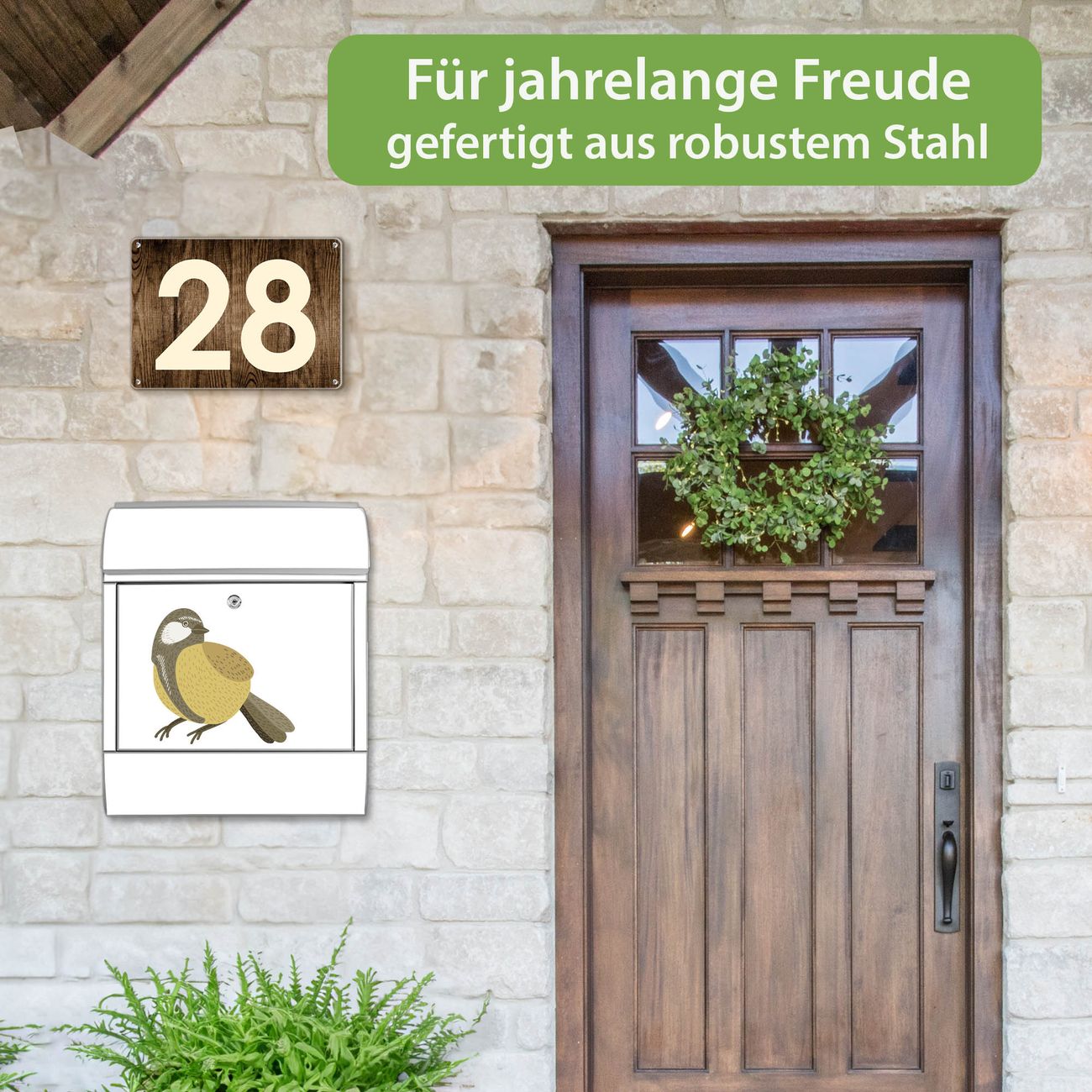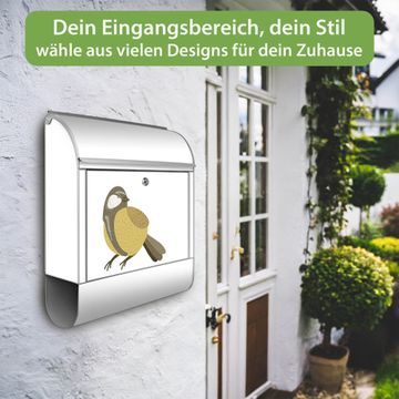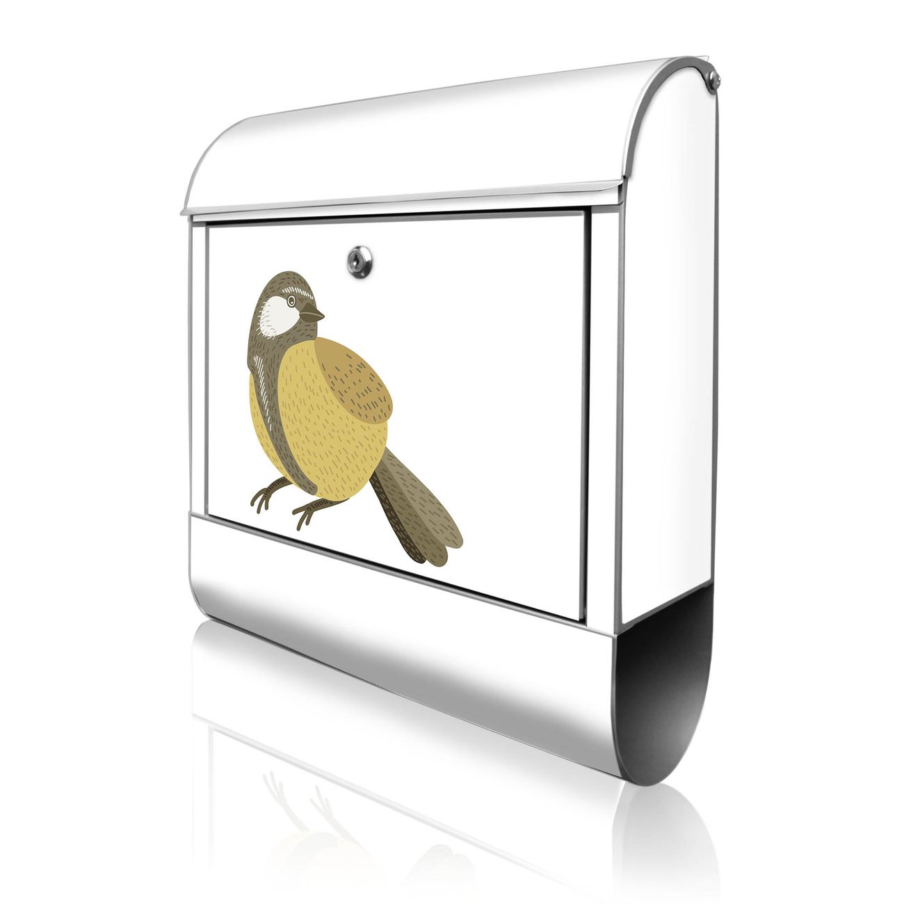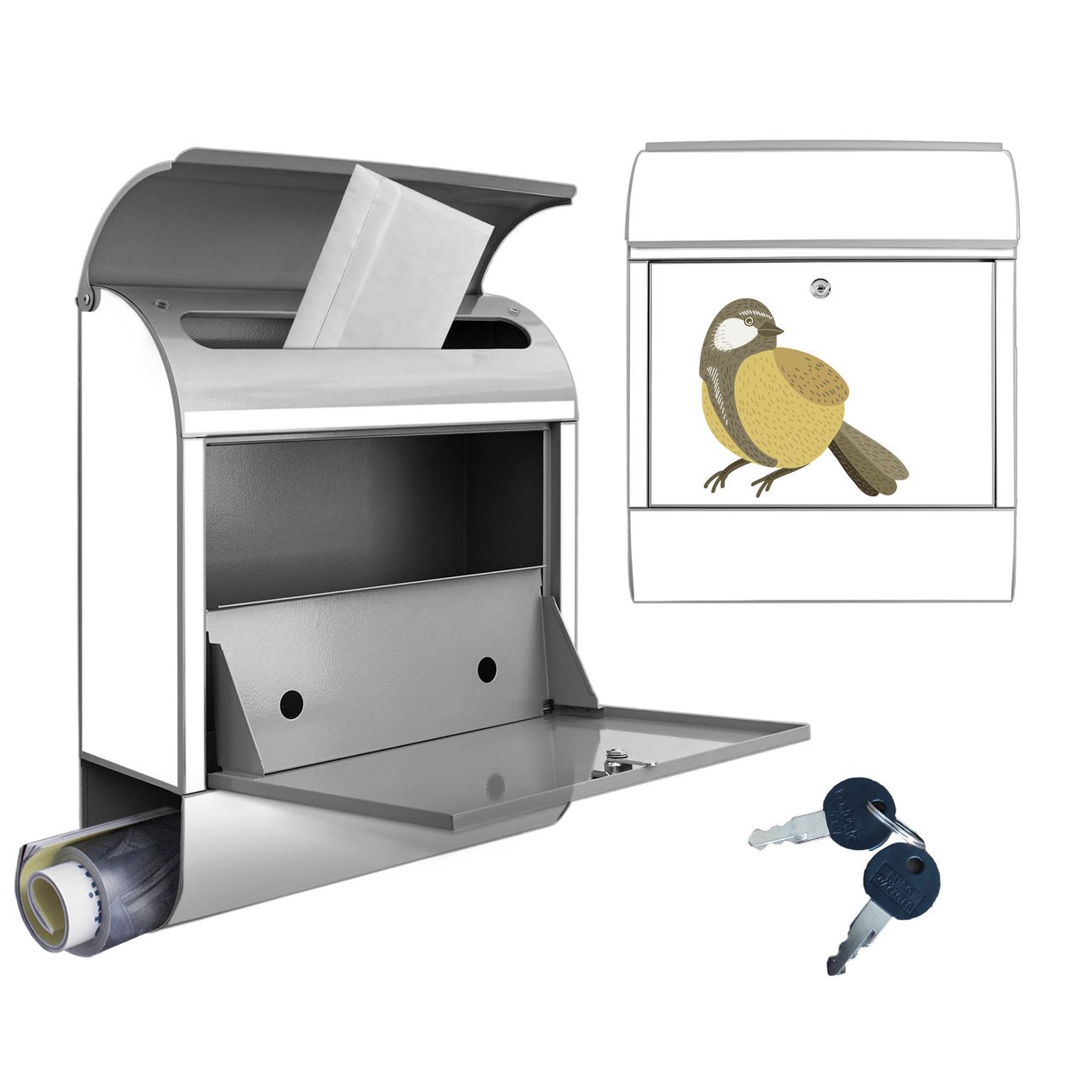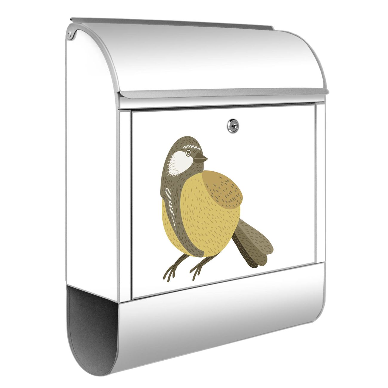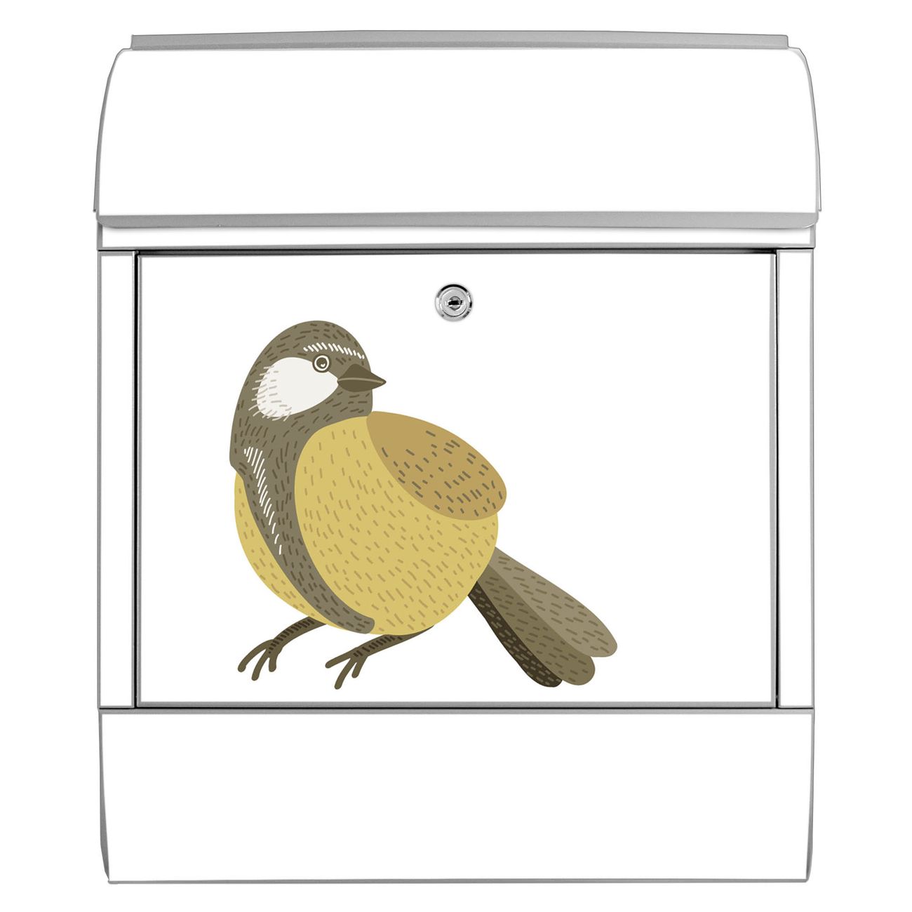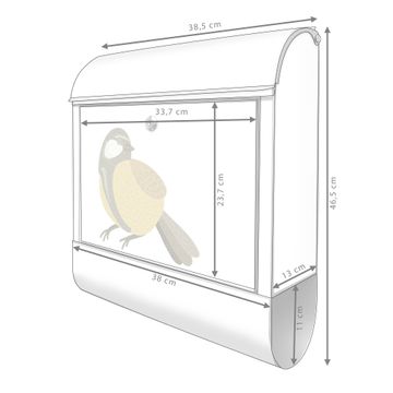 Motiv Vogel mit Sprechblase Nr. 10388 Material silber pulverbeschichtetes Stahlblech Dekorfolie UV-beständig, wetterfest Gesamtgröße 38x47x13cm BxHxT Briefschlitz 33x3,5cm BxH Gewicht ca. 3,5 kg Zubehör Montagezubehör, 2 Schlüssel, Bohrschablone