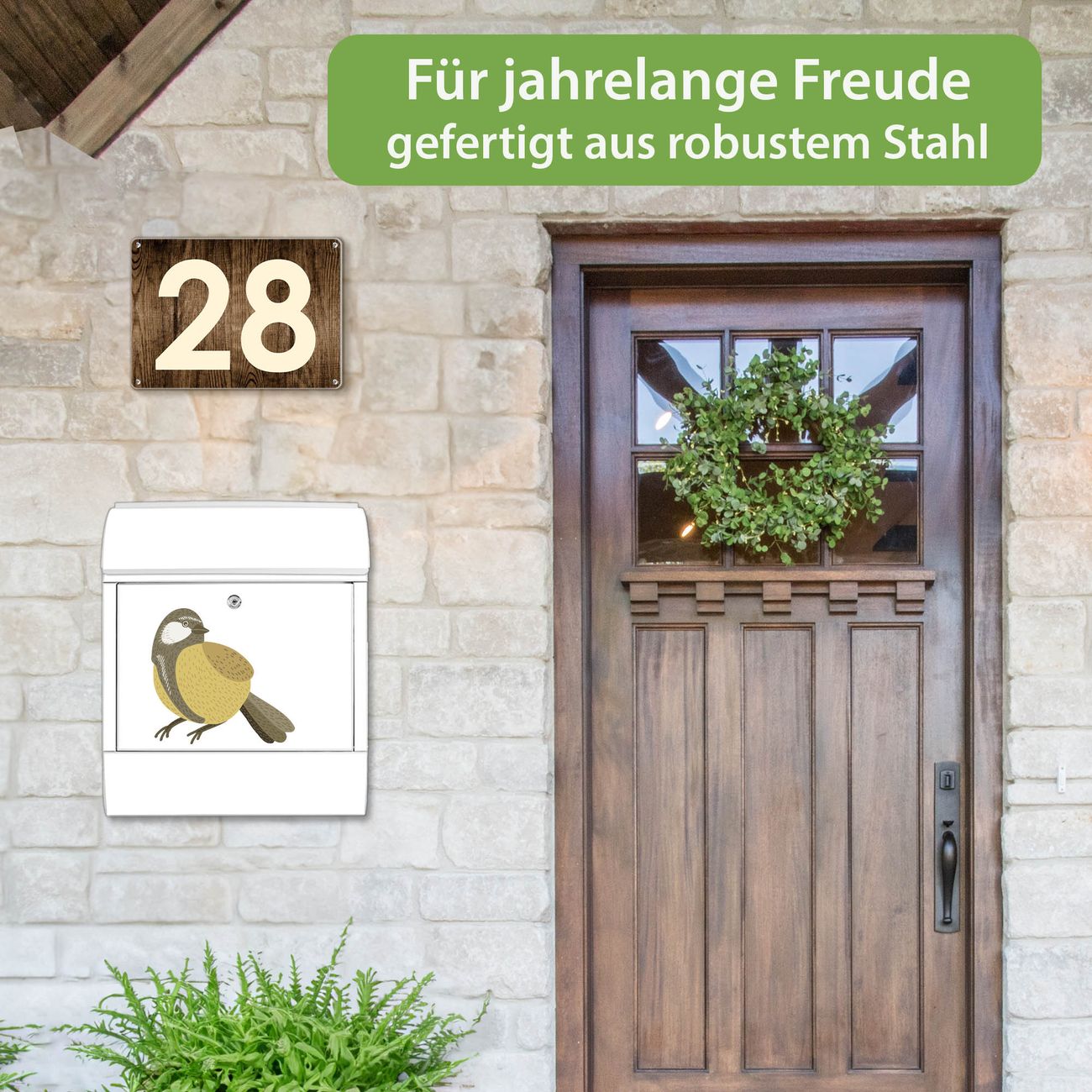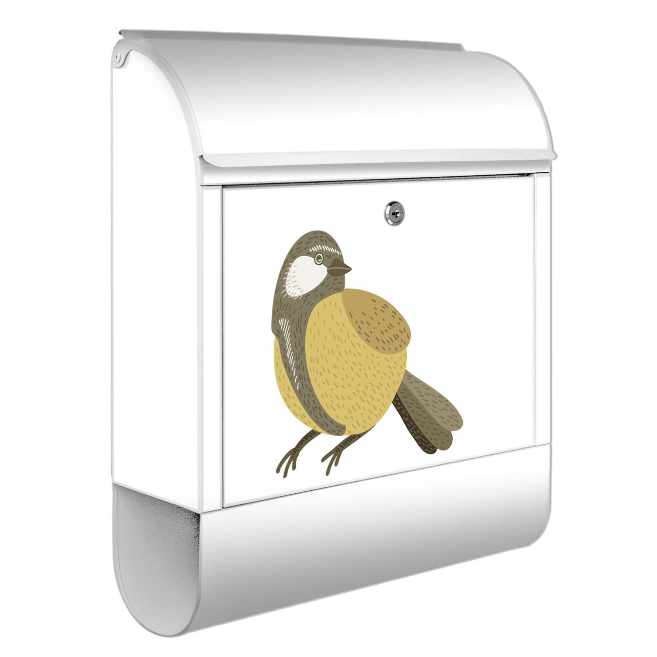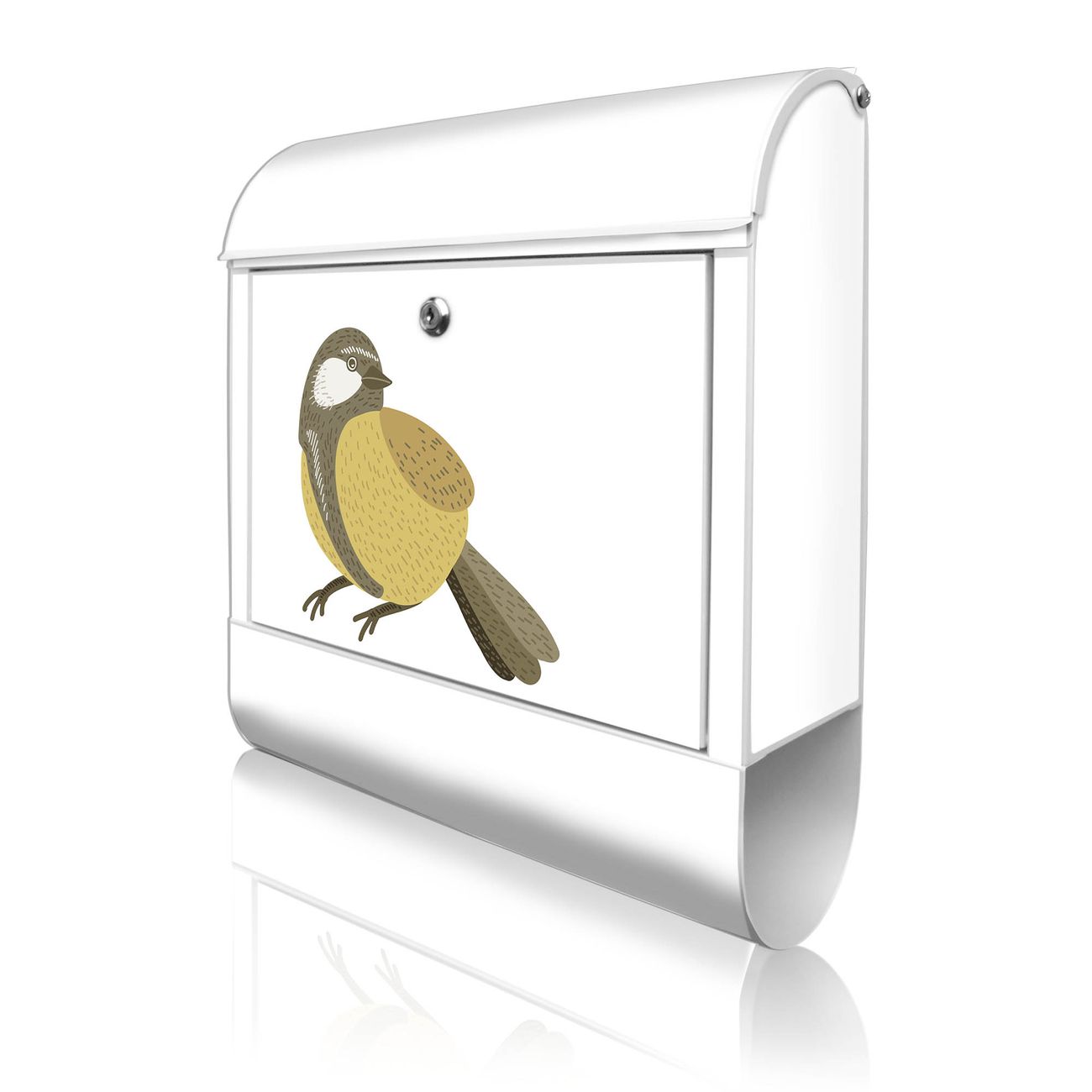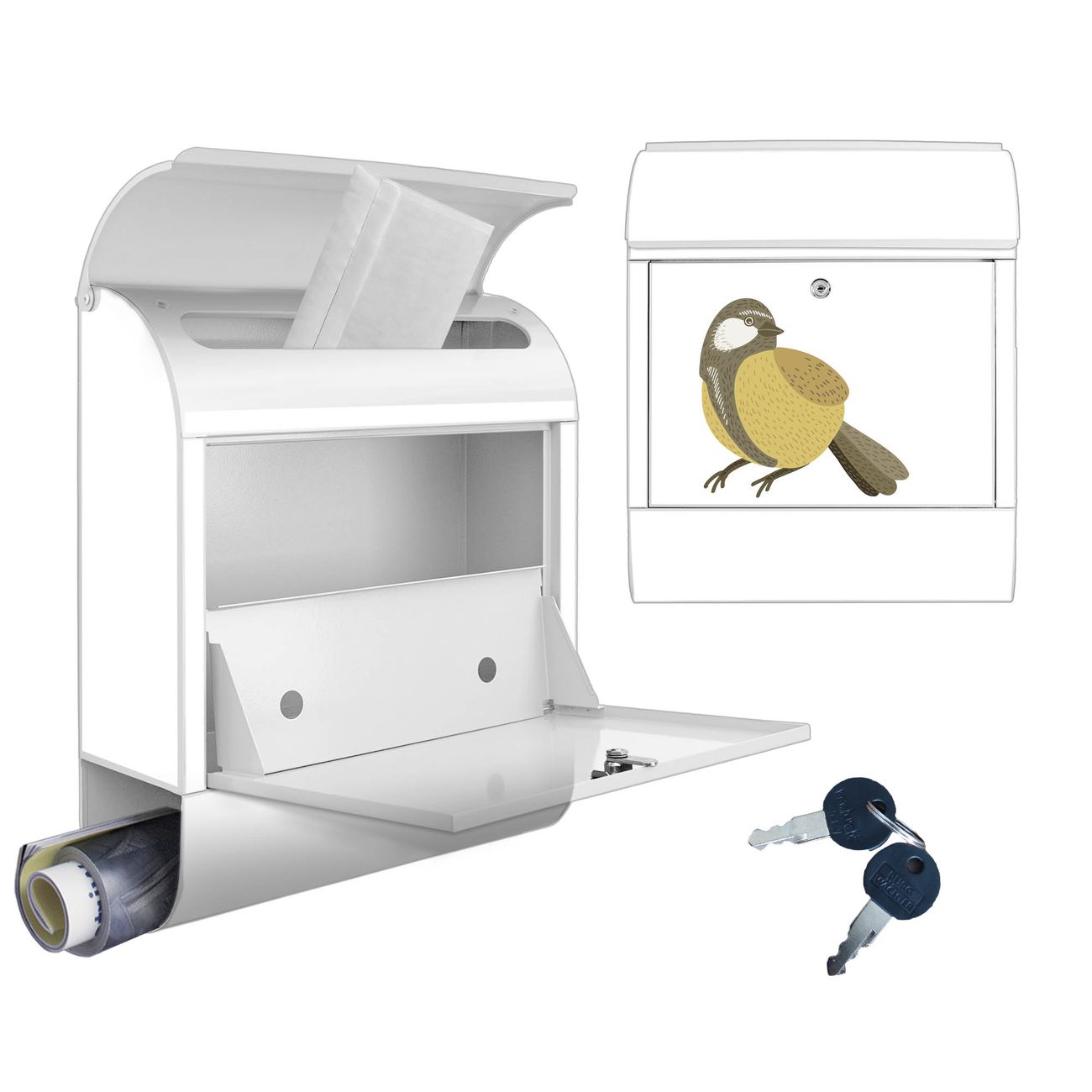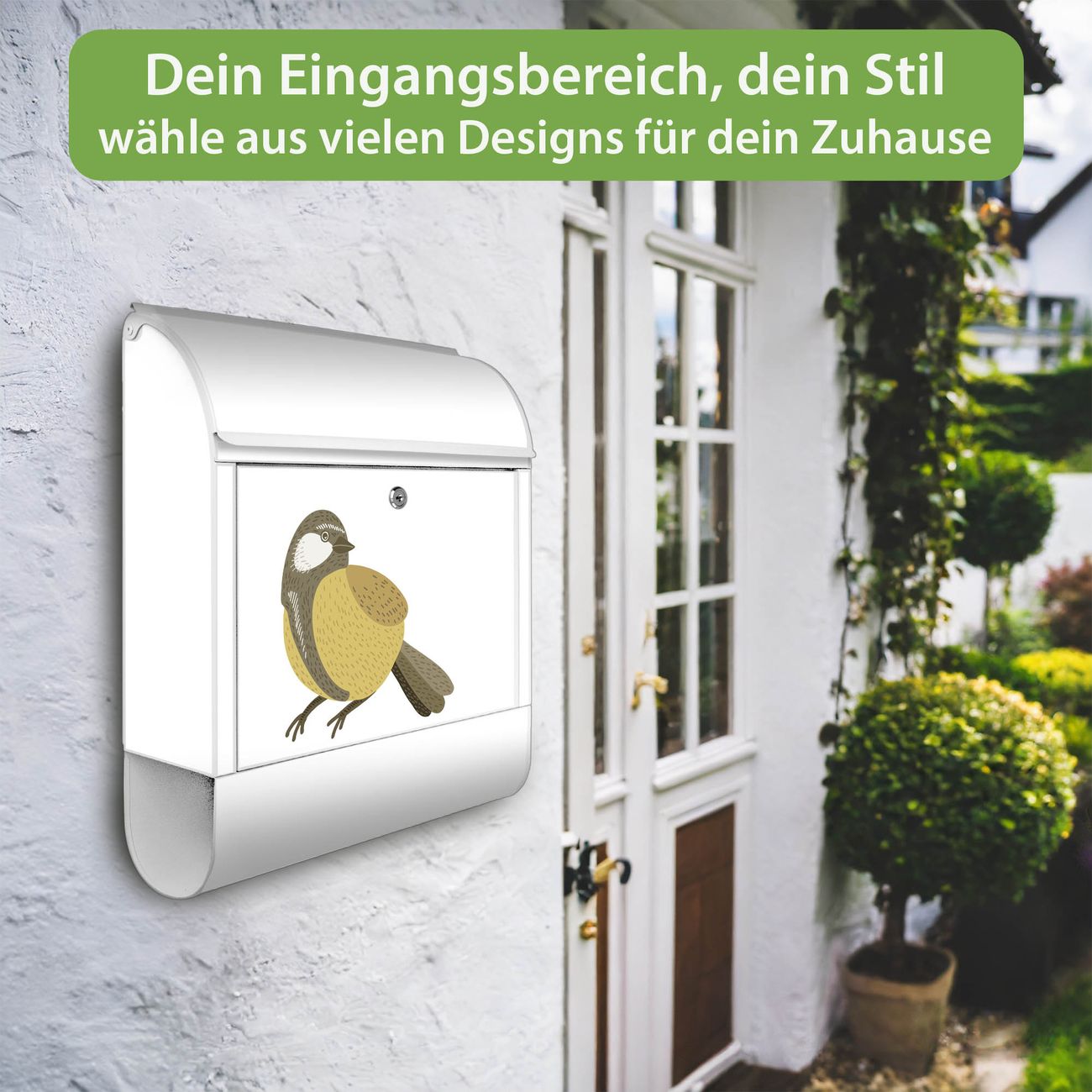 Motiv Vogel mit Sprechblase Nr. 10388 Material: weiß pulverbeschichtetes Stahlblech Dekorfolie: UV-beständig, wetterfest Gesamtgröße: 38x46x12,5cm BxHxT Briefschlitz: 33x3,5cm BxH Gewicht: ca. 3,4 kg Zubehör: Montagezubehör, 2 Schlüssel, Bohrschablone