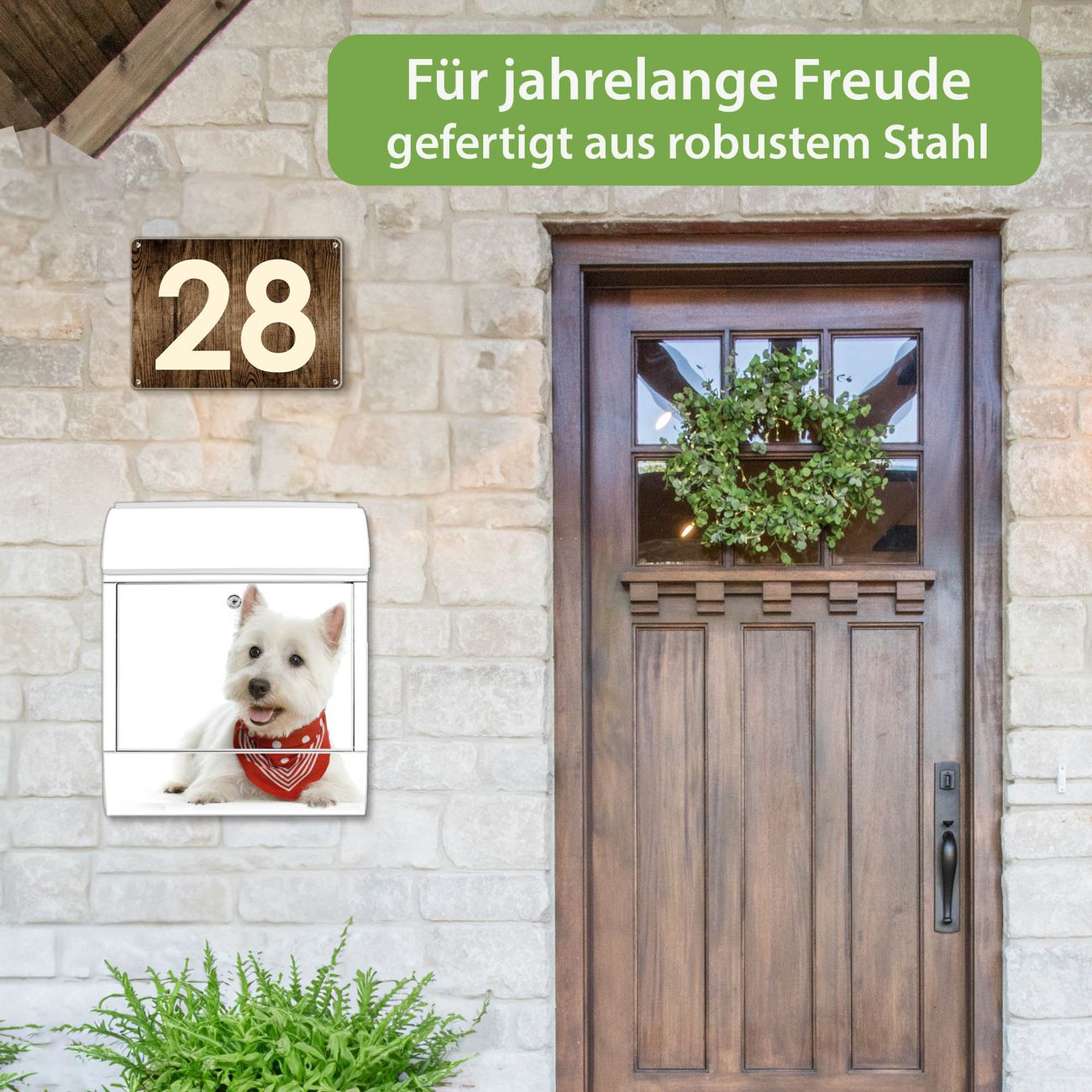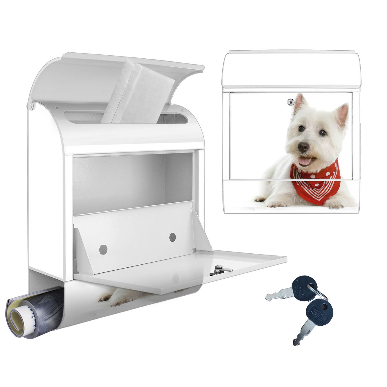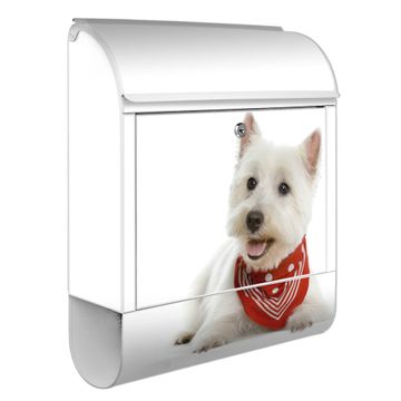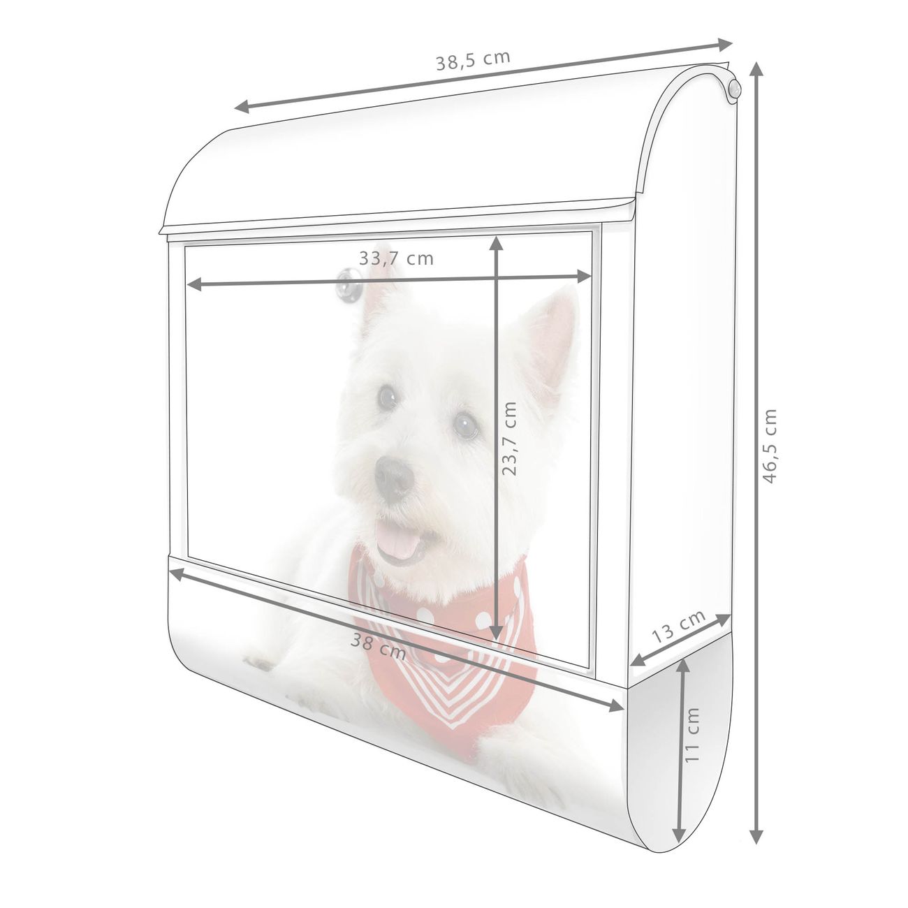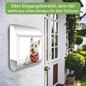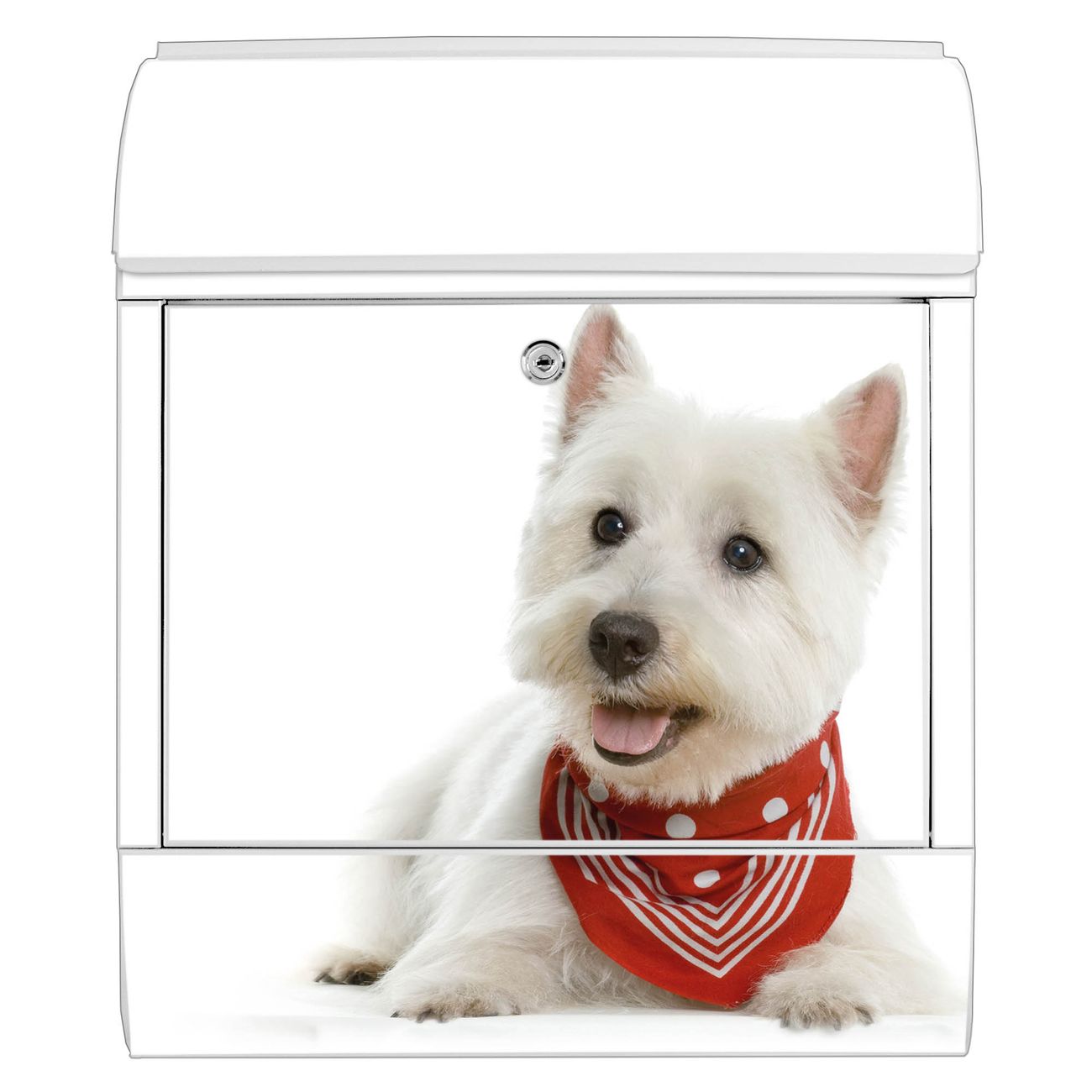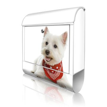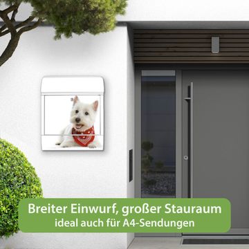 Motiv Westie Nr. 10192 Material weiß pulverbeschichtetes Stahlblech Dekorfolie UV-beständig, wetterfest Gesamtgröße 38x47x13cm BxHxT Briefschlitz 33x3,5cm BxH Gewicht ca. 3,5 kg Zubehör Montagezubehör, 2 Schlüssel, Bohrschablone