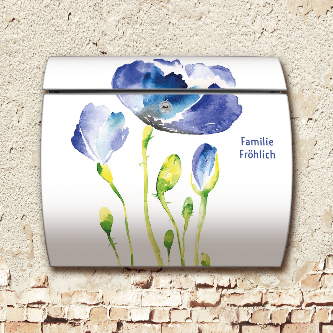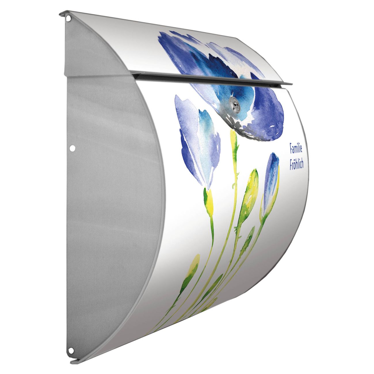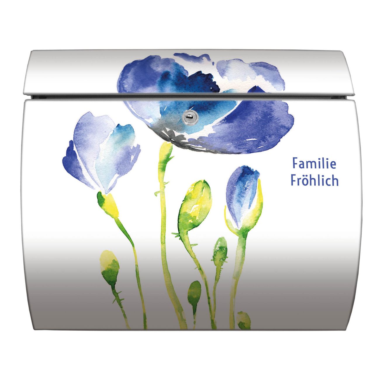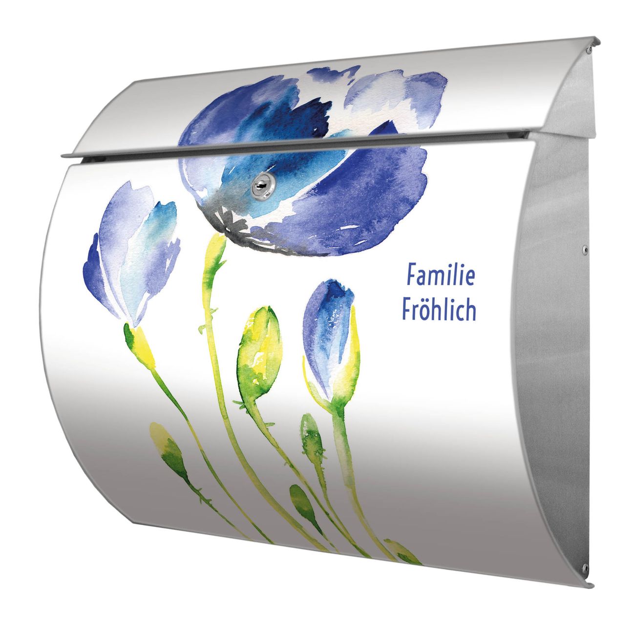 Motiv  Blauer Mohn Nr. 12933 Material  Edelstahl Dekorfolie  UV-beständig, wetterfest Gesamtgröße  37,6x33x10,6cm BxHxT Briefschlitz  32,5x3,5cm BxH Gewicht  ca. 2,30 kg Zubehör  inkl. Öffnungsstopp, Montagezubehör und 2 Schlüssel