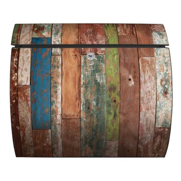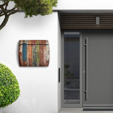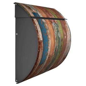 Motiv  Buntes Holz Nr. 12140 Material  vollflächig verzinktes und anthrazit lackiert Stahlblech Dekorfolie  UV-beständig, wetterfest Gesamtgröße  37,6x33x10,6cm BxHxT Briefschlitz  32,5x3,5cm BxH Gewicht  ca. 2,50 kg Zubehör  inkl. Öffnungsstopp, Montagezubehör und 2 Schlüssel