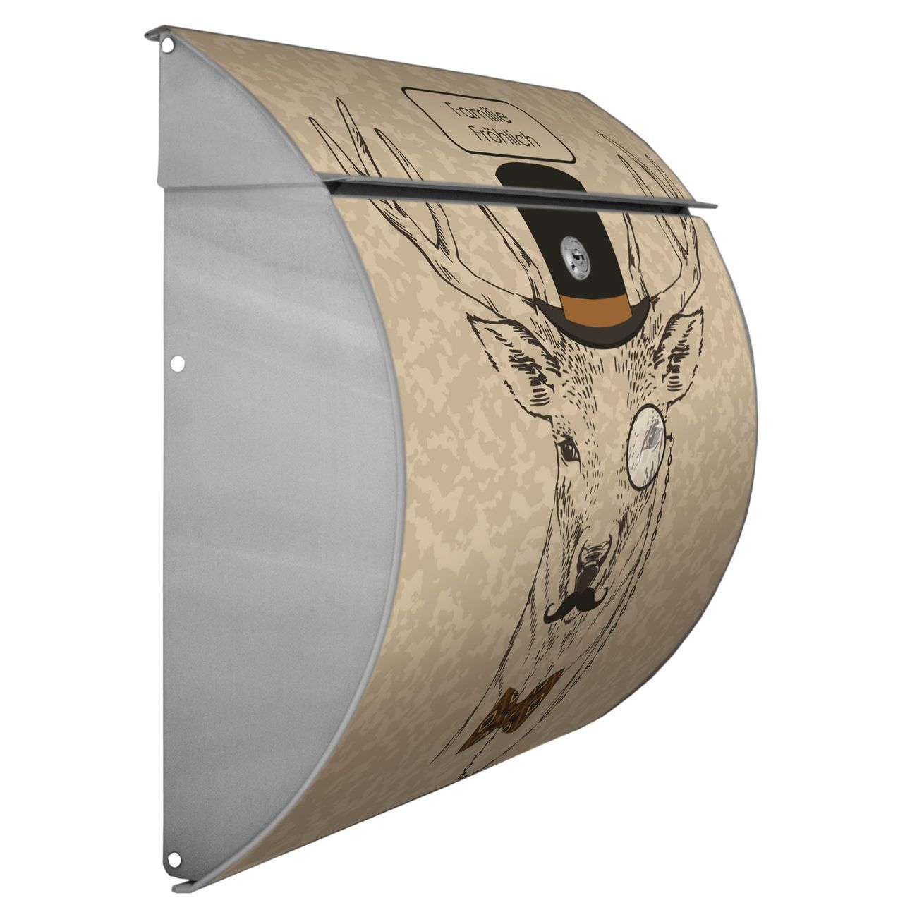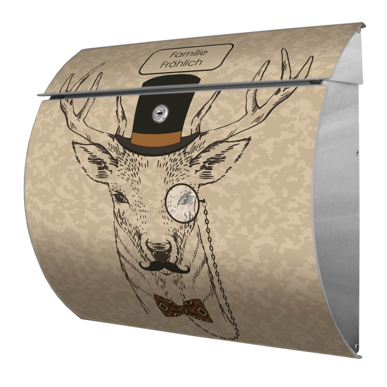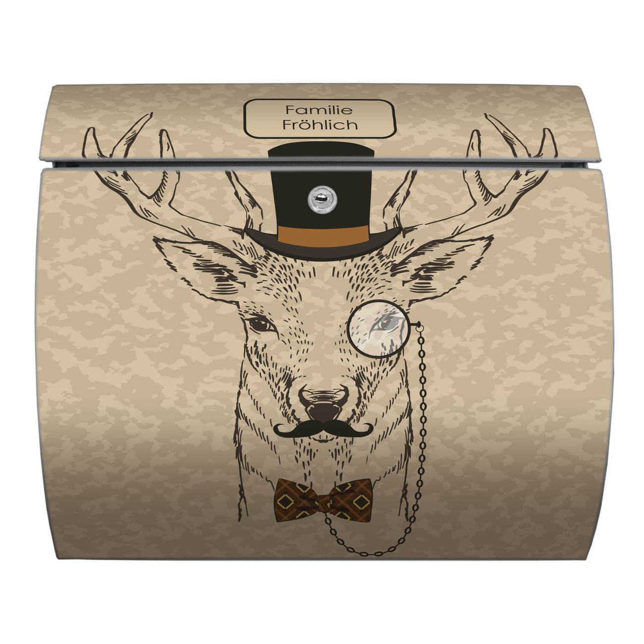 FUNKTION: DESIGN: Das Burg Wächter Modell Toscana mit Motiv Direktor Hirsch hat ein sehr ansprechendes und zeitloses Design und ist besonderes wetterfest. Heben Sie Sich von der tristen grauen Masse ab, ohne auf Funktionalität zu verzichten. Wir bieten Ihnen ebenfalls Namensschilder, bereits beschriftet oder frei zu beschriften, und verschiedene selbst gestaltete Bitte-Keine-Werbung-Aufkleber. DETAILS: Der Postkasten besteht aus vollflächig verzinktem Stahl welcher in Anthrazit oder Weiß lackiert wurde oder aus Edelstahl (je nach gewählter Variante). Das Motiv besteht aus einer wetter- und UV-festen Folie, die mit einem Schutzlaminat überzogen ist, durch die Ihren Briefkasten zusätzlich vor Kratzern geschützt ist und auf den Briefkasten kaschiert wurde. Sie erhalten zu Ihrem neuen Design Briefkasten 2 Schlüssel sowie das passende Montagematerial. BANJADO: Ihr Briefkasten wird von Burg Wächter in Deutschland gefertigt und in unserer kleinen Manufaktur von Hand veredelt. Die Motivfolie ist lösungsmittelfrei und schutzlaminiert, dies sorgt für einen langen Halt. Wir legen großen Wert auf die Verbindung von Funktionalität und Design. Sie erhalten besondere Handarbeit aus Sachsen und Made in Germany.