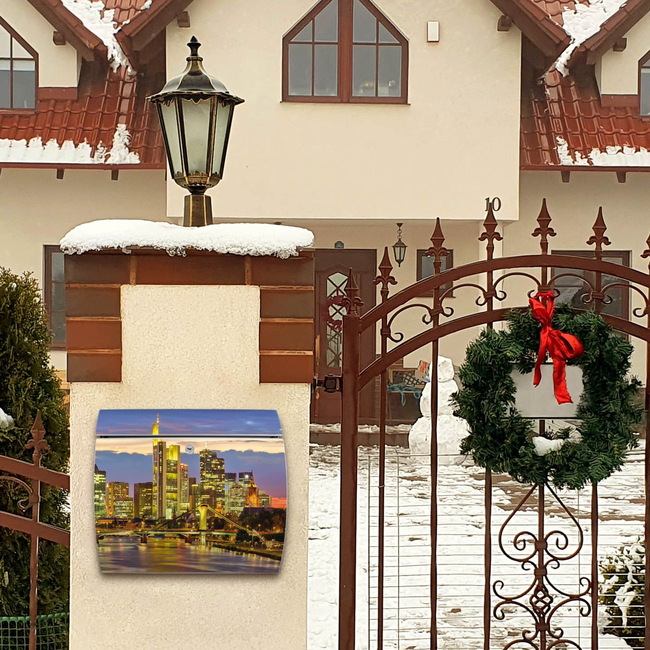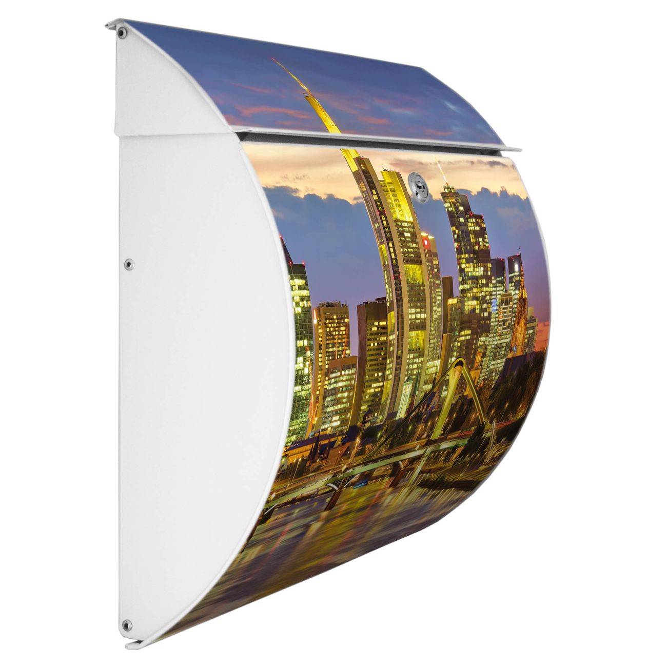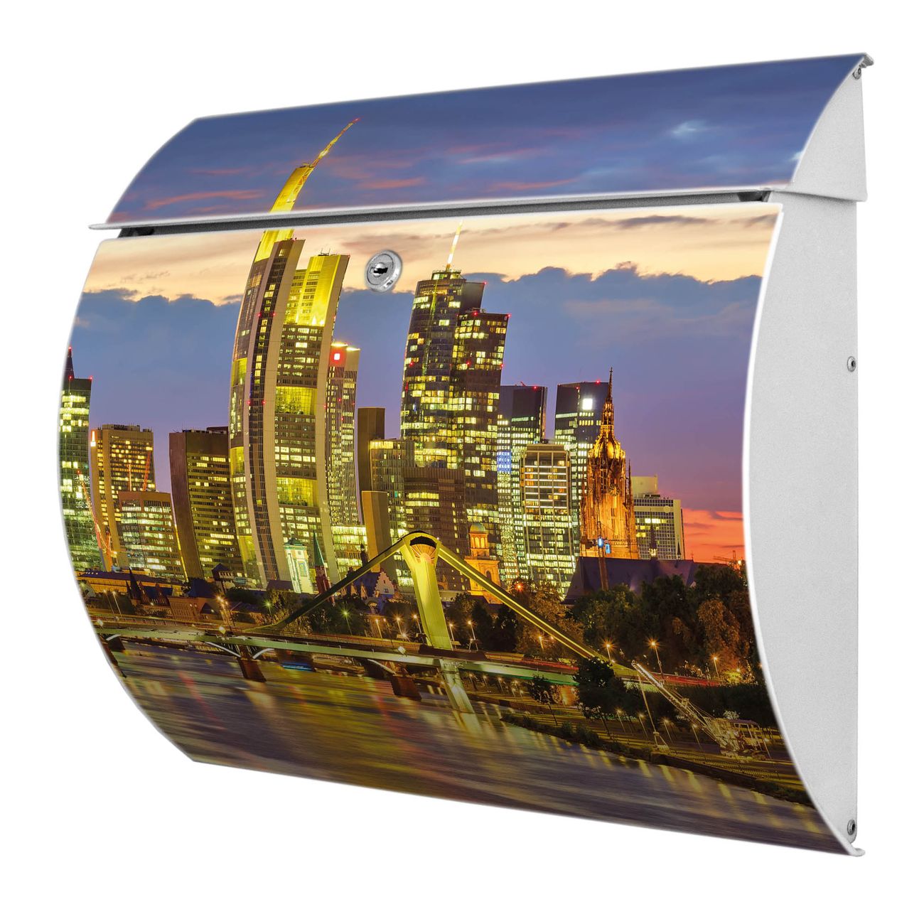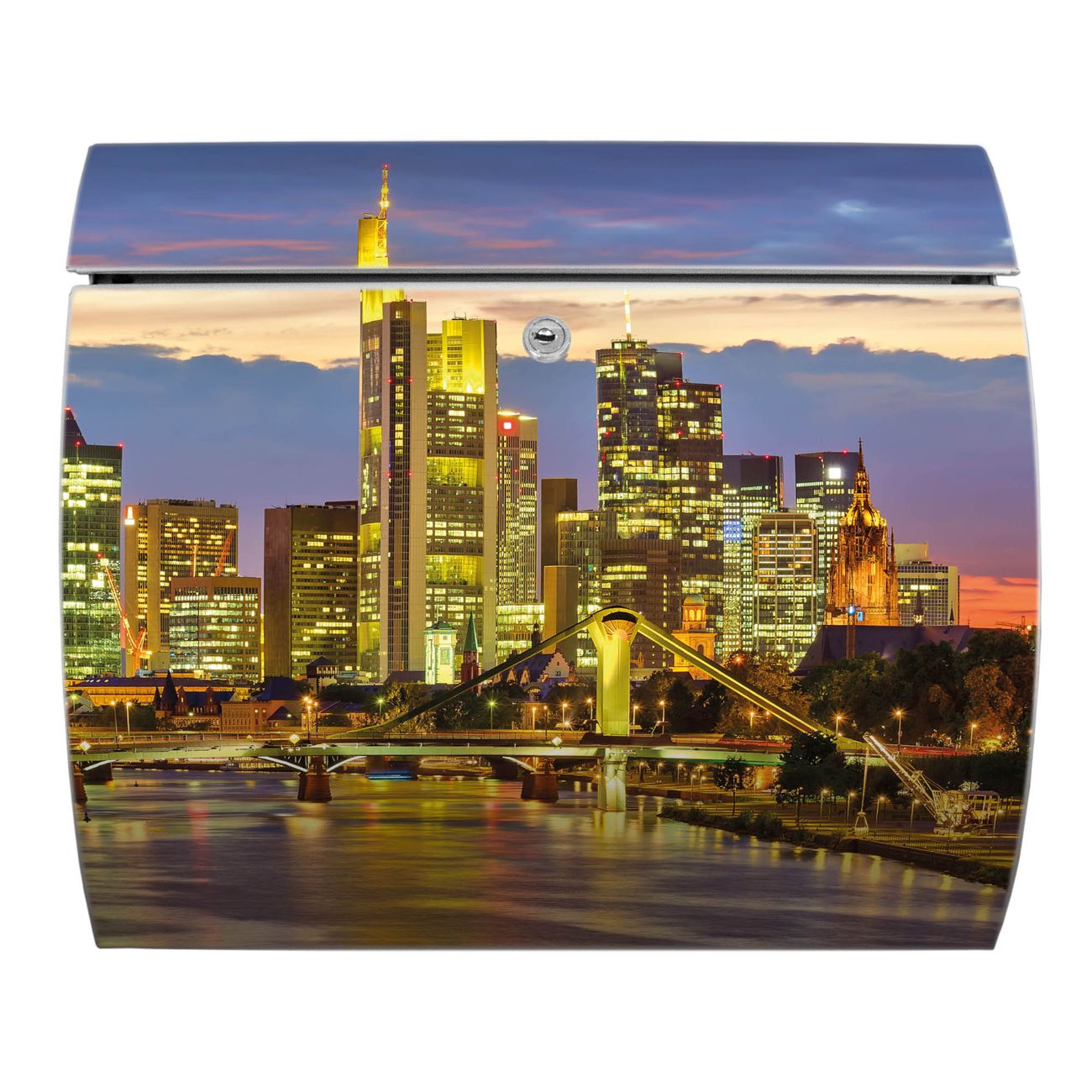 Motiv  Frankfurt Main Nr. 12406 Material  vollflächig verzinktes und weiß lackiert Stahlblech Dekorfolie  UV-beständig, wetterfest Gesamtgröße  37,6x33x10,6cm BxHxT Briefschlitz  32,5x3,5cm BxH Gewicht  ca. 2,50 kg Zubehör  inkl. Öffnungsstopp, Montagezubehör und 2 Schlüssel