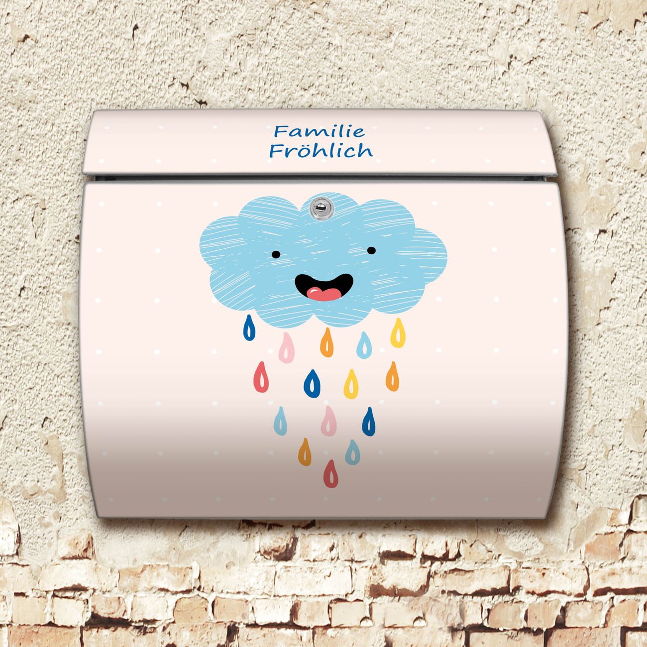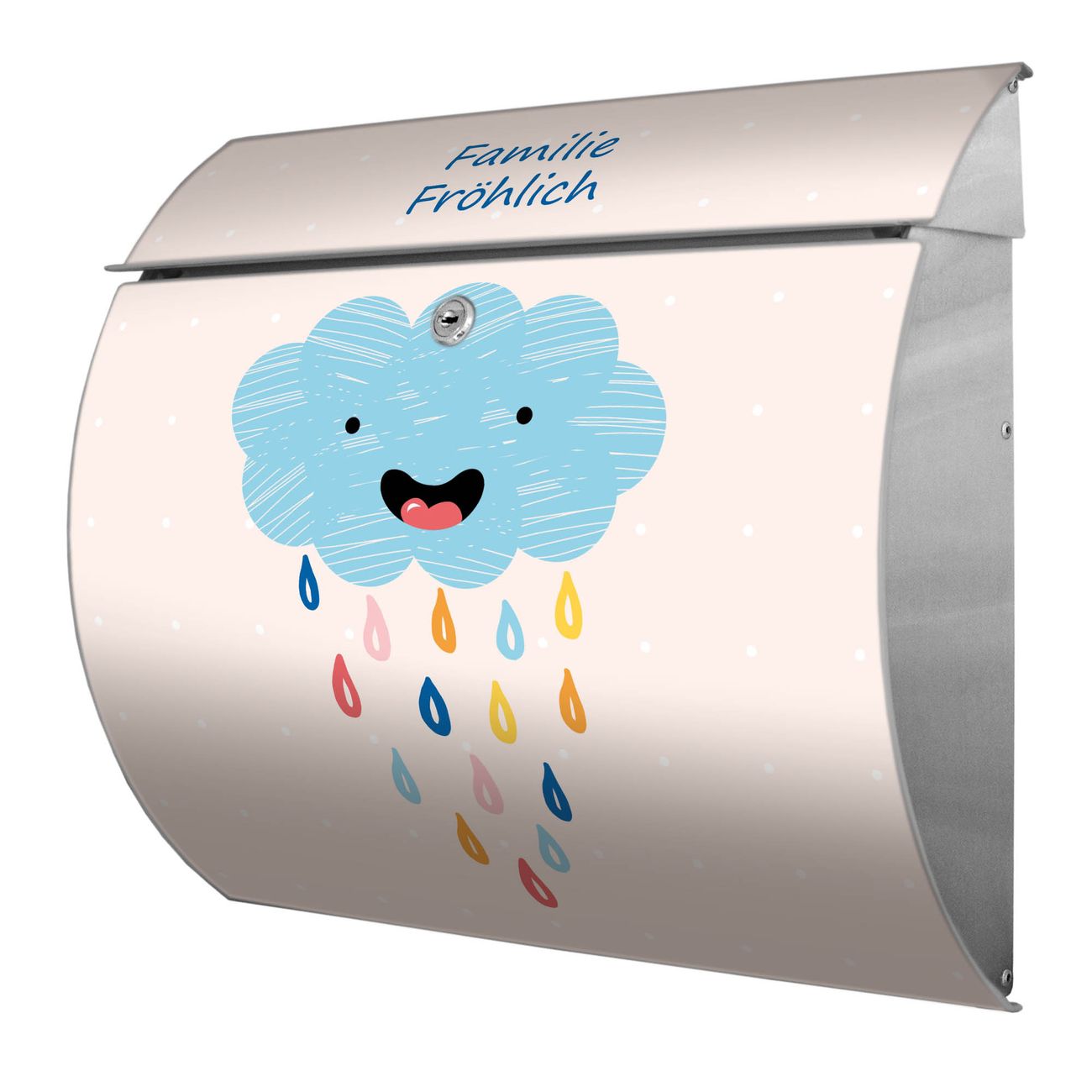 FUNKTION: DESIGN: Das Burg Wächter Modell Toscana mit Motiv glückliche Regenwolke hat ein sehr ansprechendes und zeitloses Design und ist besonderes wetterfest. Heben Sie Sich von der tristen grauen Masse ab, ohne auf Funktionalität zu verzichten. Wir bieten Ihnen ebenfalls Namensschilder, bereits beschriftet oder frei zu beschriften, und verschiedene selbst gestaltete Bitte-Keine-Werbung-Aufkleber. DETAILS: Der Postkasten besteht aus vollflächig verzinktem Stahl welcher in Anthrazit oder Weiß lackiert wurde oder aus Edelstahl (je nach gewählter Variante). Das Motiv besteht aus einer wetter- und UV-festen Folie, die mit einem Schutzlaminat überzogen ist, durch die Ihren Briefkasten zusätzlich vor Kratzern geschützt ist und auf den Briefkasten kaschiert wurde. Sie erhalten zu Ihrem neuen Design Briefkasten 2 Schlüssel sowie das passende Montagematerial. BANJADO: Ihr Briefkasten wird von Burg Wächter in Deutschland gefertigt und in unserer kleinen Manufaktur von Hand veredelt. Die Motivfolie ist lösungsmittelfrei und schutzlaminiert, dies sorgt für einen langen Halt. Wir legen großen Wert auf die Verbindung von Funktionalität und Design. Sie erhalten besondere Handarbeit aus Sachsen und Made in Germany.